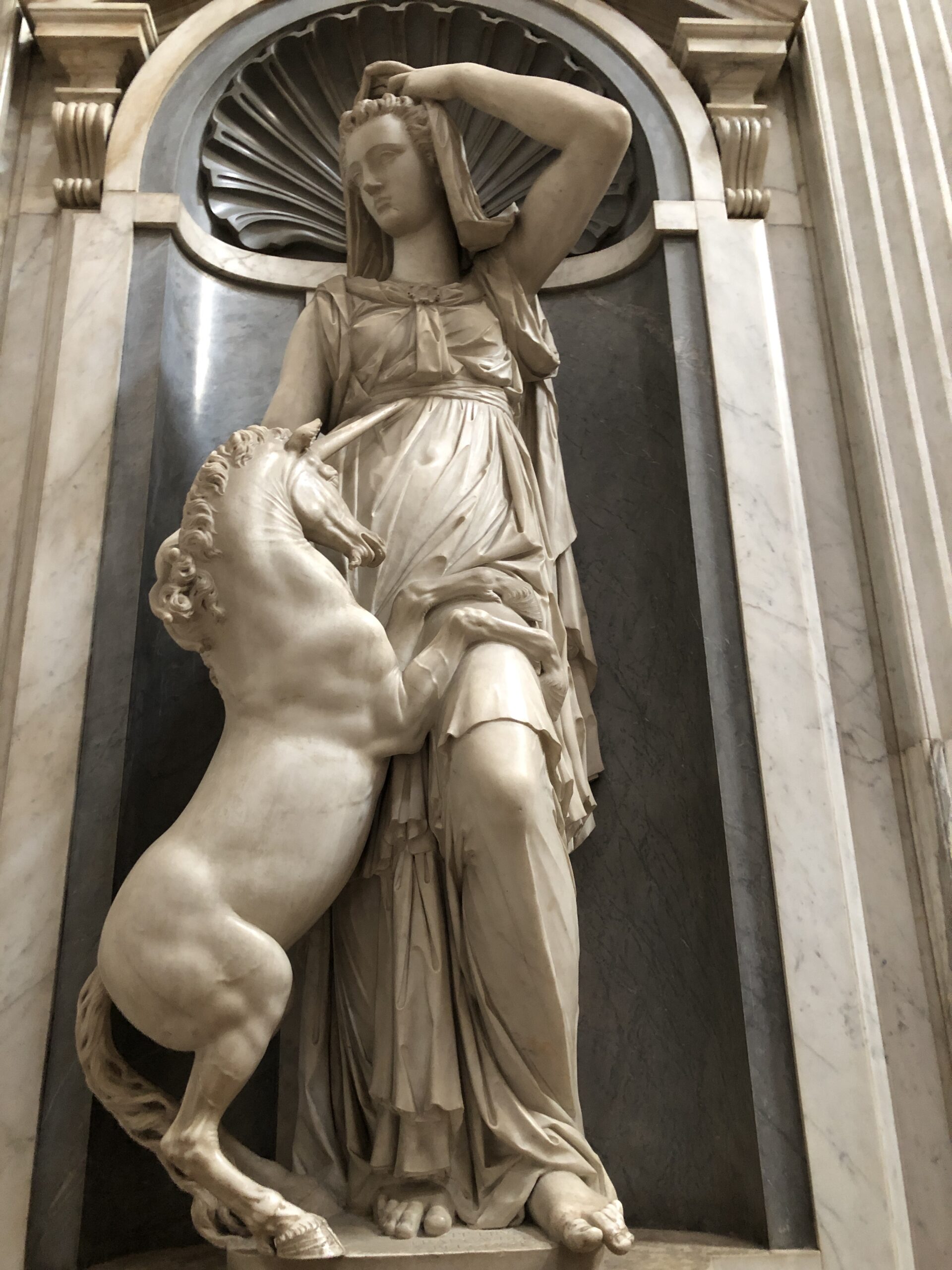 Ed è proprio questa la scena rappresentata dagli artisti. La giovane vergine, come per magia, sarebbe riuscita a frenare gli istinti più irrequieti dell’animale.