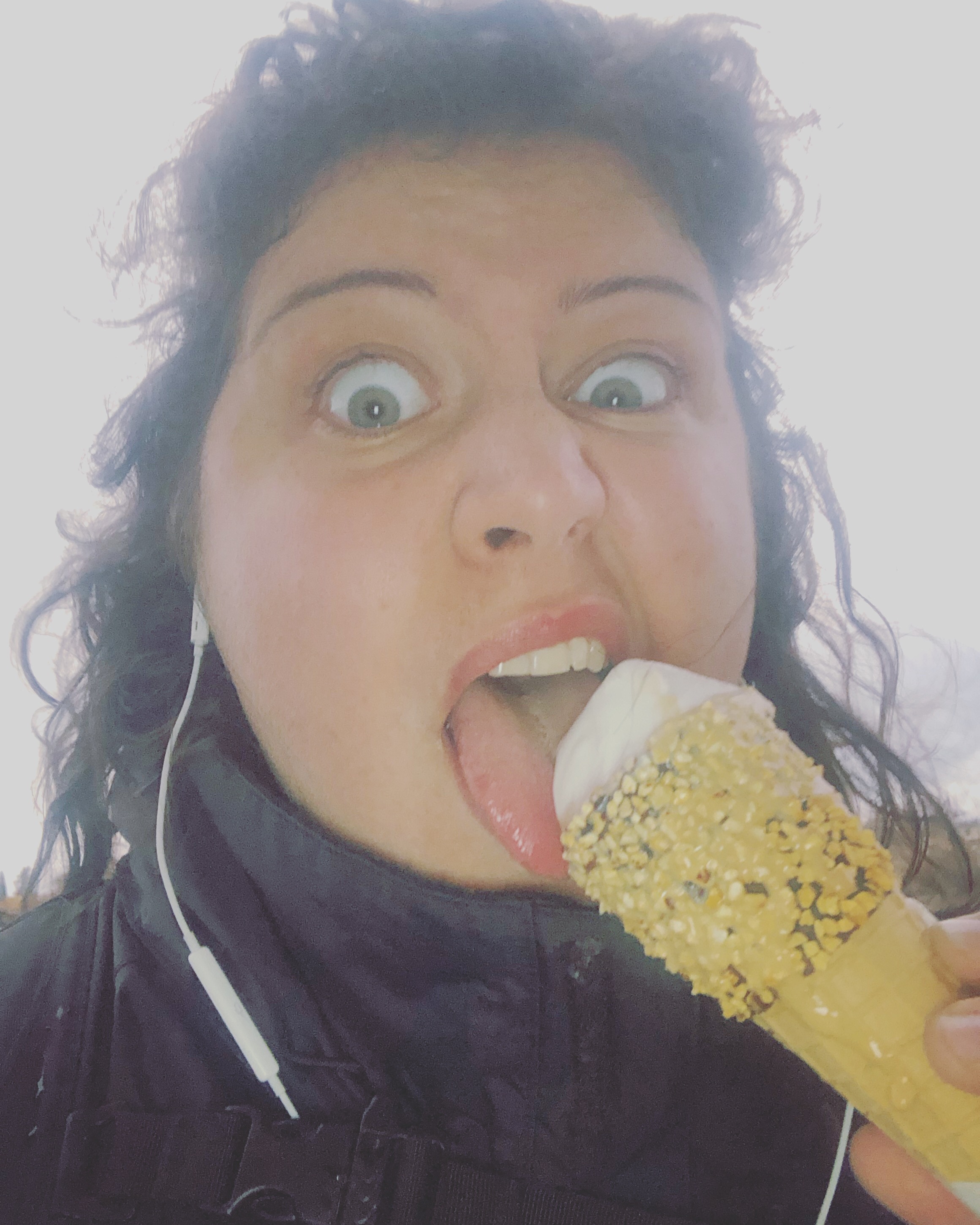Il vento si porta via le prime gocce di gelato che finiscono sul giaccone.