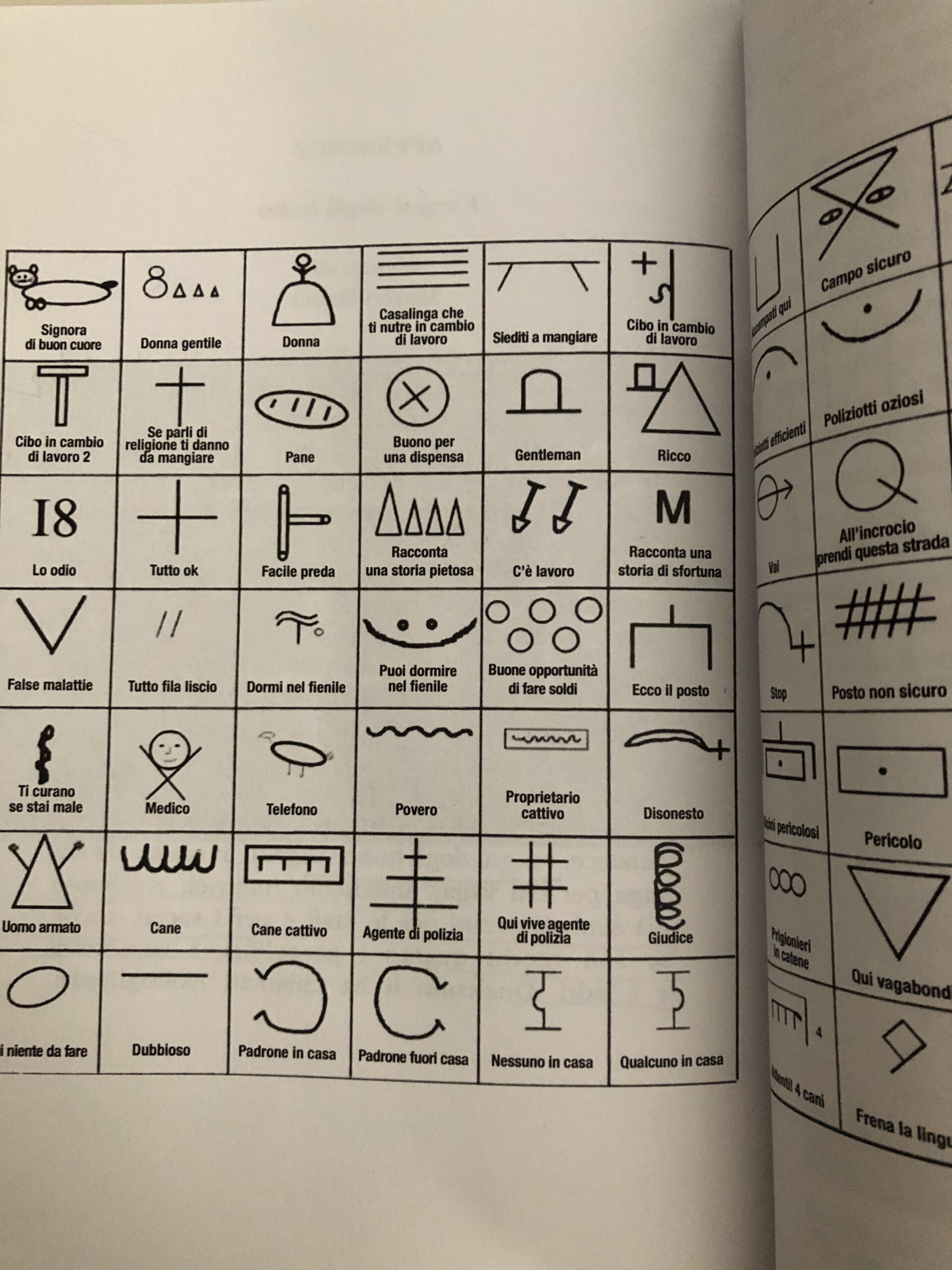 Ho imparato che Ray, conosciuto come A-N°1 , ideò un vero e proprio vocabolario Hobo, fatto di simboli e disegni che permettevano di capire che difficoltà potessero esserci in una stazione, in una cittadina o in un quartiere. Chiunque conoscesse il significato di quelle scritte poteva sapere a cosa andava incontro ad esempio, poteva scoprire se c’erano cani pericolosi, poliziotti corrotti, galere pulite, padroni di casa che offrivano cibo o alloggio.