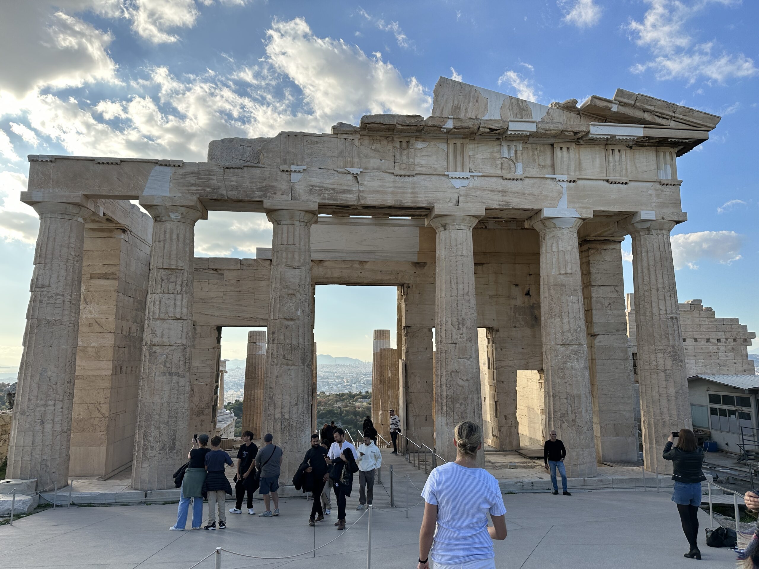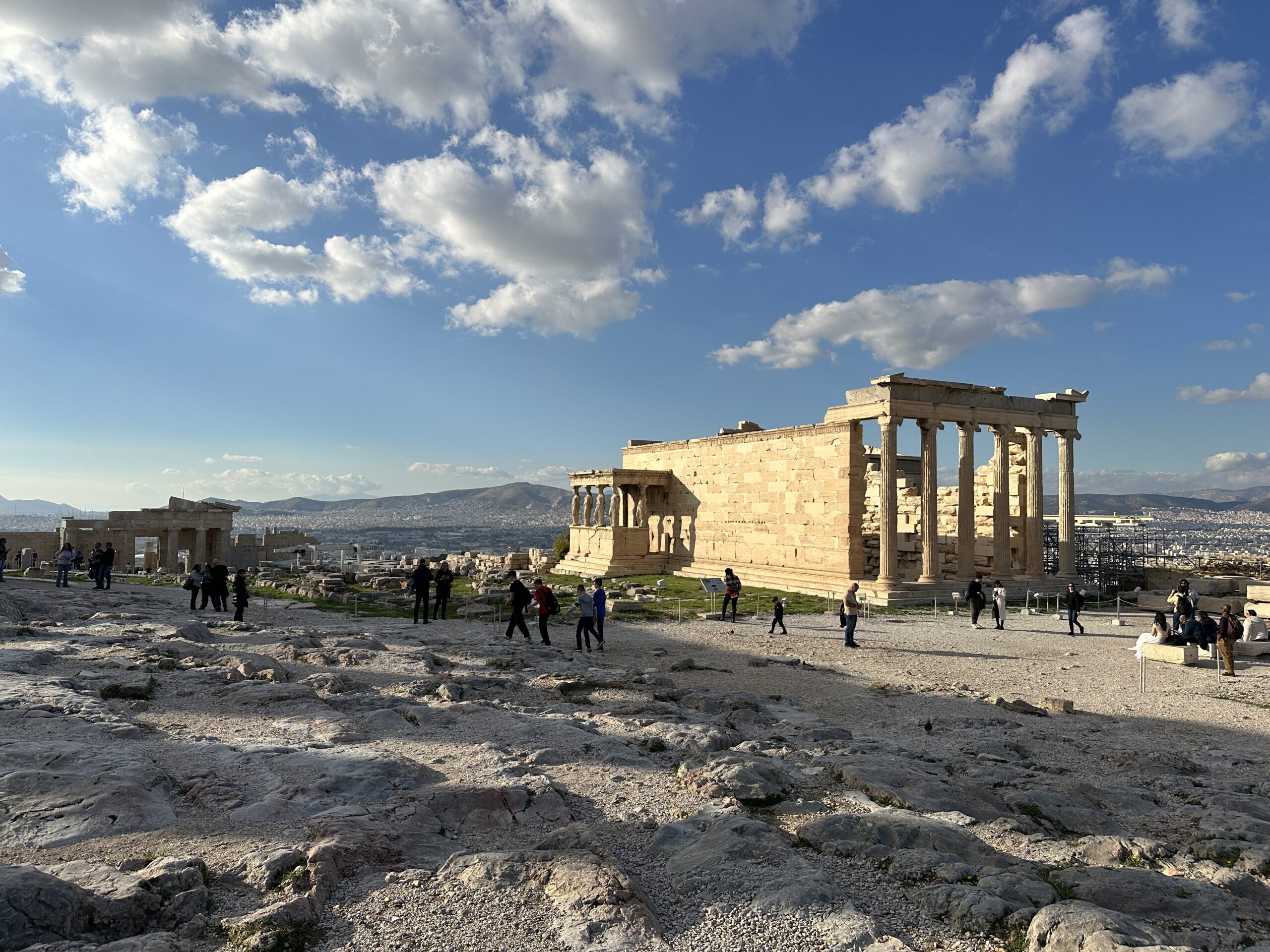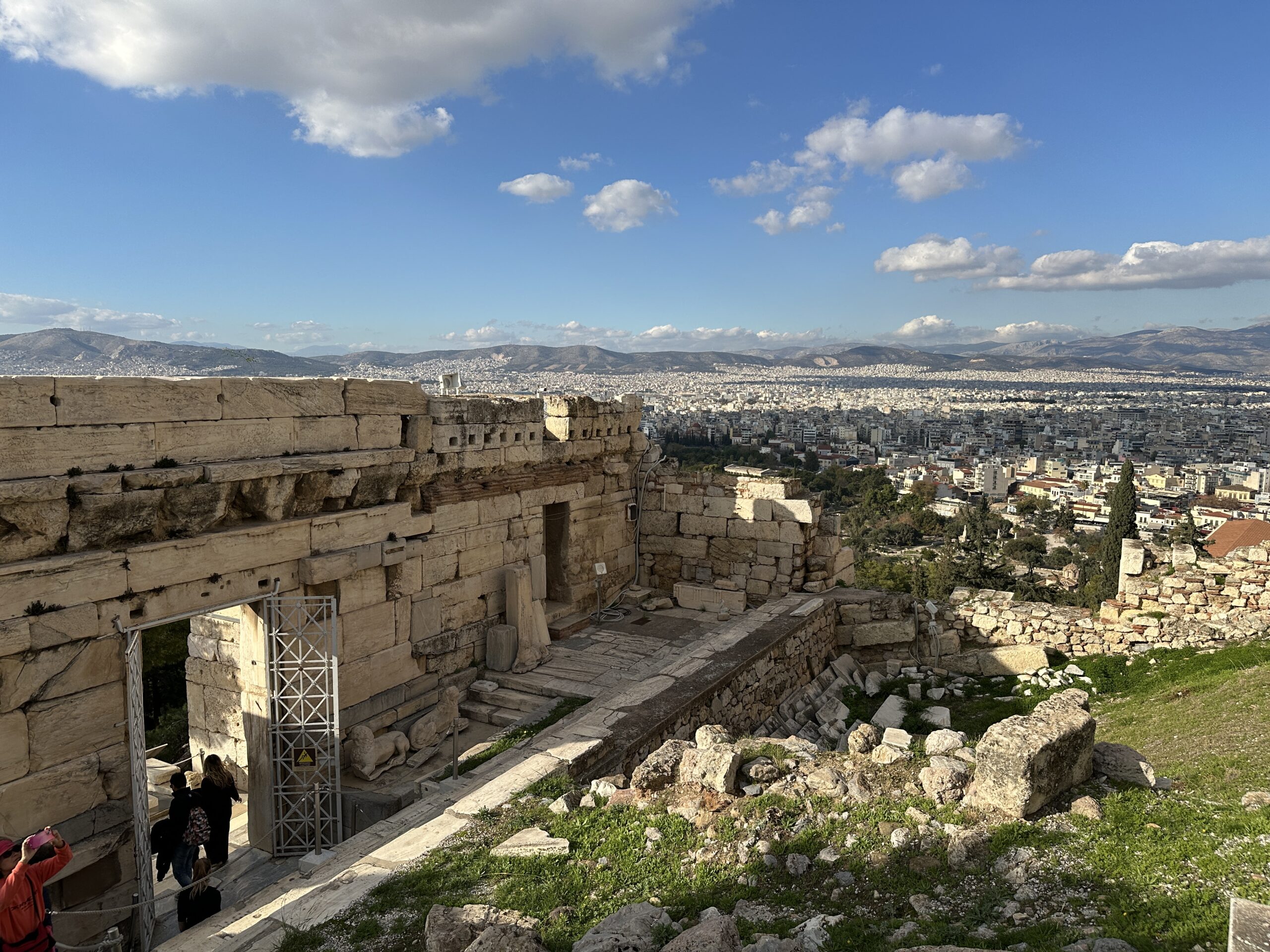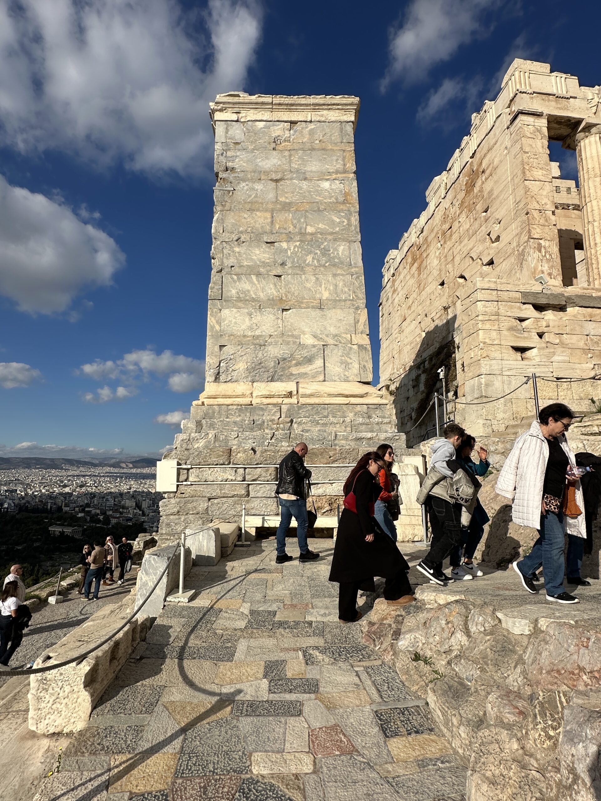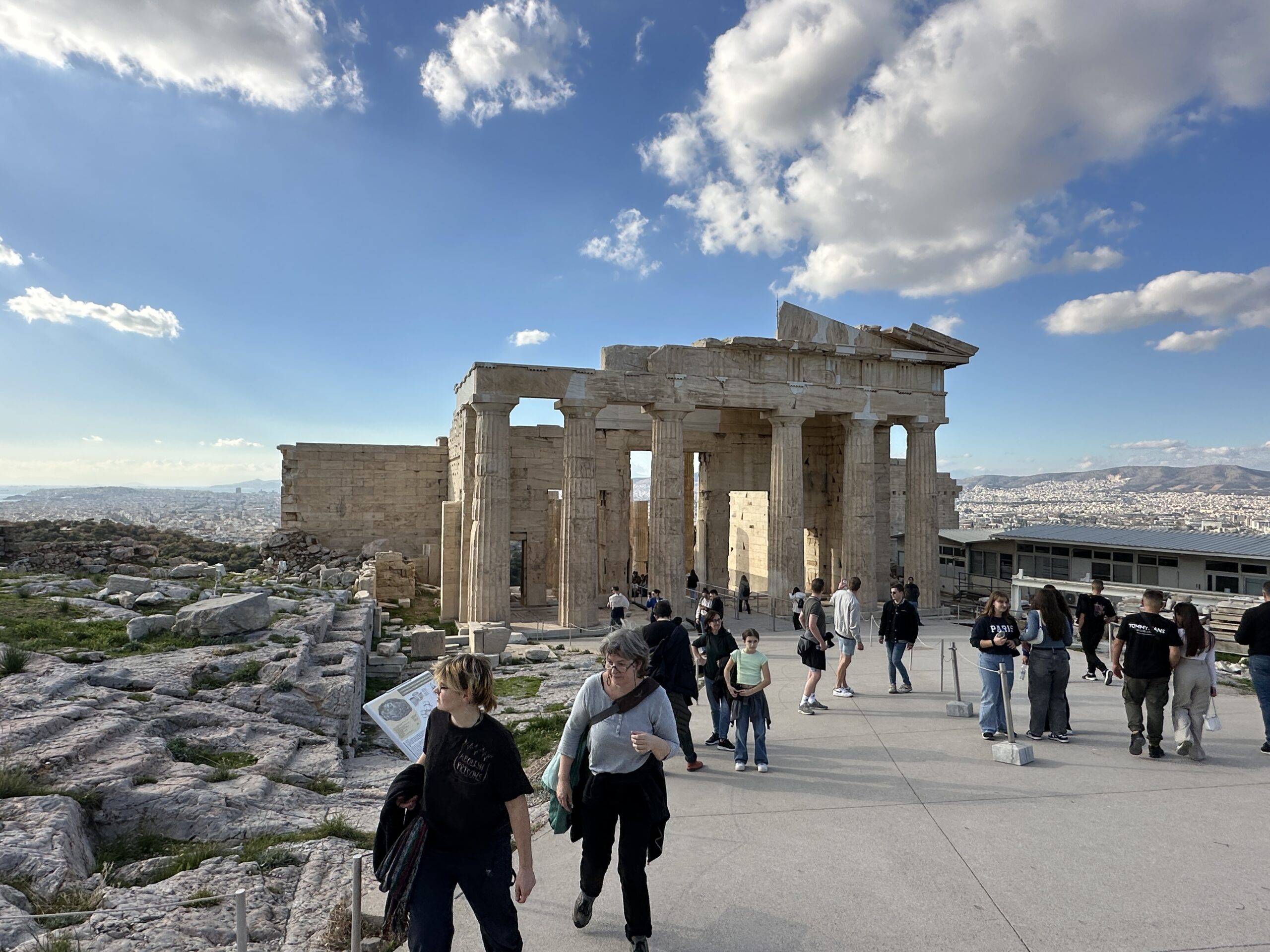 Considerando l’irregolarità del perimetro dell’altura, la pianta di questi edifici è piuttosto disordinata. Atene ai suoi piedi sembra un mondo totalmente estraneo all’atmosfera di questo luogo antico. Mi aggiro cercando di carpire il più piccolo dei particolari.