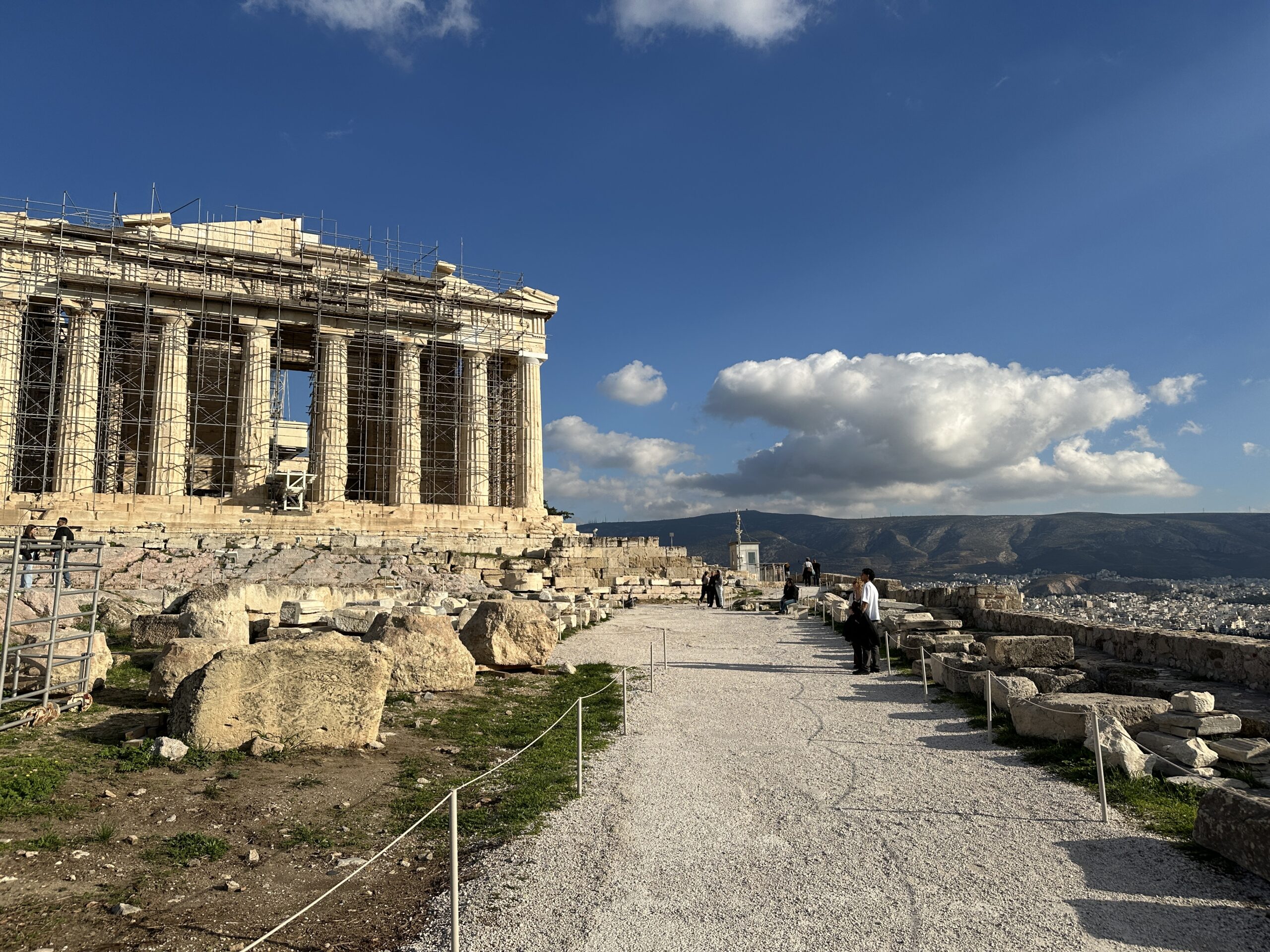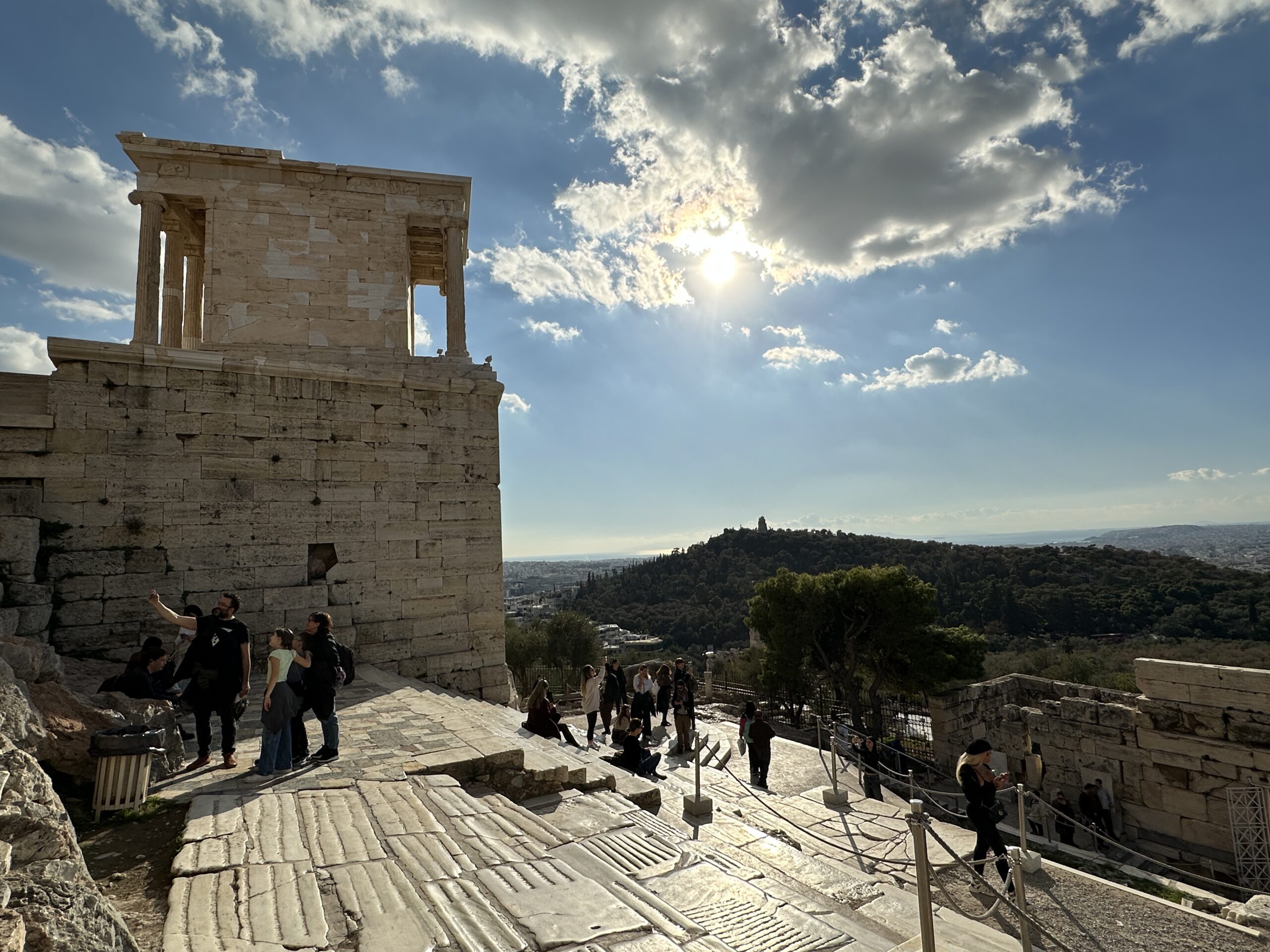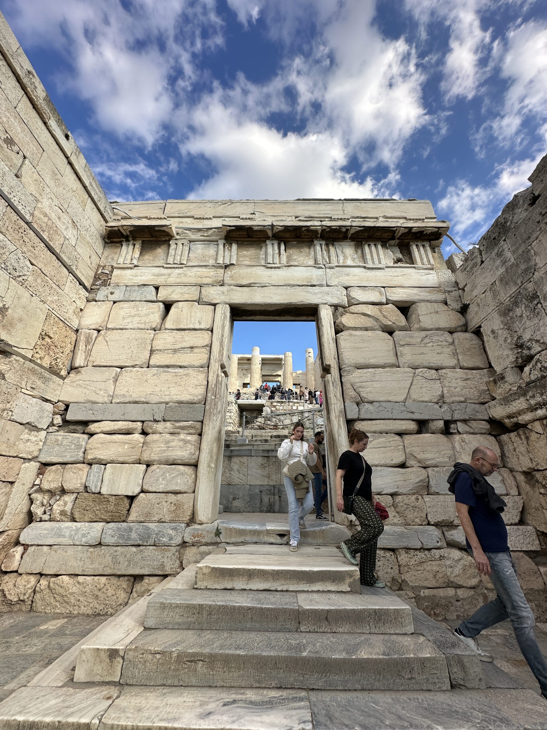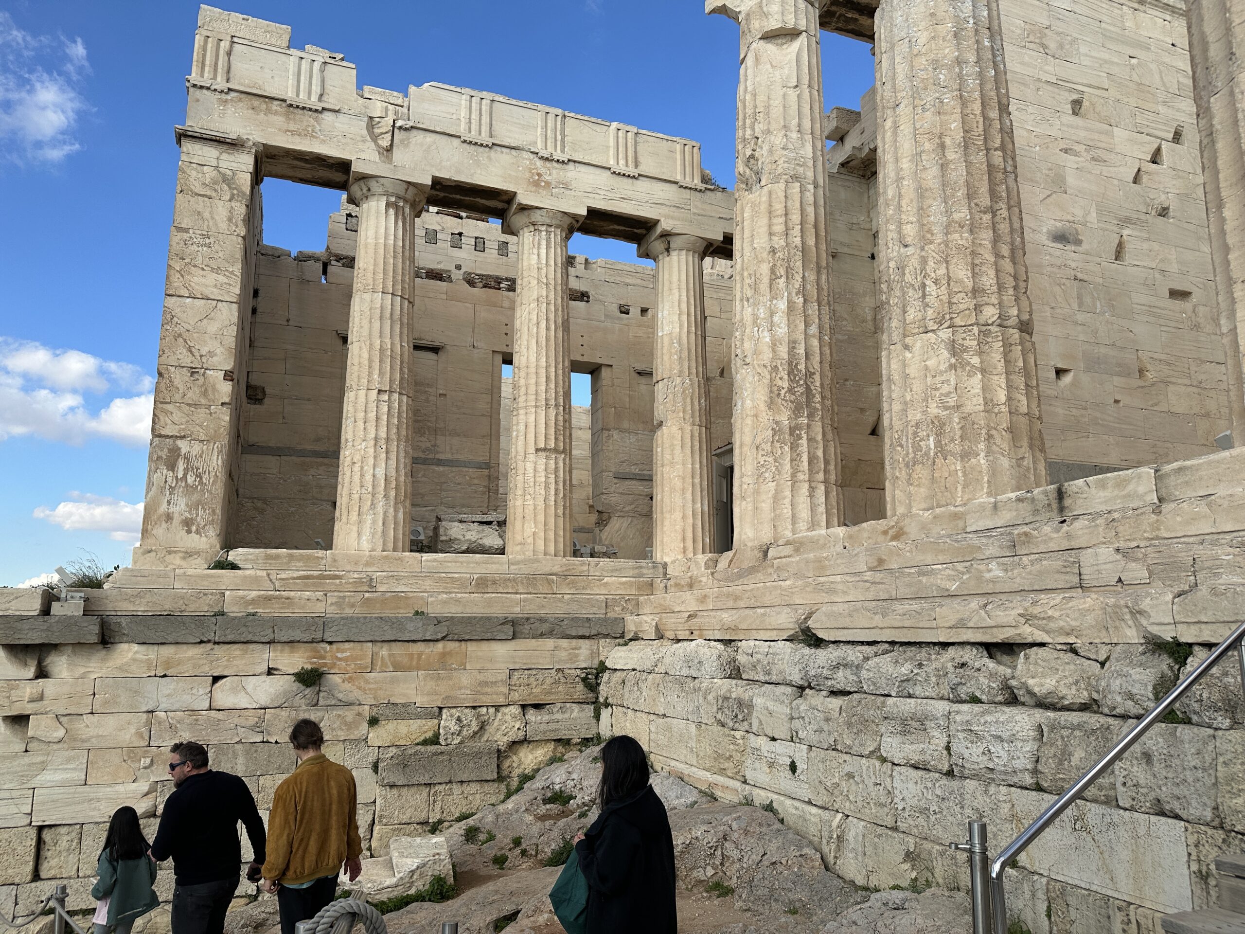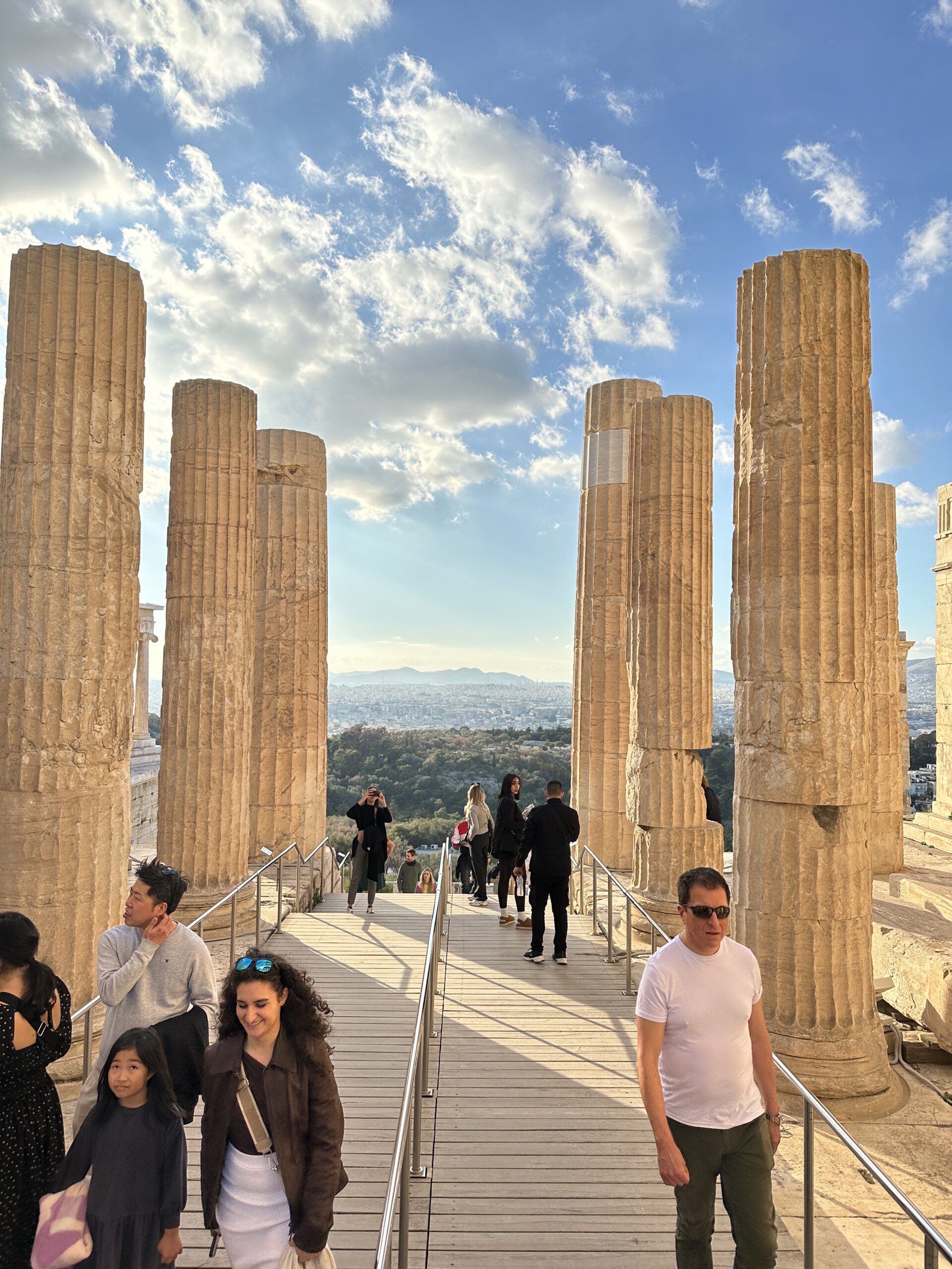 Considerando l’irregolarità del perimetro dell’altura, la pianta di questi edifici è piuttosto disordinata. Atene ai suoi piedi sembra un mondo totalmente estraneo all’atmosfera di questo luogo antico. Mi aggiro cercando di carpire il più piccolo dei particolari.