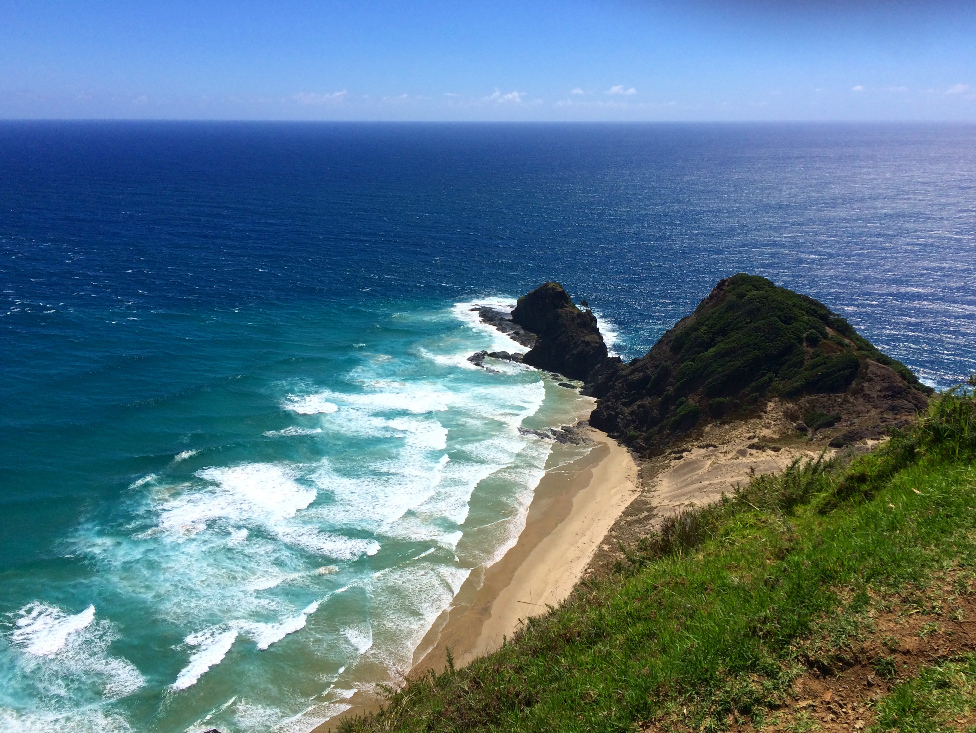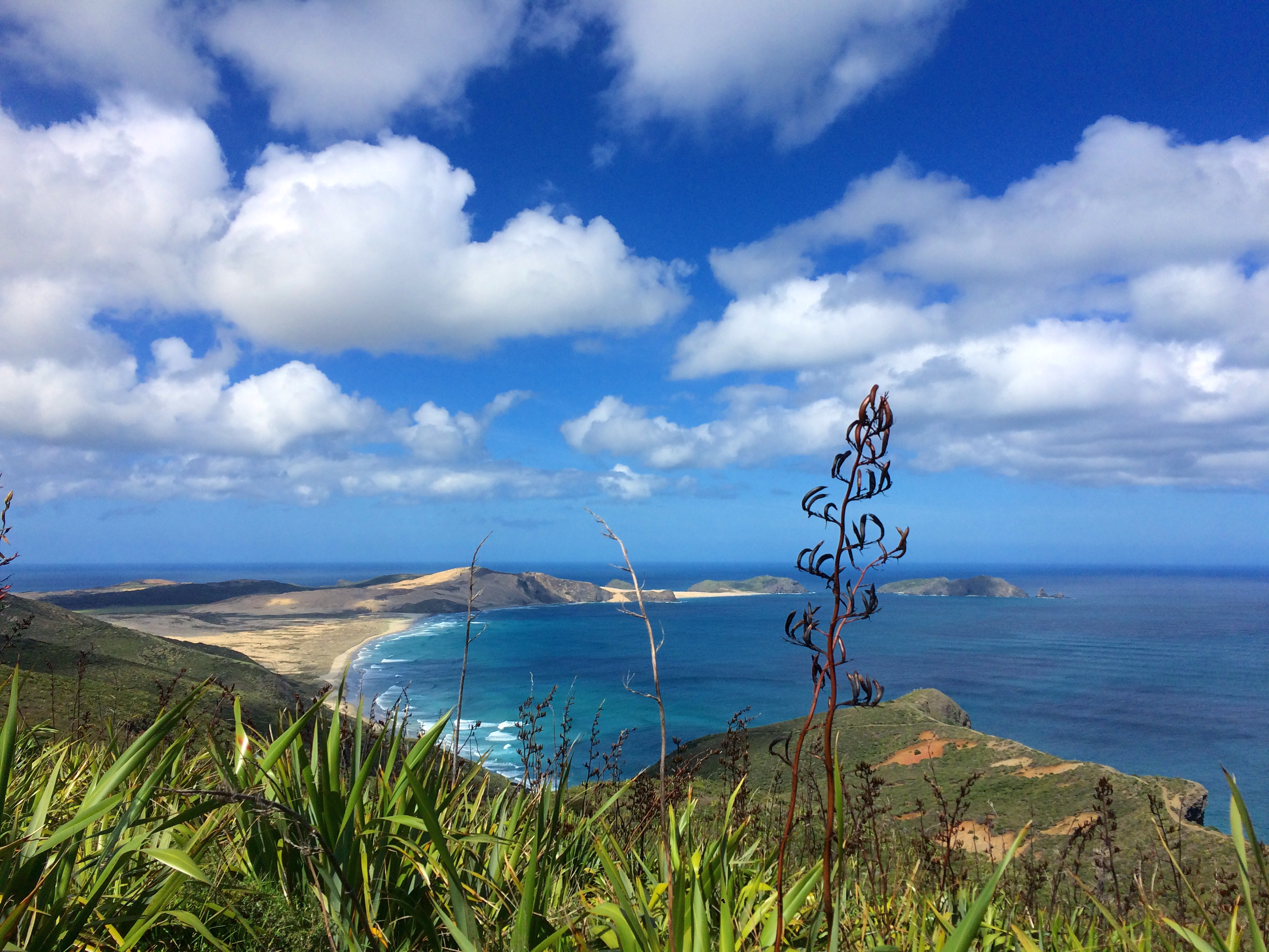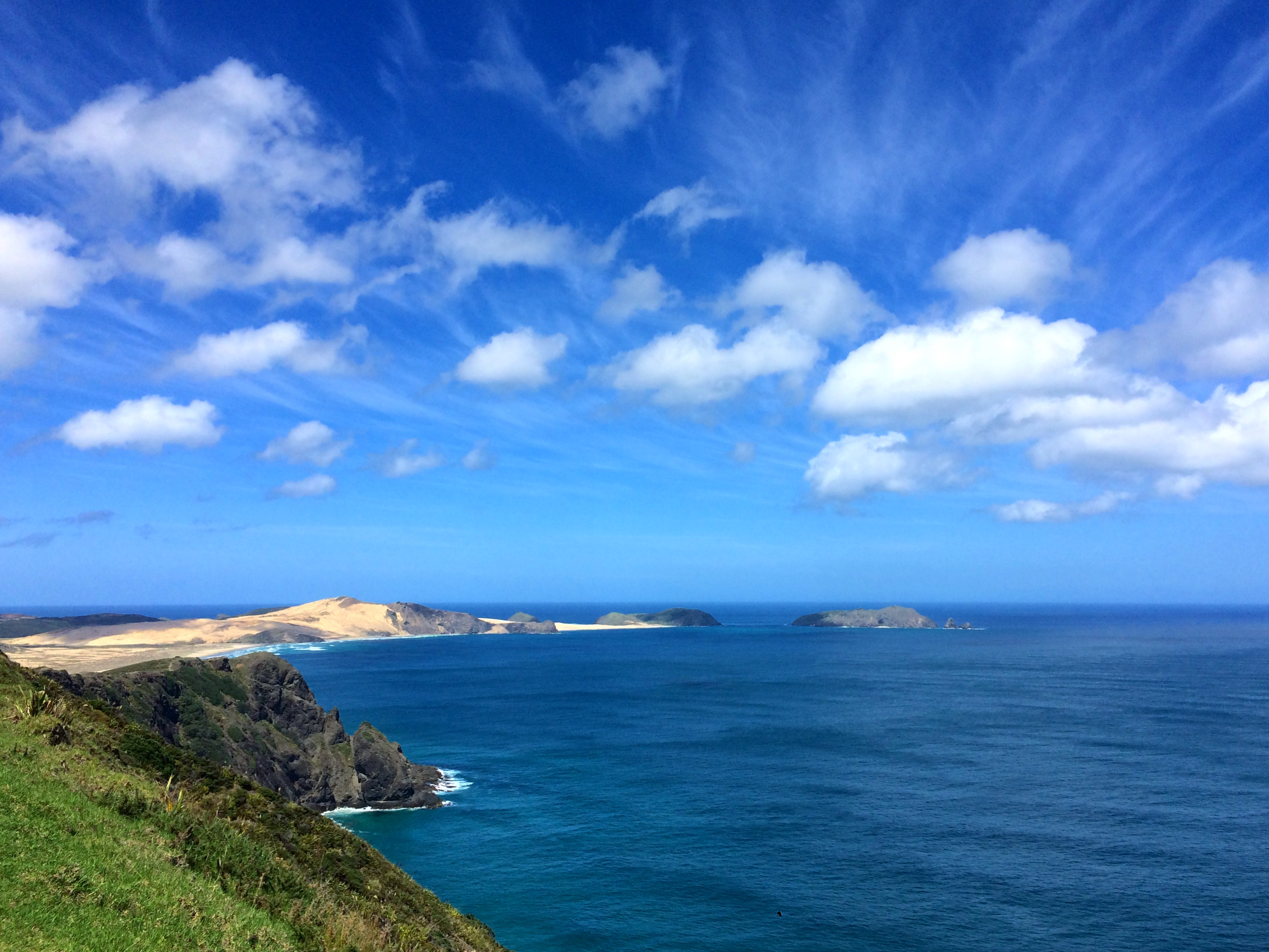 Certe volte penso che la Natura dovrebbe farci pagare il biglietto davanti a spettacoli così ben realizzati. Il palcoscenico è stato montato a regola d’arte: una scogliera affusolata che si adagia sul mare lasciando spazio ad un lembo di finissima sabbia color senape. Sicuramente sono stati ingaggiati degli artisti per la scenografia perché la tinta dell’acqua è così particolare da colpirmi subito: c’è un un celeste quasi trasparente che contrasta con ferocia un blu scuro e tenebroso. Sono il Mar di Tasmania e l’Oceano Pacifico che si incontrano (o forse si scontrano) e, senza mescolarsi, disegnano una linea di confine tra la profondità e l’ abisso. Le nuvole basse (tipiche della Nuova Zelanda) fanno da comparse e, muovendosi sinuose, sembrano avvicinarsi sempre più a quei bassi arbusti verdi, come a voler suggerire le battute di un copione messo in scena da centinaia di anni.