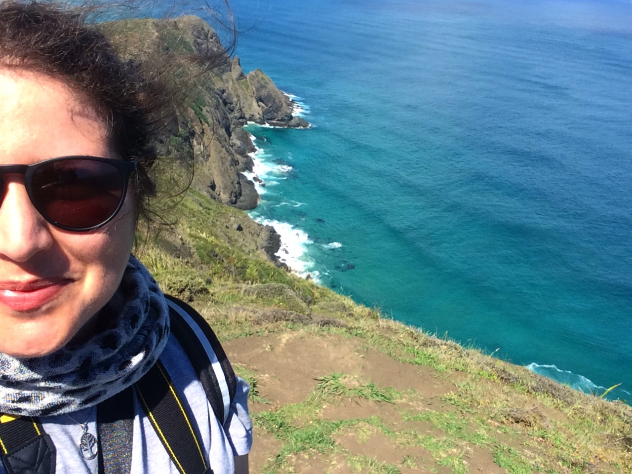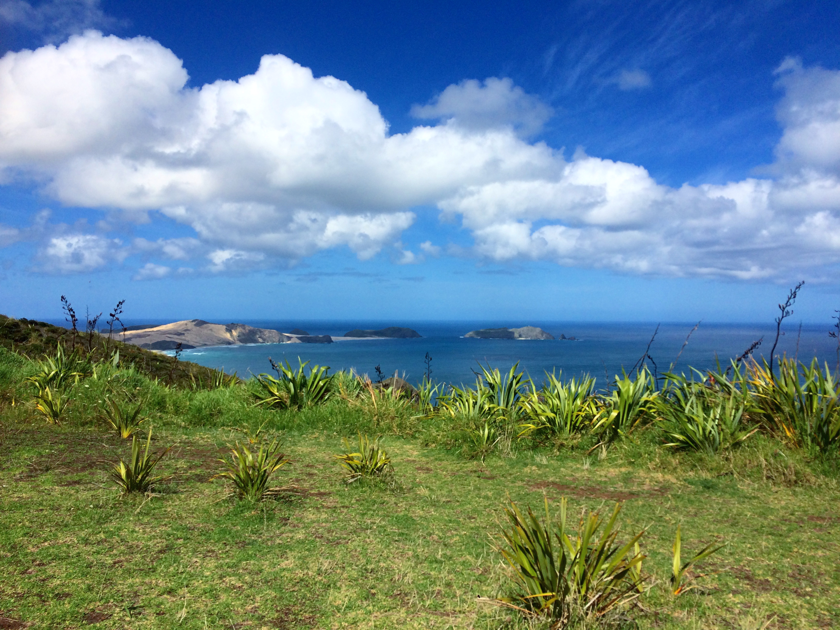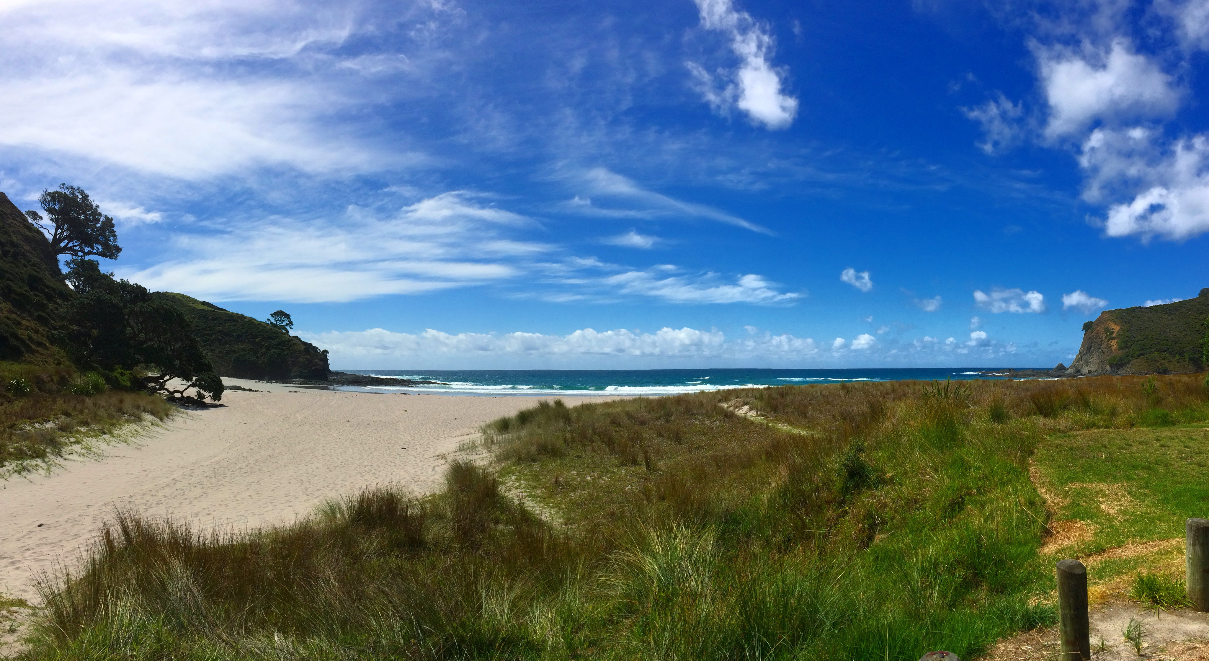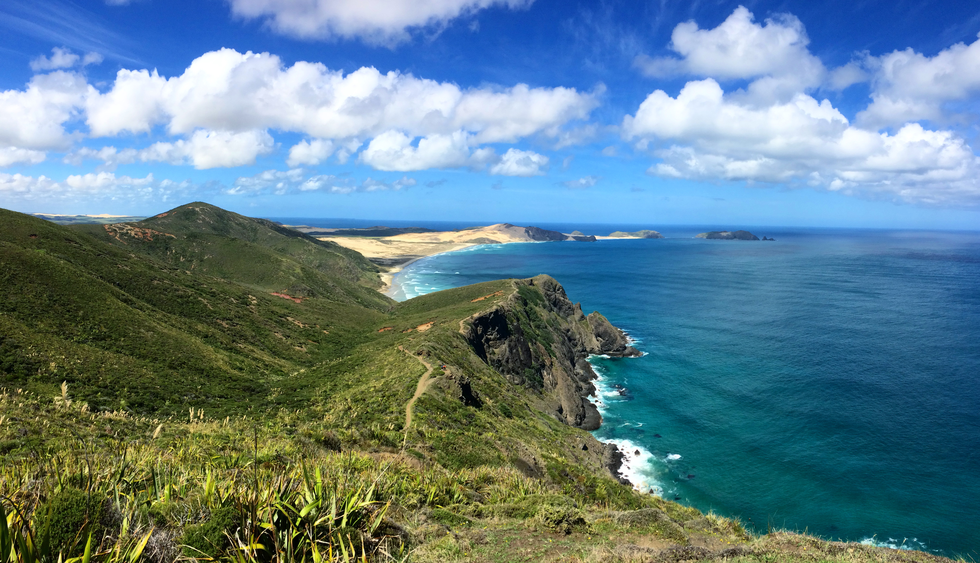 Certe volte penso che la Natura dovrebbe farci pagare il biglietto davanti a spettacoli così ben realizzati. Il palcoscenico è stato montato a regola d’arte: una scogliera affusolata che si adagia sul mare lasciando spazio ad un lembo di finissima sabbia color senape. Sicuramente sono stati ingaggiati degli artisti per la scenografia perché la tinta dell’acqua è così particolare da colpirmi subito: c’è un un celeste quasi trasparente che contrasta con ferocia un blu scuro e tenebroso. Sono il Mar di Tasmania e l’Oceano Pacifico che si incontrano (o forse si scontrano) e, senza mescolarsi, disegnano una linea di confine tra la profondità e l’ abisso. Le nuvole basse (tipiche della Nuova Zelanda) fanno da comparse e, muovendosi sinuose, sembrano avvicinarsi sempre più a quei bassi arbusti verdi, come a voler suggerire le battute di un copione messo in scena da centinaia di anni.