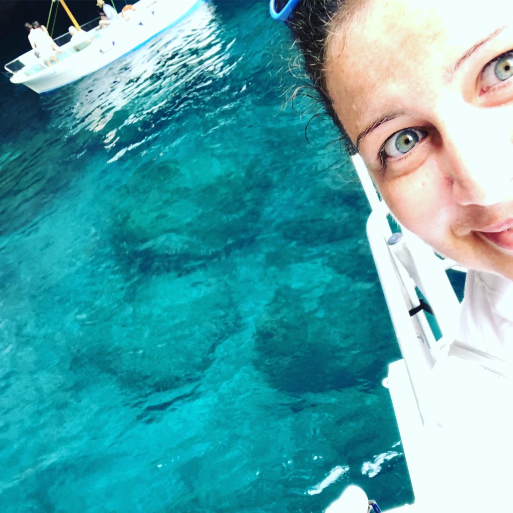 Torniamo al porto e prendiamo un’ imbarcazione per il giro naturalistico dell’isola. Niente grotta azzurra purtroppo, non c’è tempo ma riuscirò a vedere quella bianca, quella dei coralli e quella verde. La giornata è meravigliosamente calda.