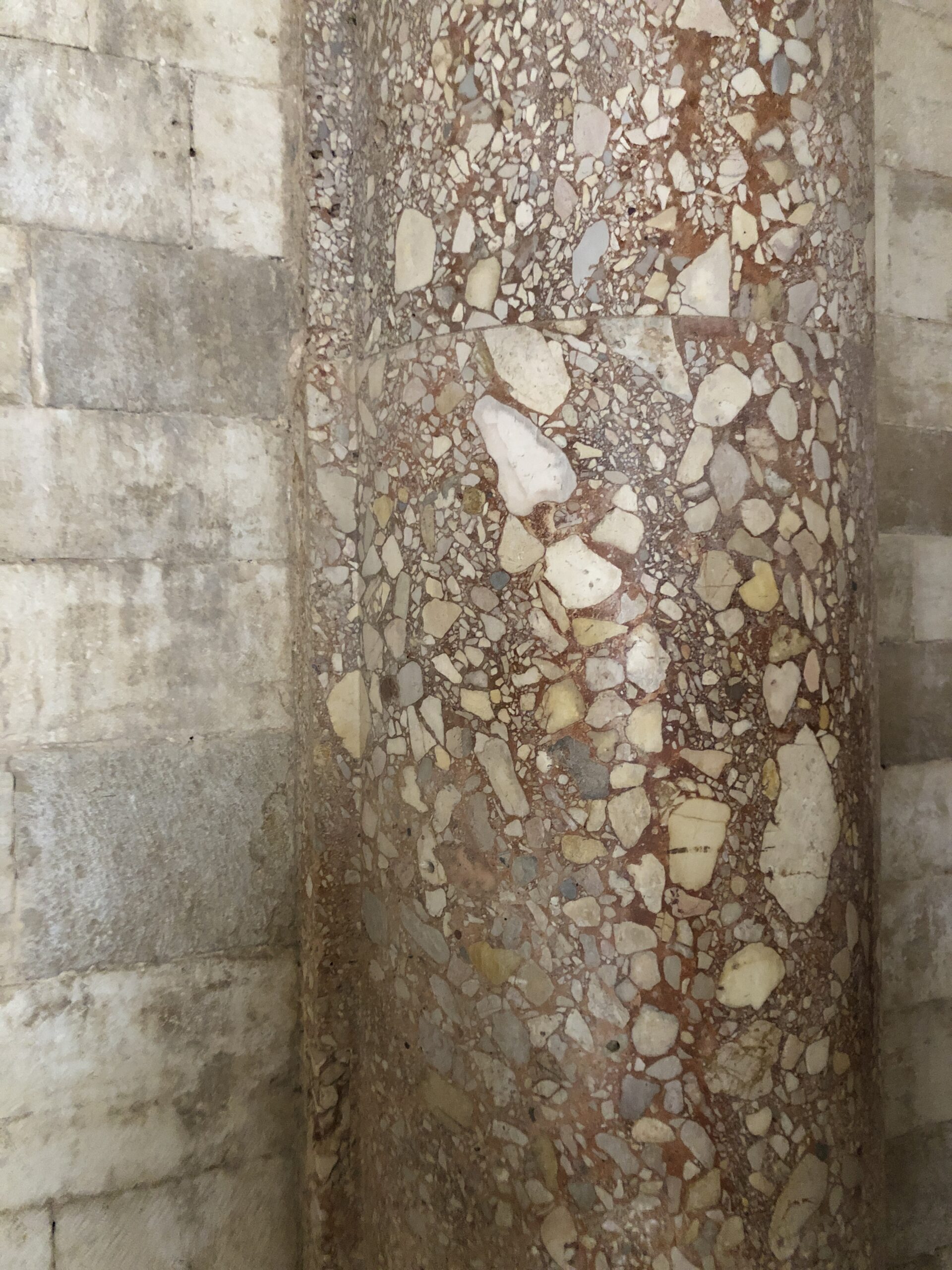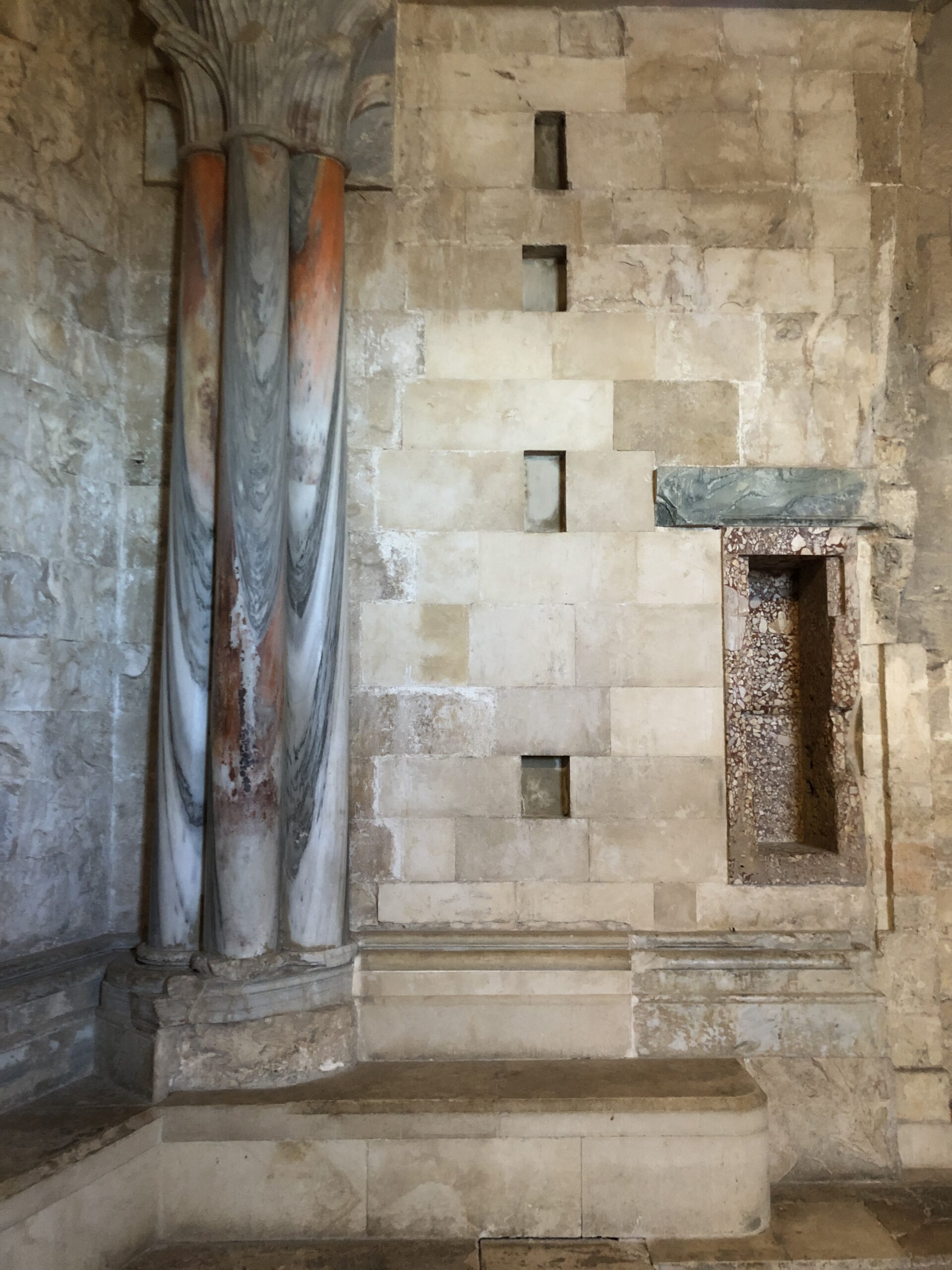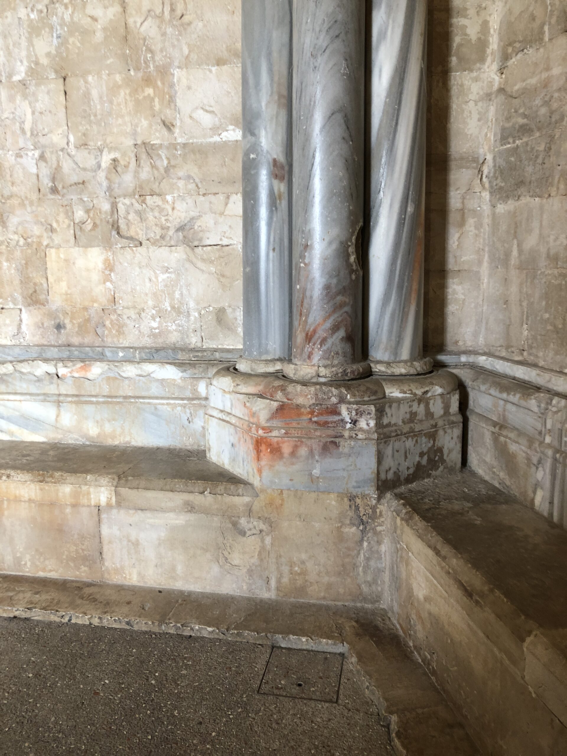 Giro per le sale immaginando quanto potesse essere bello prima dei saccheggi. I pavimenti a mosaico sono stati tutti asportati ad eccezione di una piccolissima parte ancora visibile, alle colonne sono stati staccati alcuni capitelli e dei camini è rimasta solo la sagoma. Anche tutto il prezioso materiale delle pareti è stato depredato, dai pochi resti s’intuisce che le stanze dovessero avere dei colori particolari, con striature ramate e grigie molto vistose, tipiche della breccia corallina utilizzata per la costruzione.