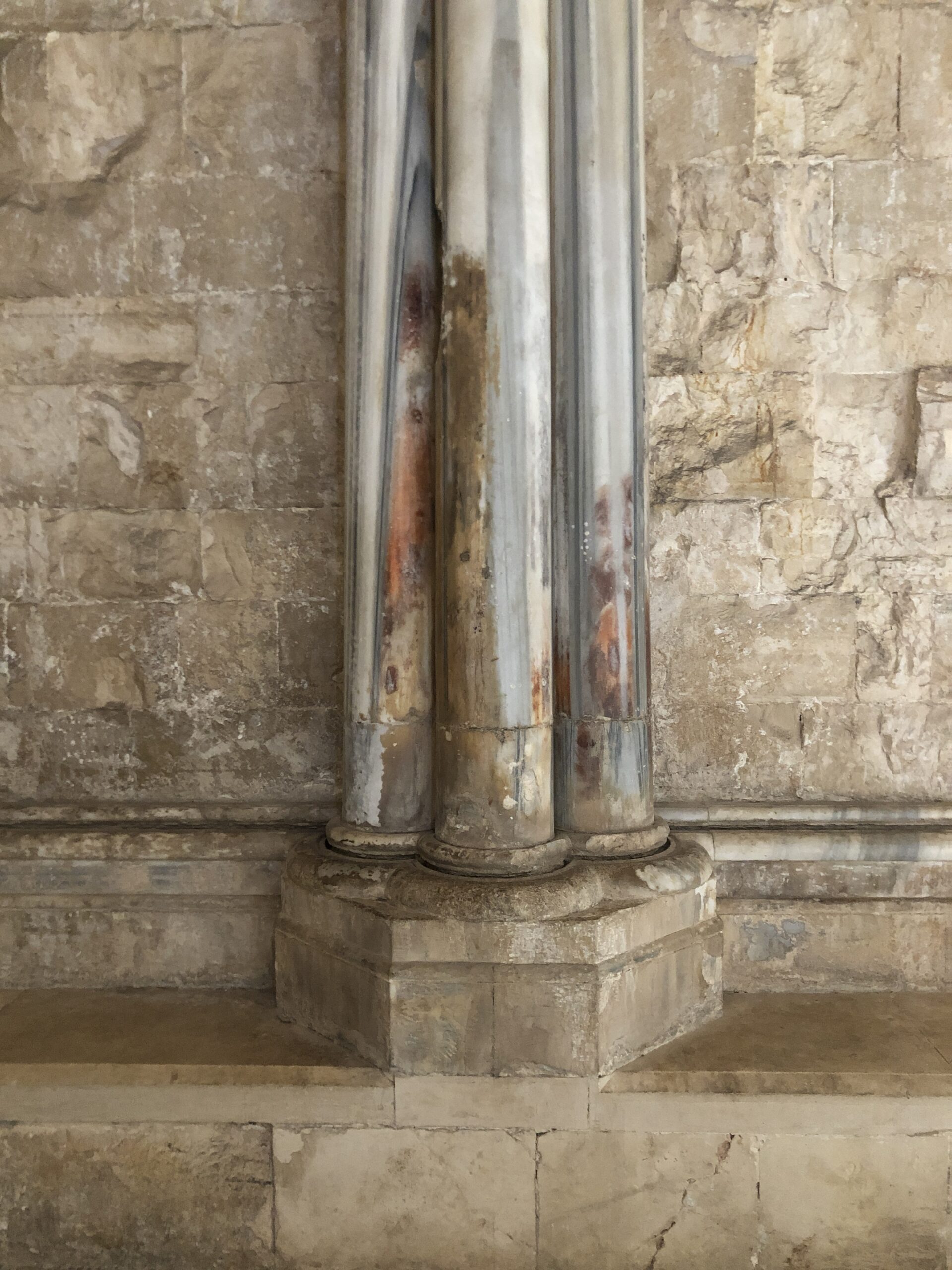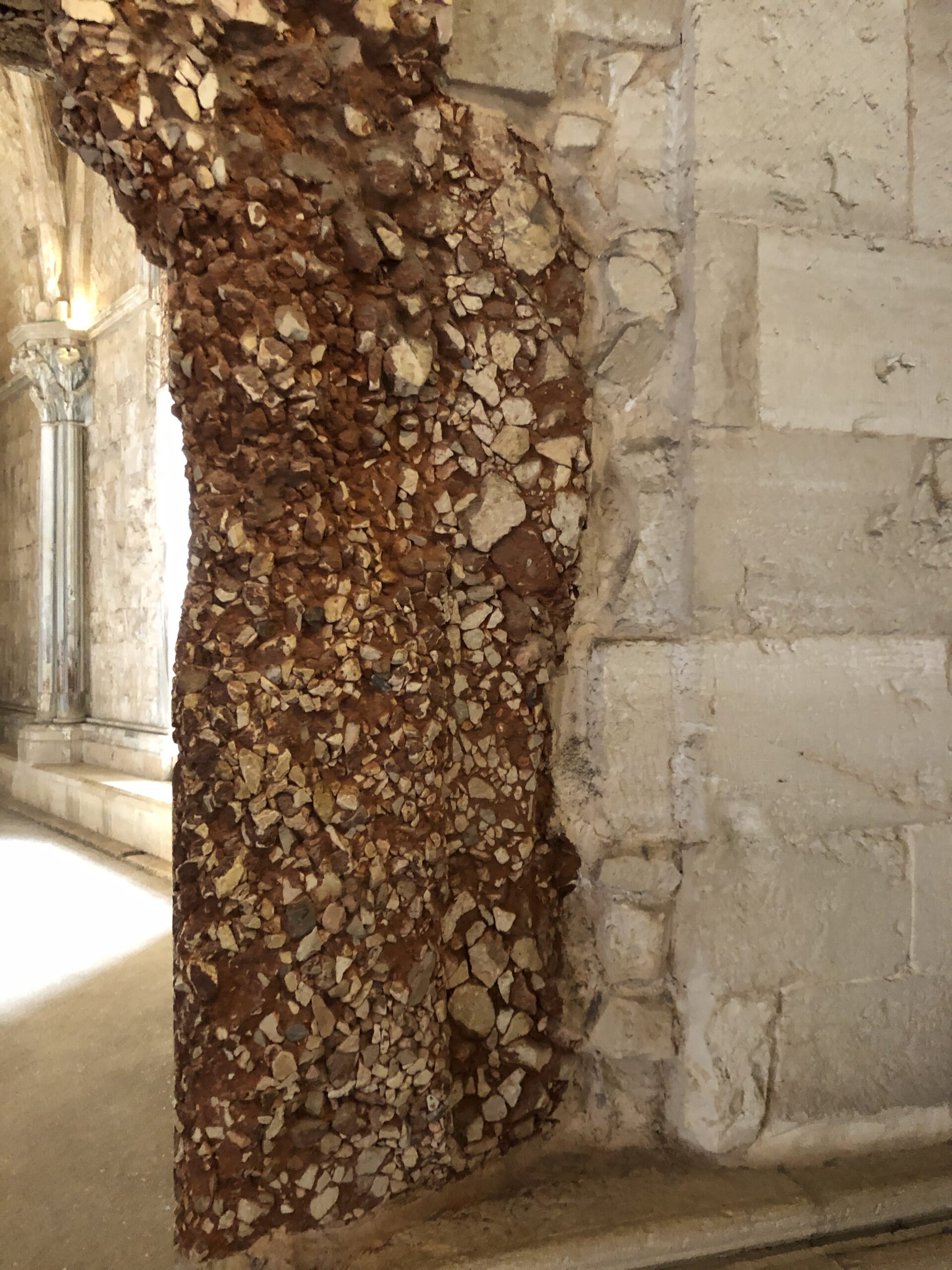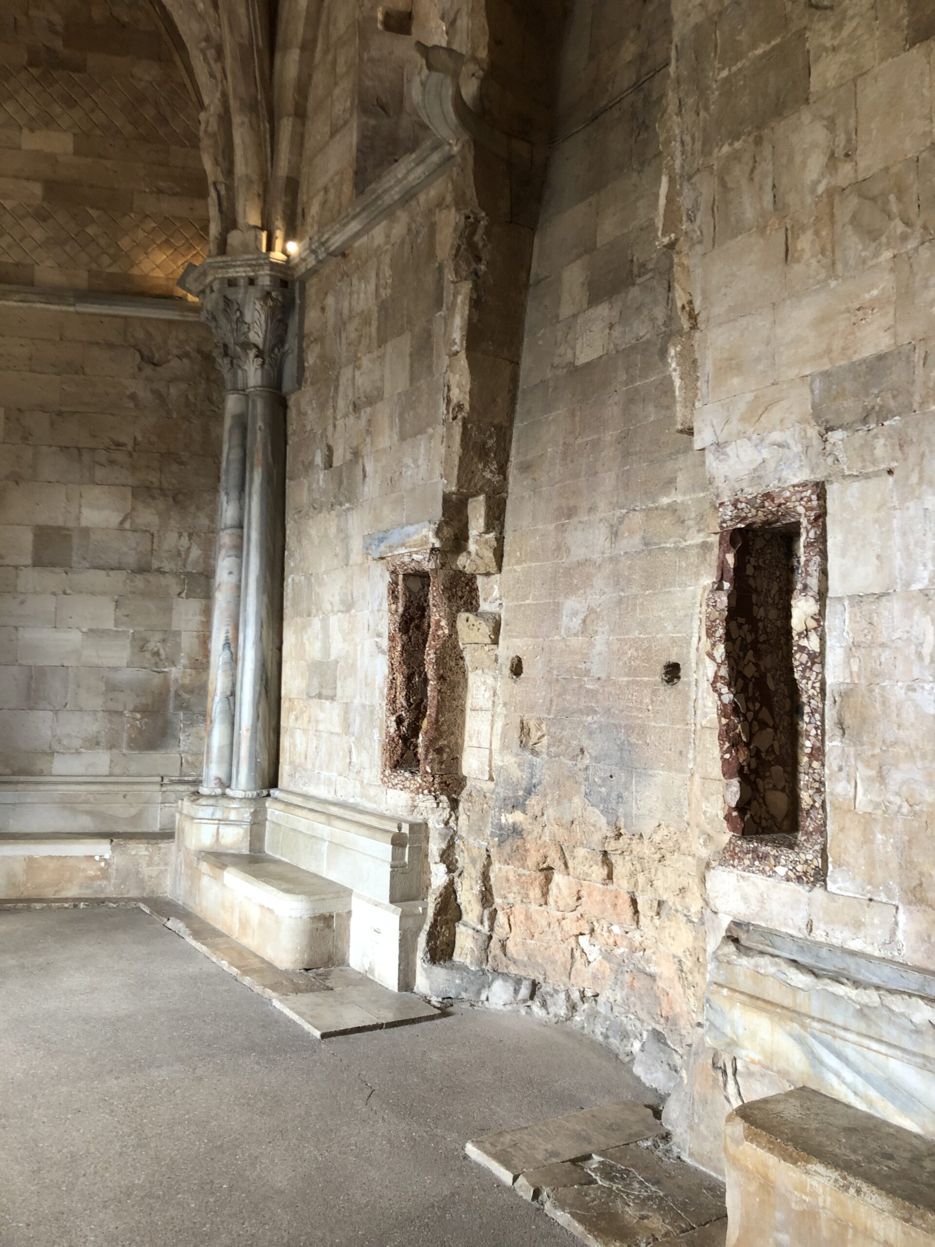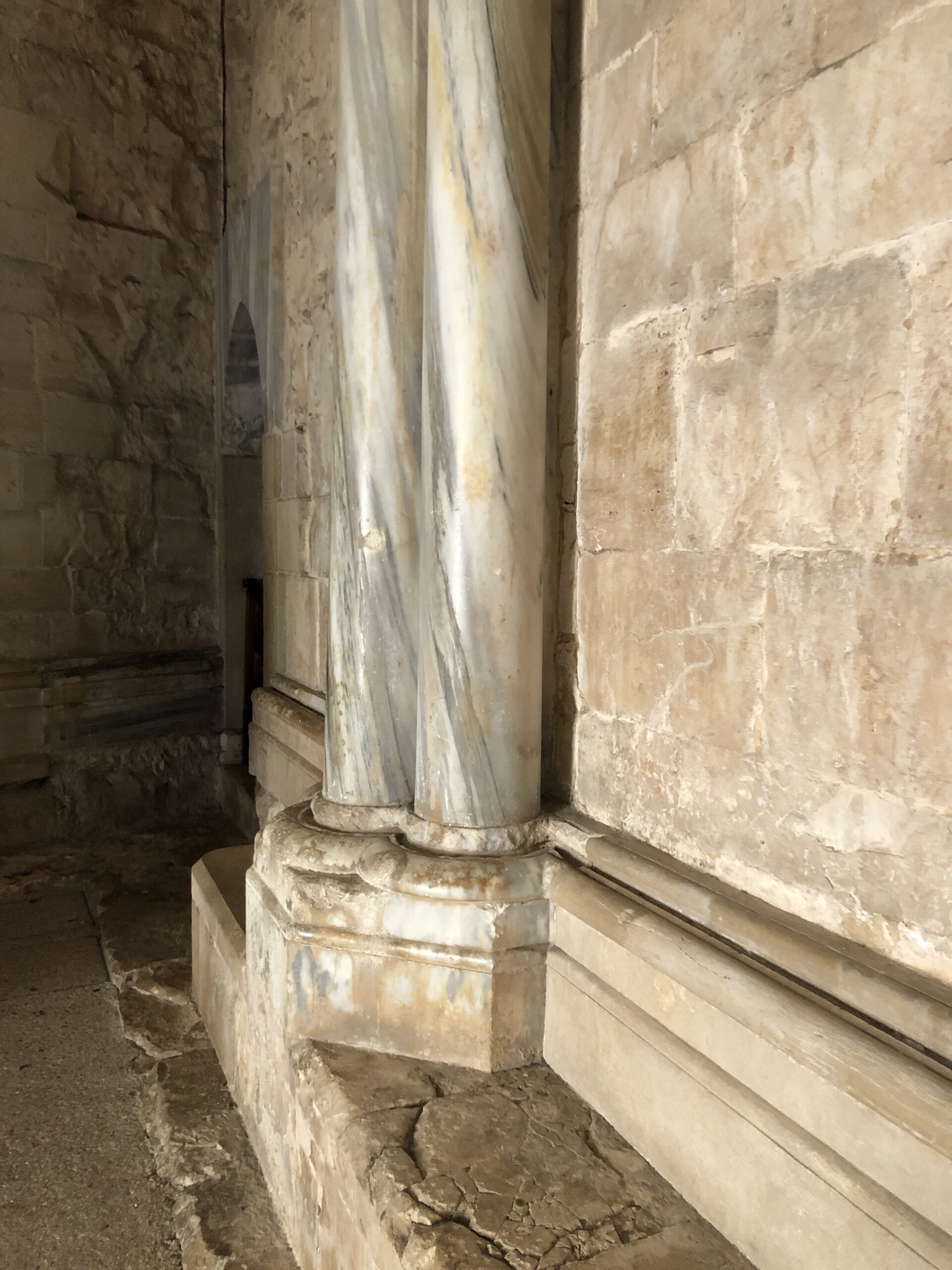 Giro per le sale immaginando quanto potesse essere bello prima dei saccheggi. I pavimenti a mosaico sono stati tutti asportati ad eccezione di una piccolissima parte ancora visibile, alle colonne sono stati staccati alcuni capitelli e dei camini è rimasta solo la sagoma. Anche tutto il prezioso materiale delle pareti è stato depredato, dai pochi resti s’intuisce che le stanze dovessero avere dei colori particolari, con striature ramate e grigie molto vistose, tipiche della breccia corallina utilizzata per la costruzione.
