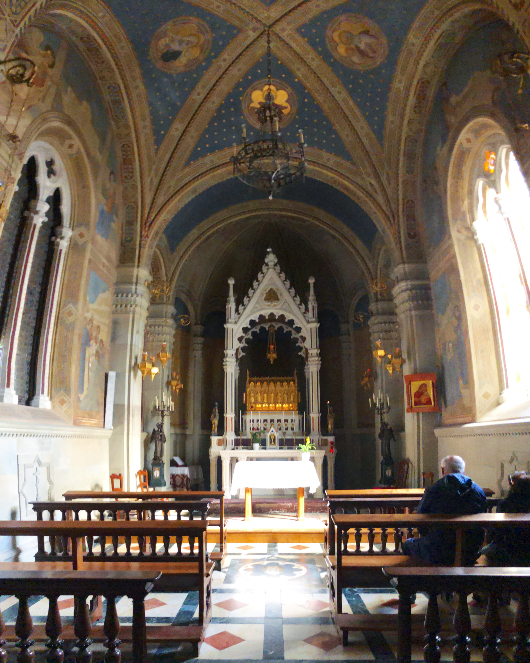 La chiesa in cima alle scale è veramente graziosa. C’è una cappella dai colori blu e oro che mi conquista. Ha un gusto arabeggiante, elegante, familiare…non so, è un ambiente con molti eccessi ma con una inspiegabile armonia. Il convento è parecchio grande, non so di preciso quante celle ci siano ma degli alti cancelli e una cinta muraria ne delimitano un vasto perimetro. Tutt’intorno ci sono diversi sentieri da poter percorrere, più o meno lunghi e faticosi che portano a delle “attrazioni”, se così si possono chiamare e, nonostante la temperatura frizzantina decido di provare a raggiungerle tutte.