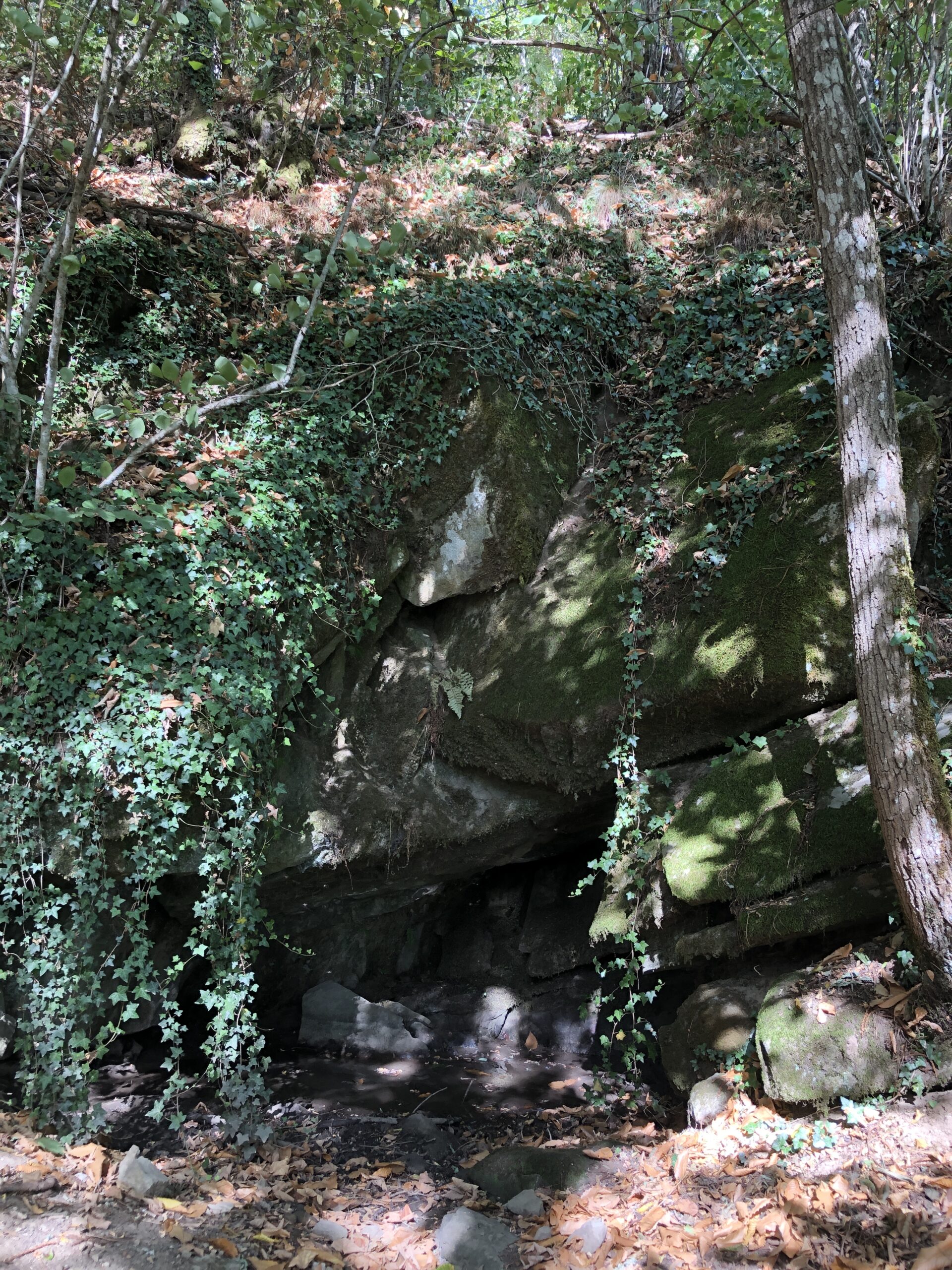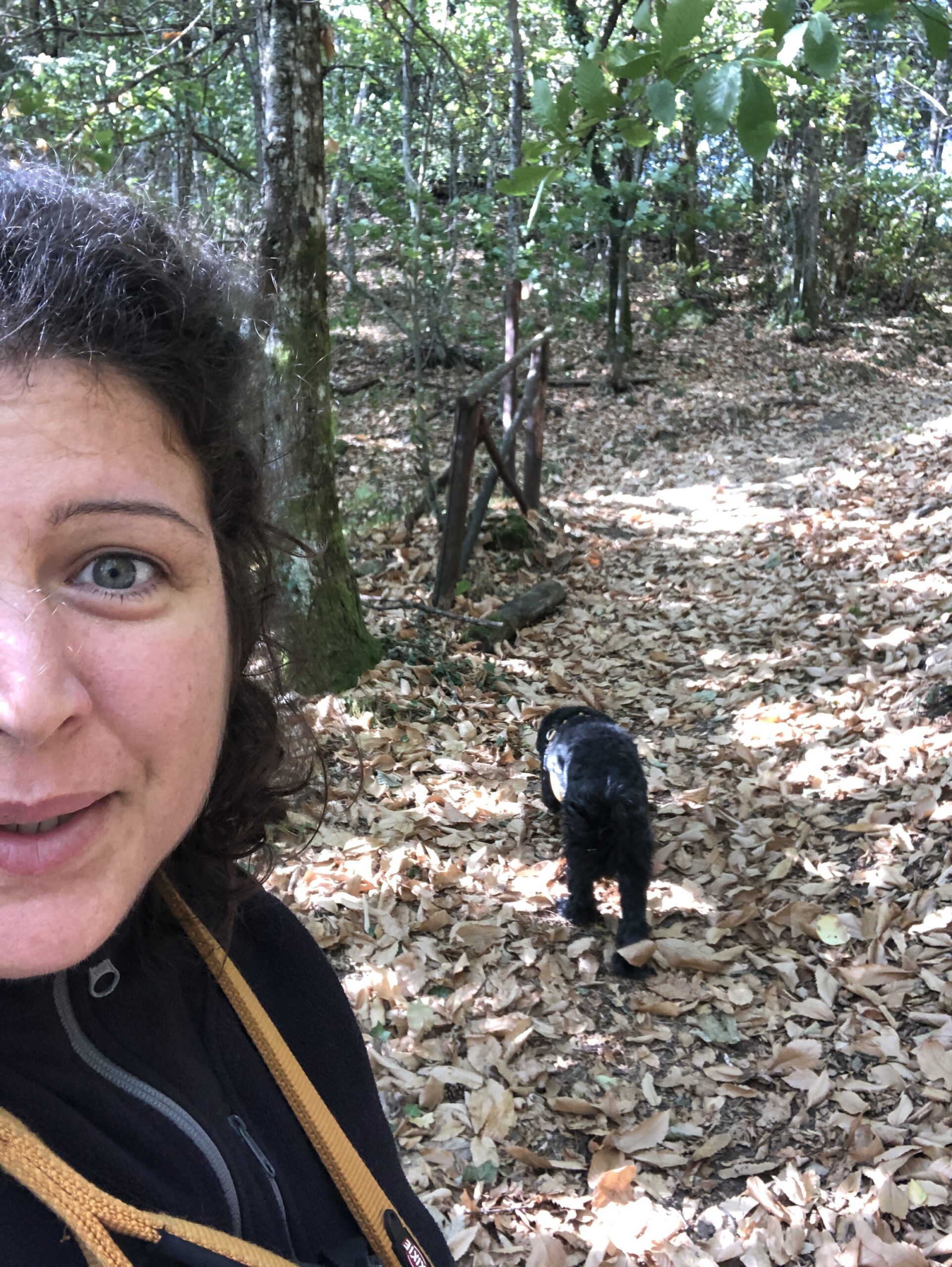 Il sentiero promette bene, le foglie al nostro passaggio suonano e il loro rumore un po’ pungente e un po’ armonioso mi fa entrare in brodo di giuggiole. (espressione che significa che mi fa parecchio felice). Pochi passi ancora lungo una discesa e….