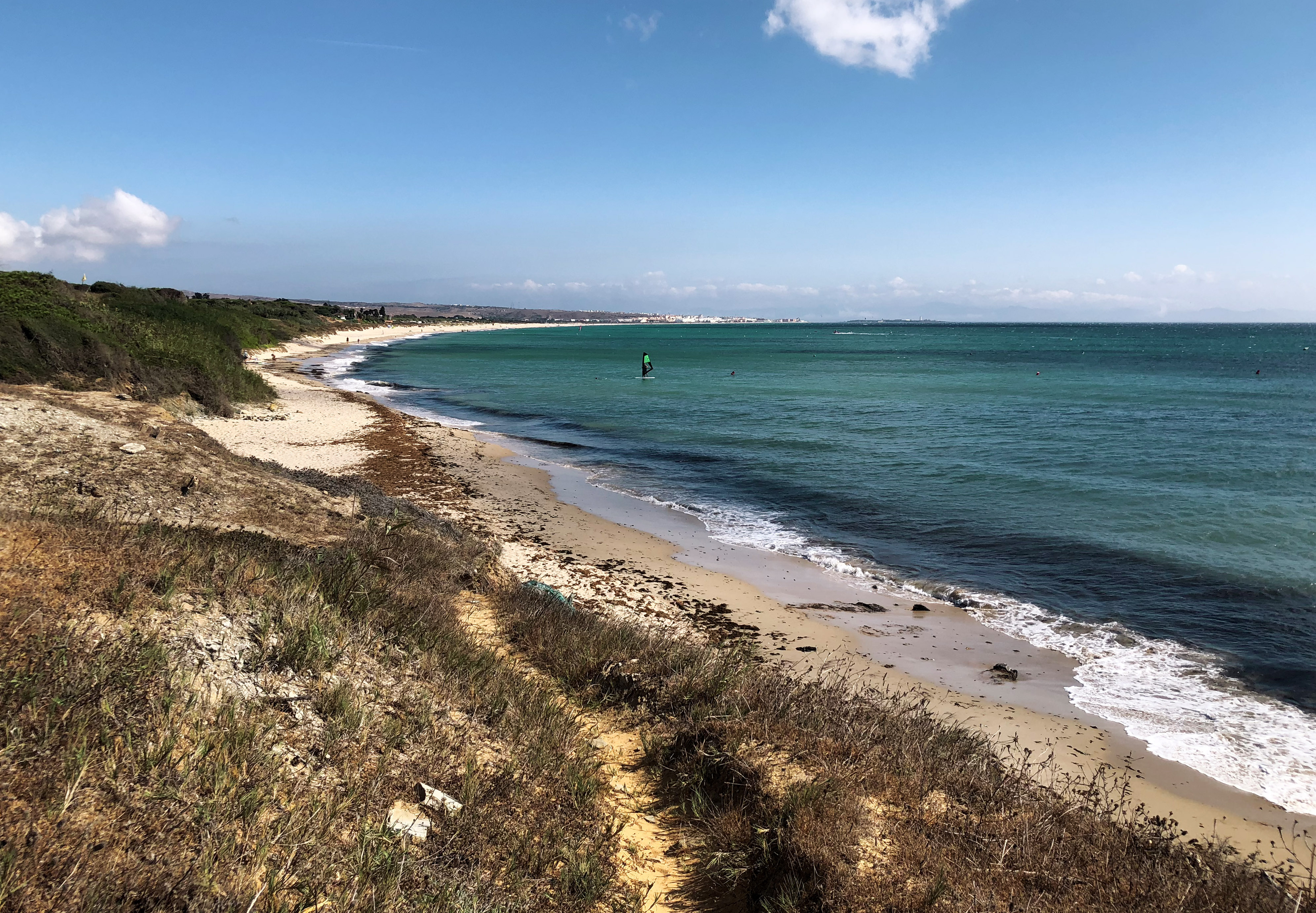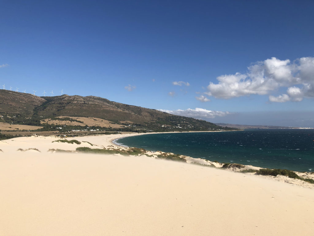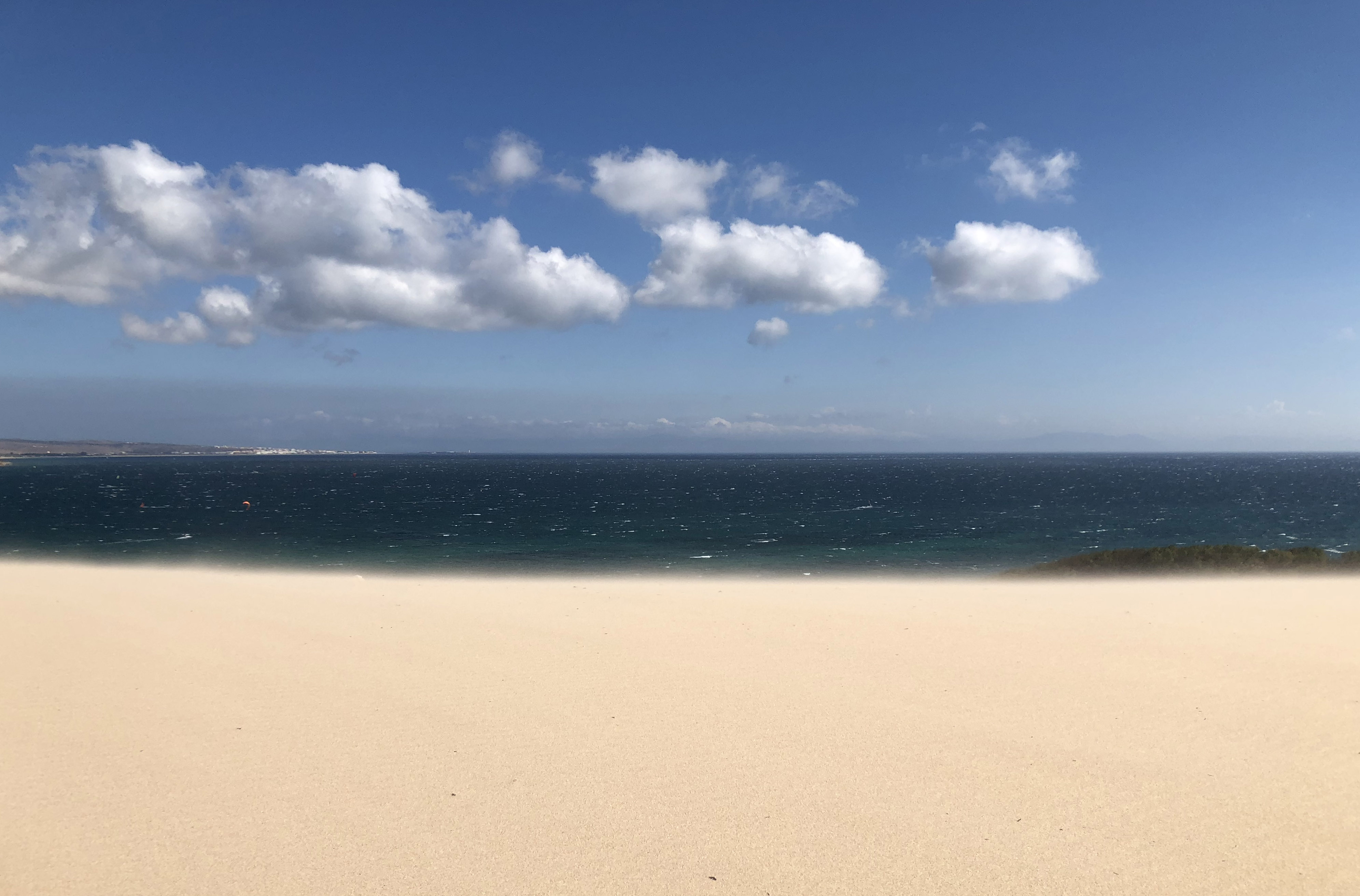 La Costa de la Luz si estende per chilometri verso nord ovest,  l’agitata acqua verde petrolio e la sabbia finissima si mischiano con il blu del cielo. Qui il vento è il padrone di casa. Non c’è momento della giornata in cui non ti schiaffeggi con rapidità fulminea.
