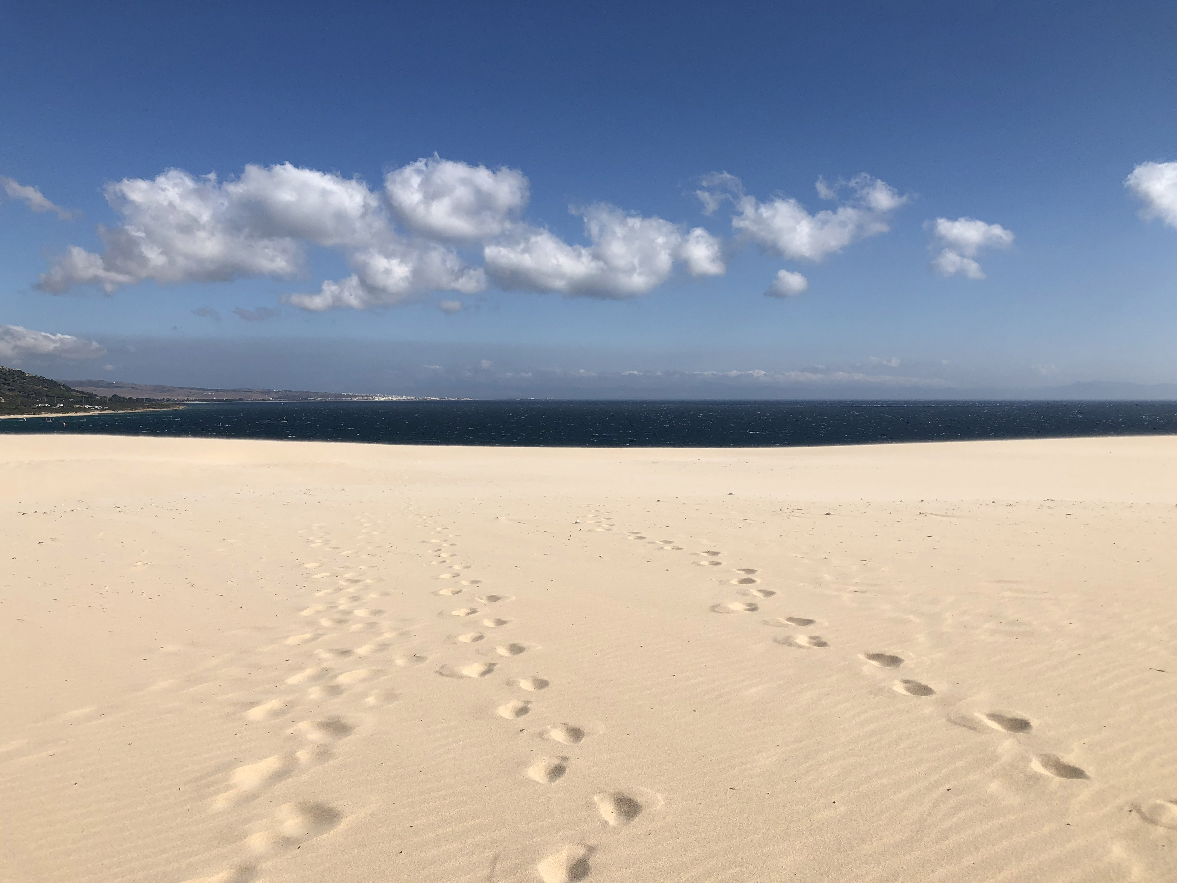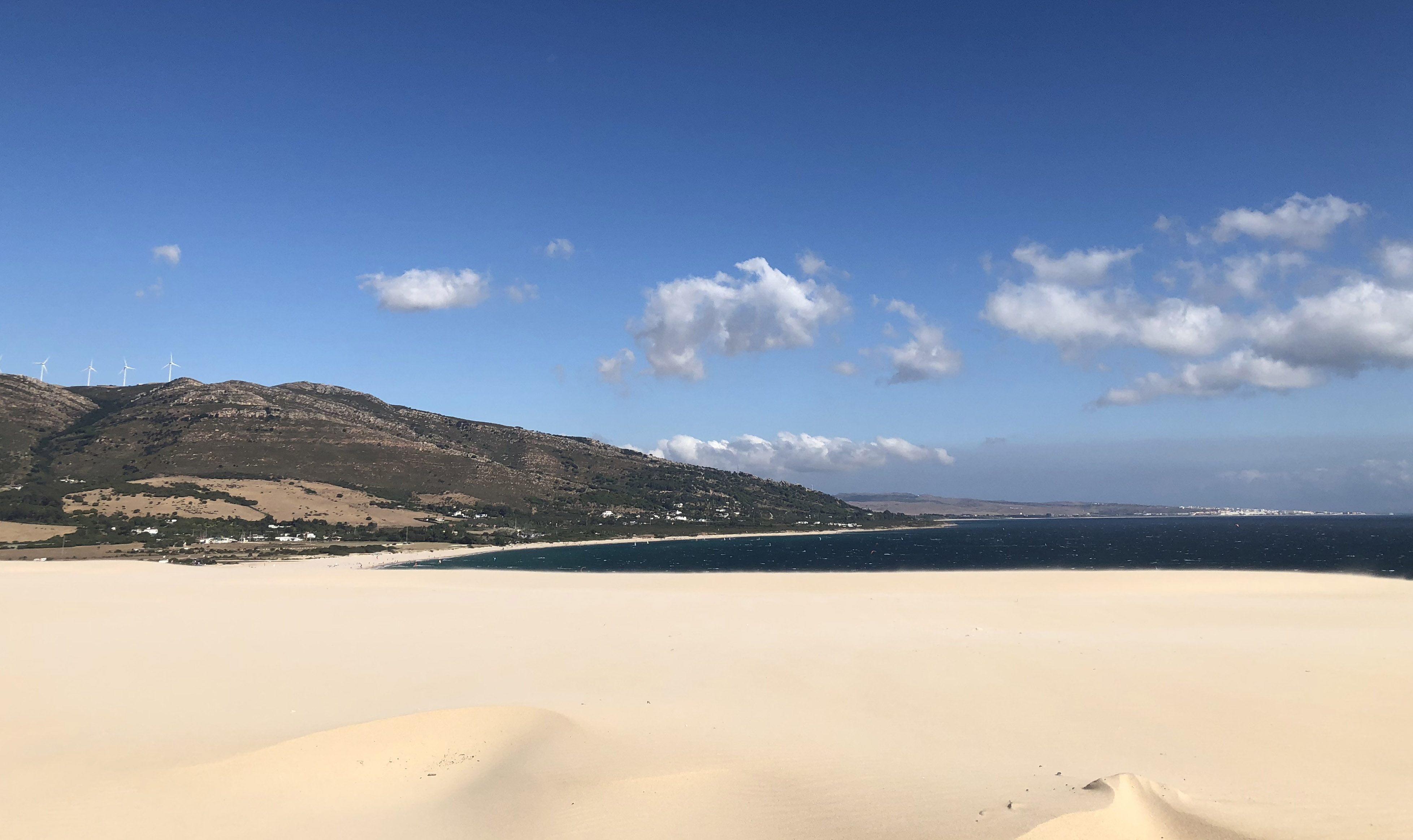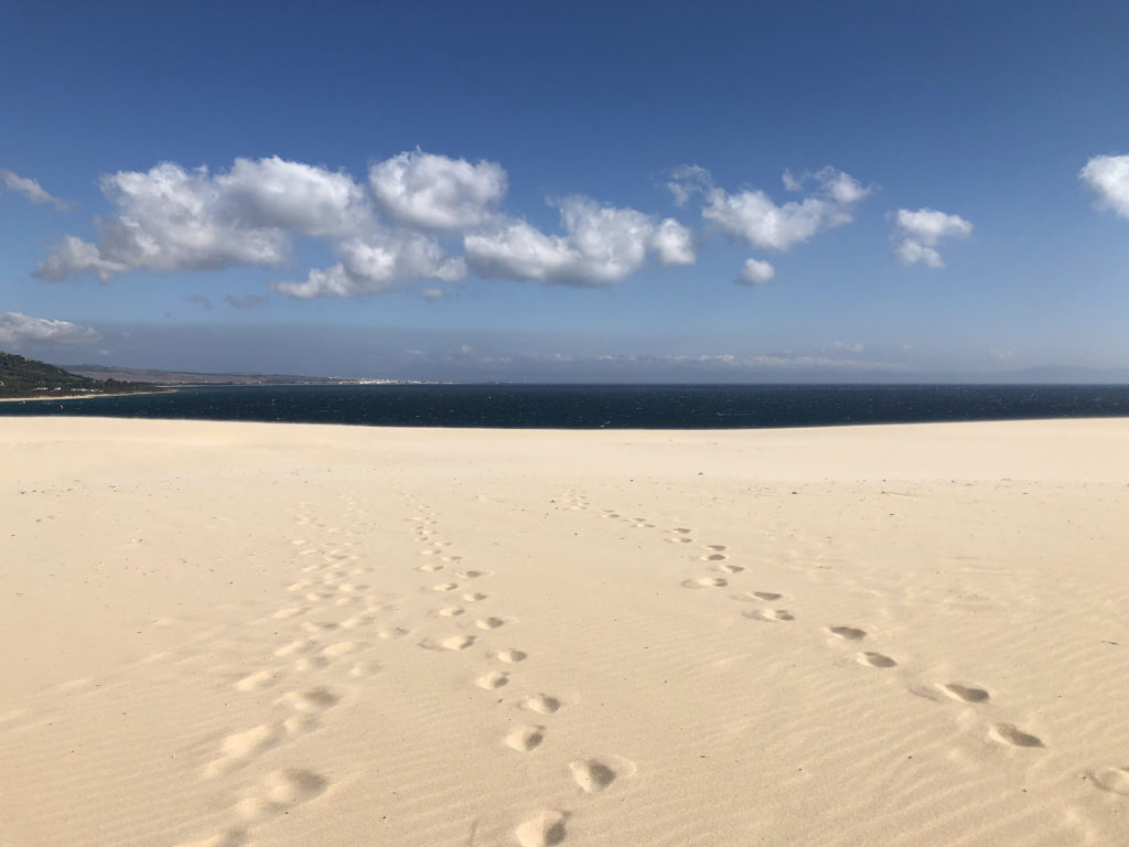 La Costa de la Luz si estende per chilometri verso nord ovest,  l’agitata acqua verde petrolio e la sabbia finissima si mischiano con il blu del cielo. Qui il vento è il padrone di casa. Non c’è momento della giornata in cui non ti schiaffeggi con rapidità fulminea.