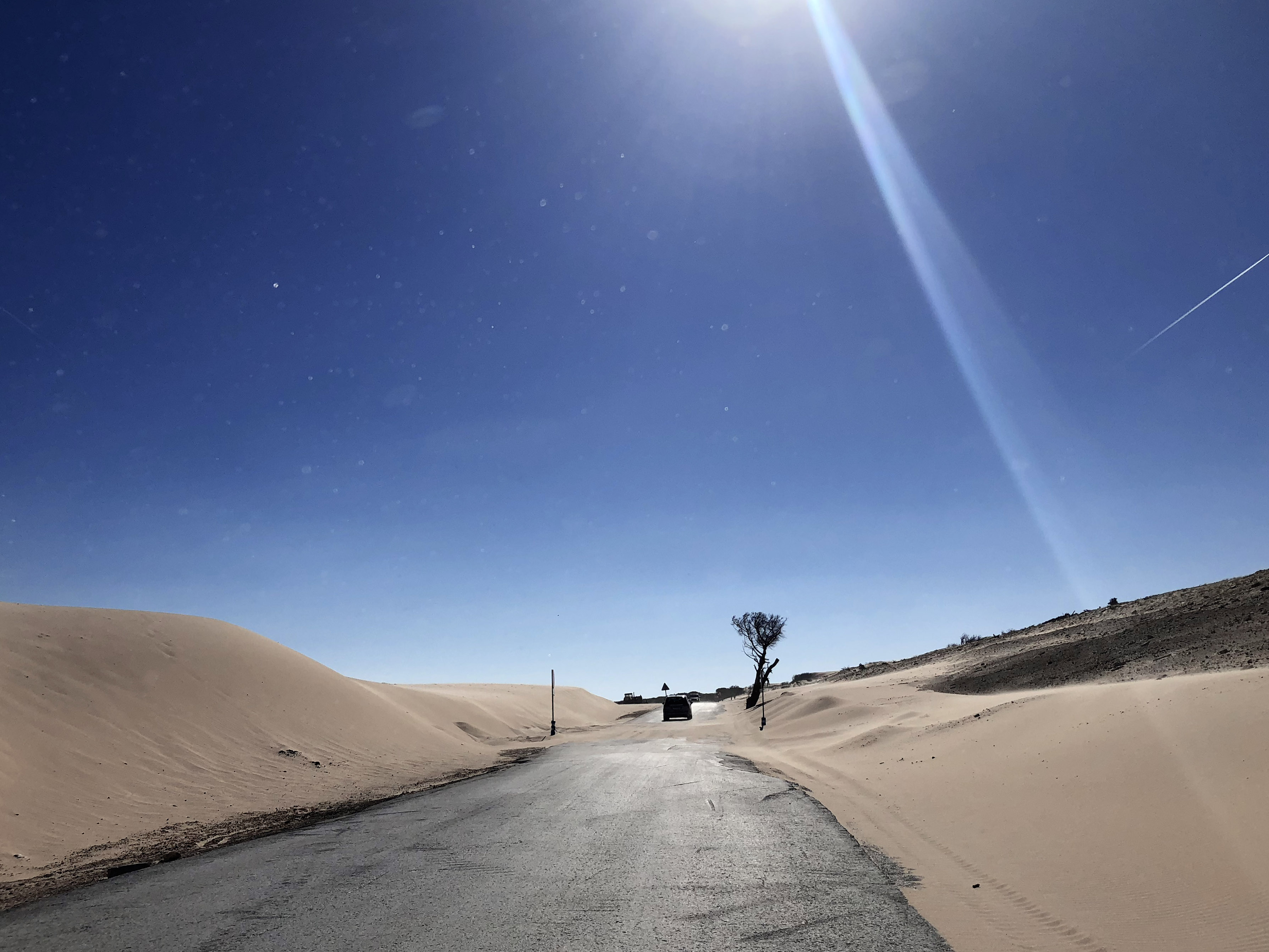 É una situazione stravagante, se così la si può definire, guidi su una normalissima strada tra arbusti e alberi verdi e dal nulla eccola! una duna che si muove sollevando i suoi granelli come fossero fumo.
