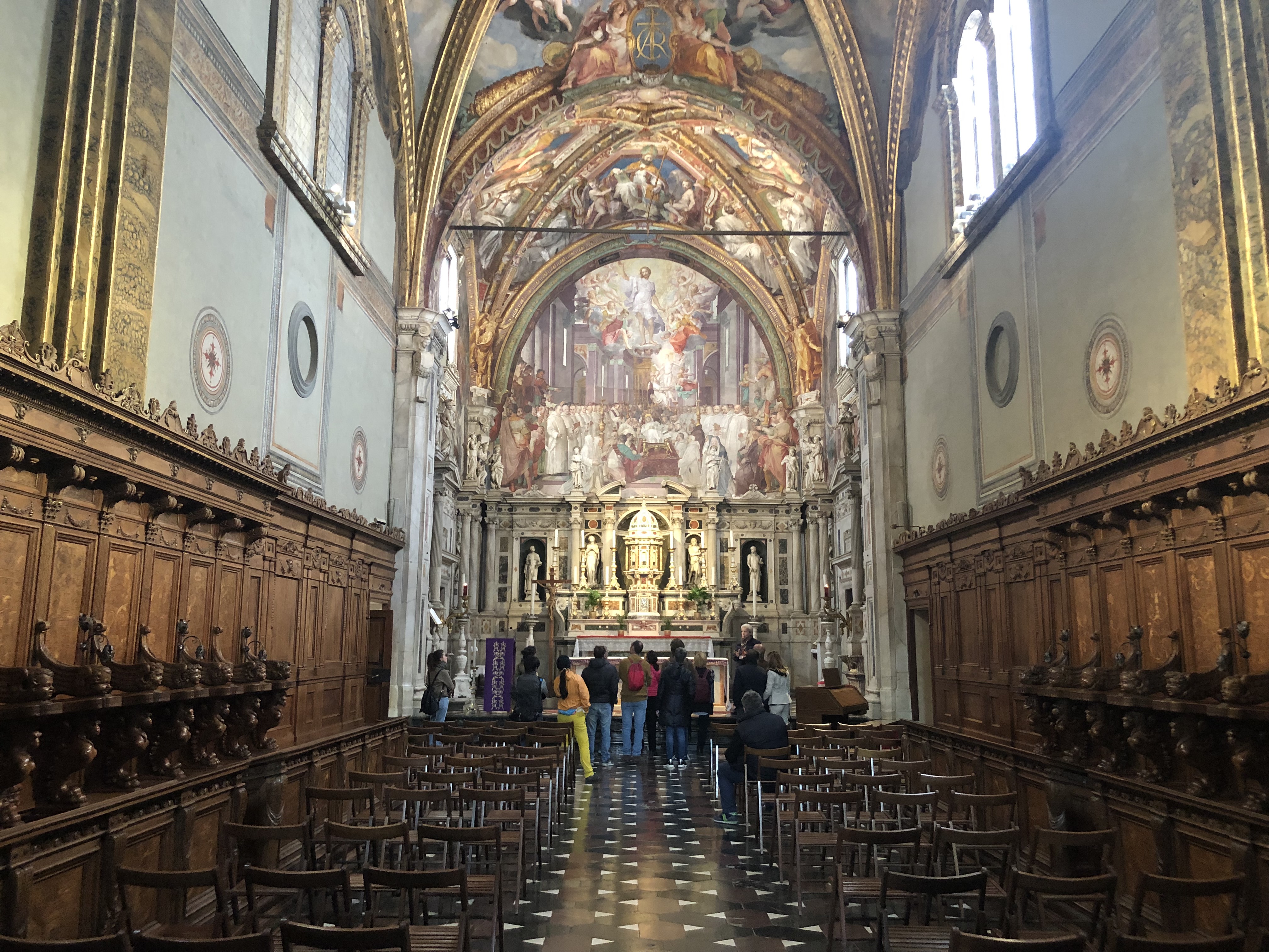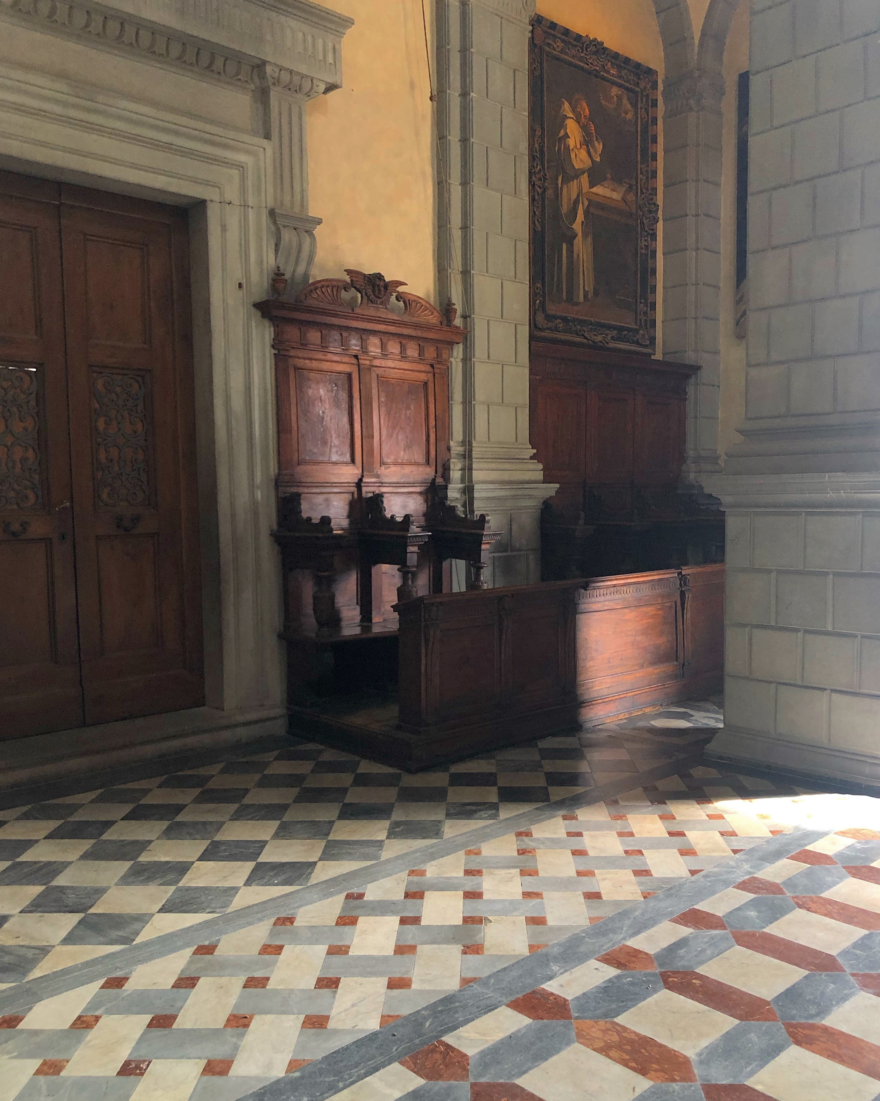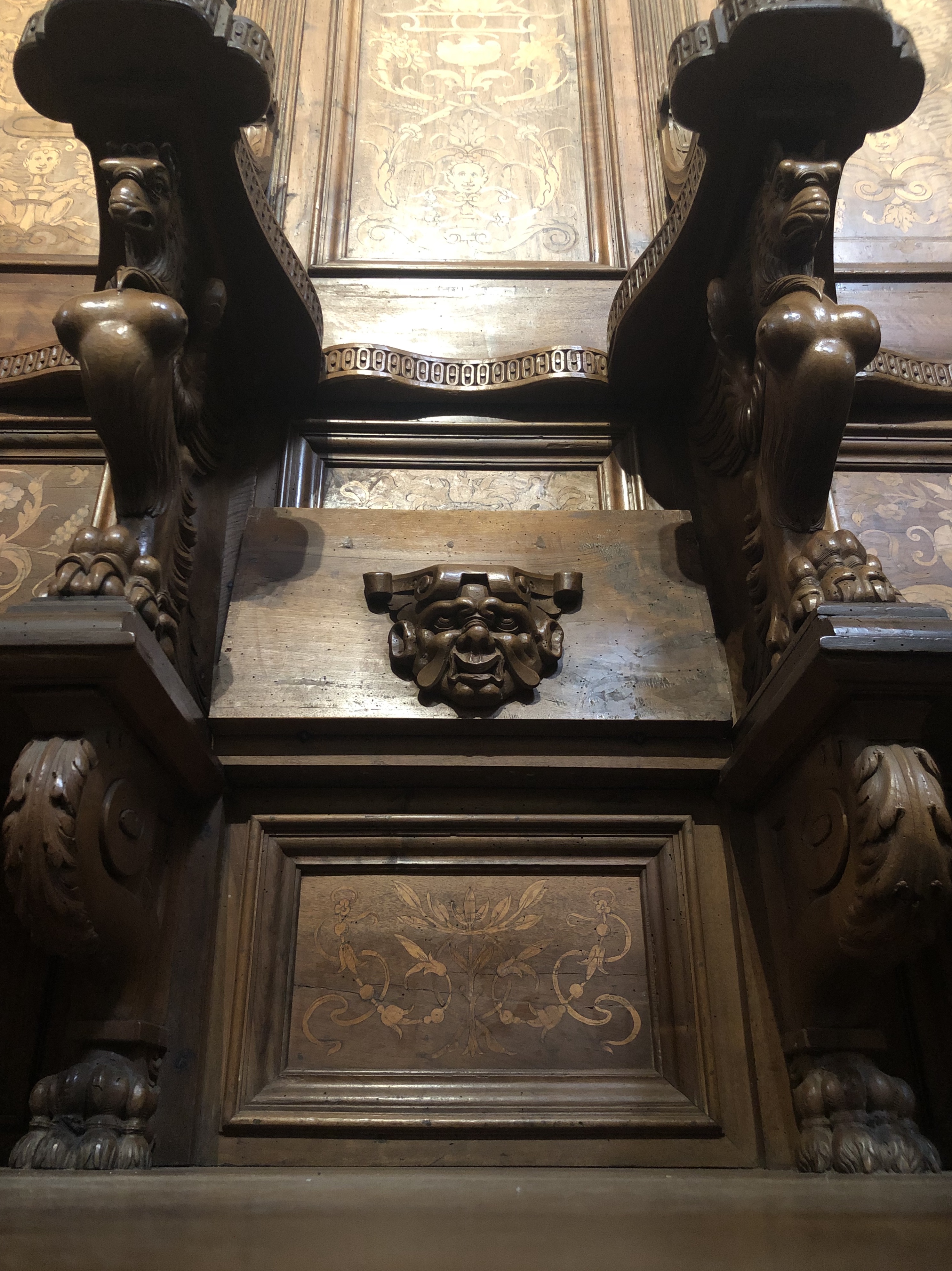 Dopo aver attraversato la prima sala con le opere del Pontormo, il chiostro e la chiesa di San Lorenzo, mi avvicino al coro fatto in legno di noce, costruito e intagliato con un incredibile maestria. Un’opera straordinaria con volti di putti, sedute scolpite a ribalta e intarsi geometrici.