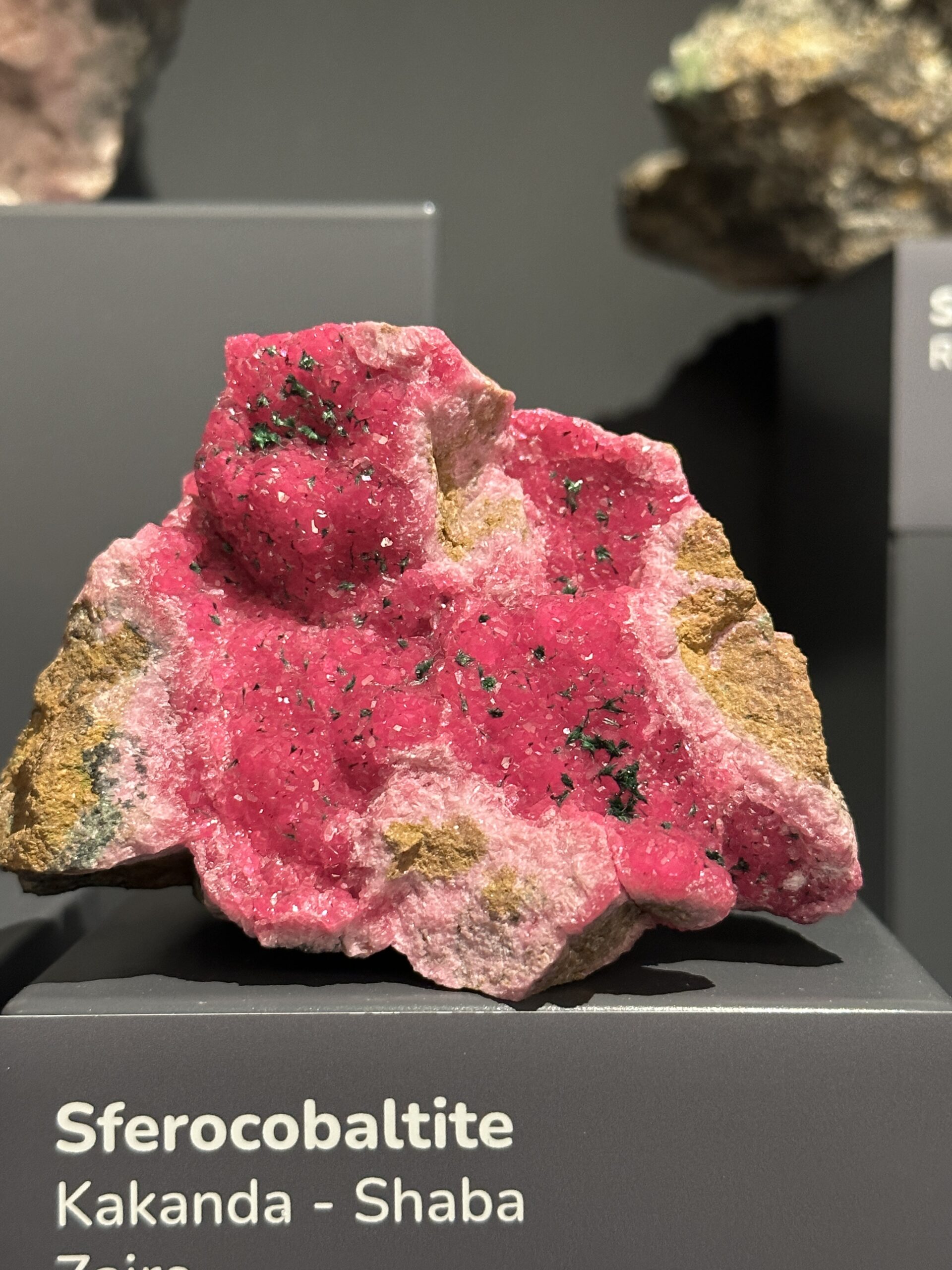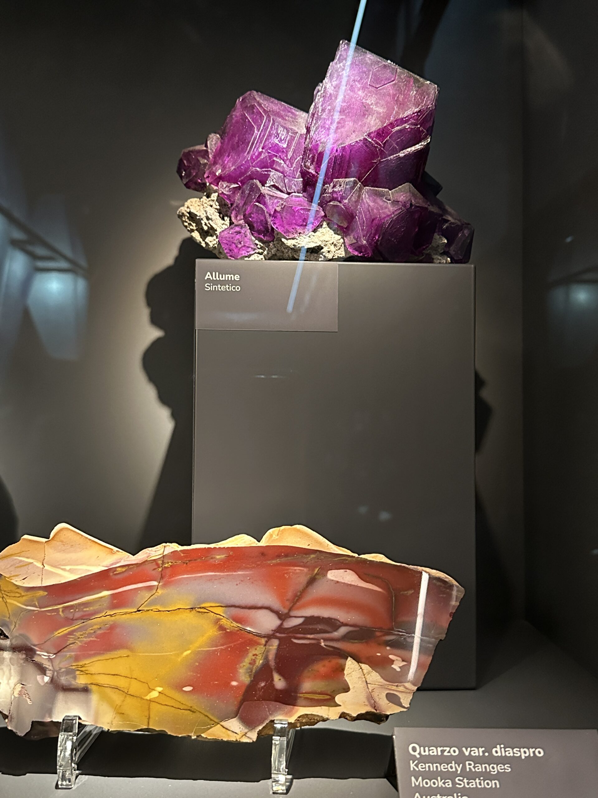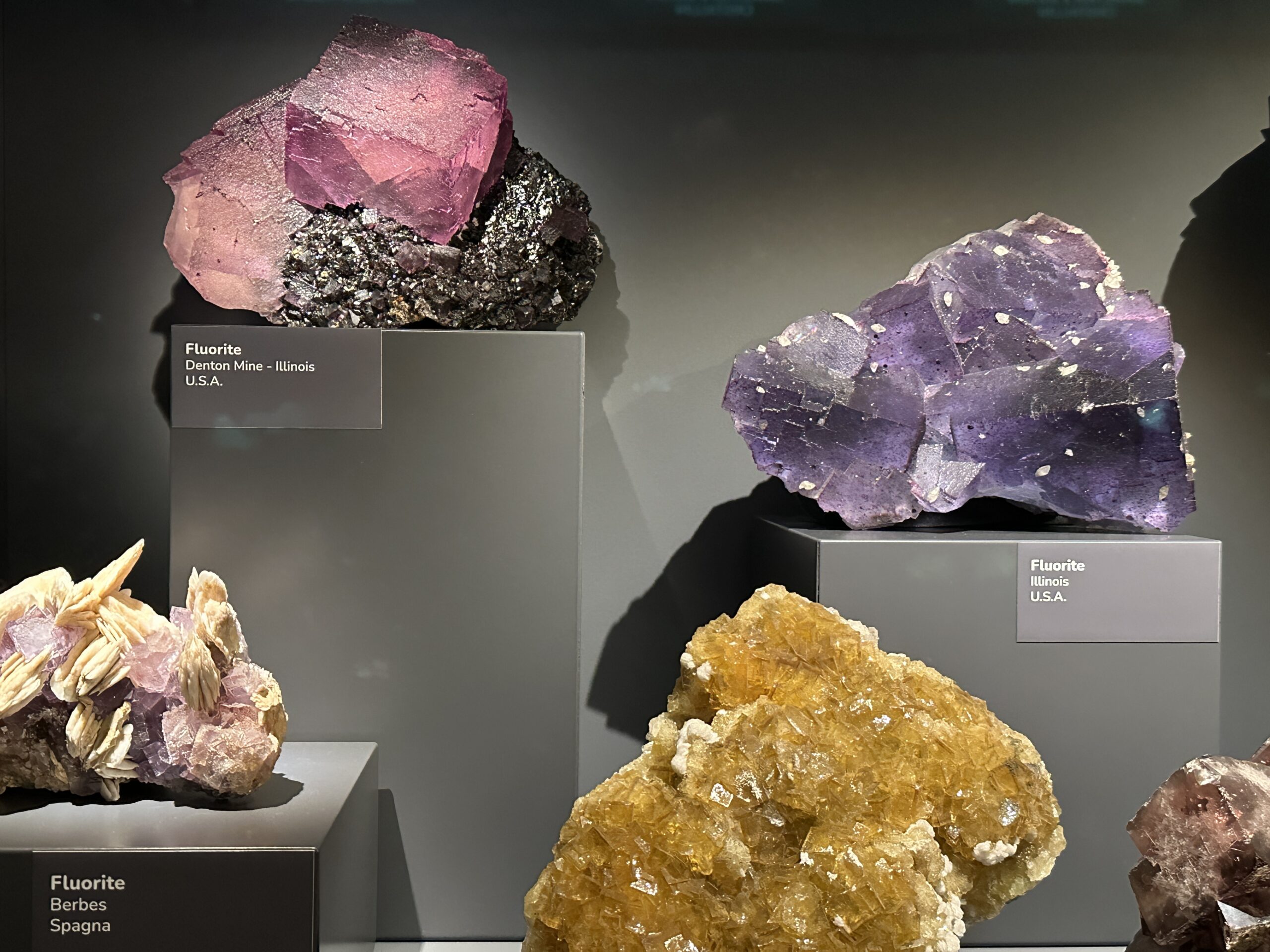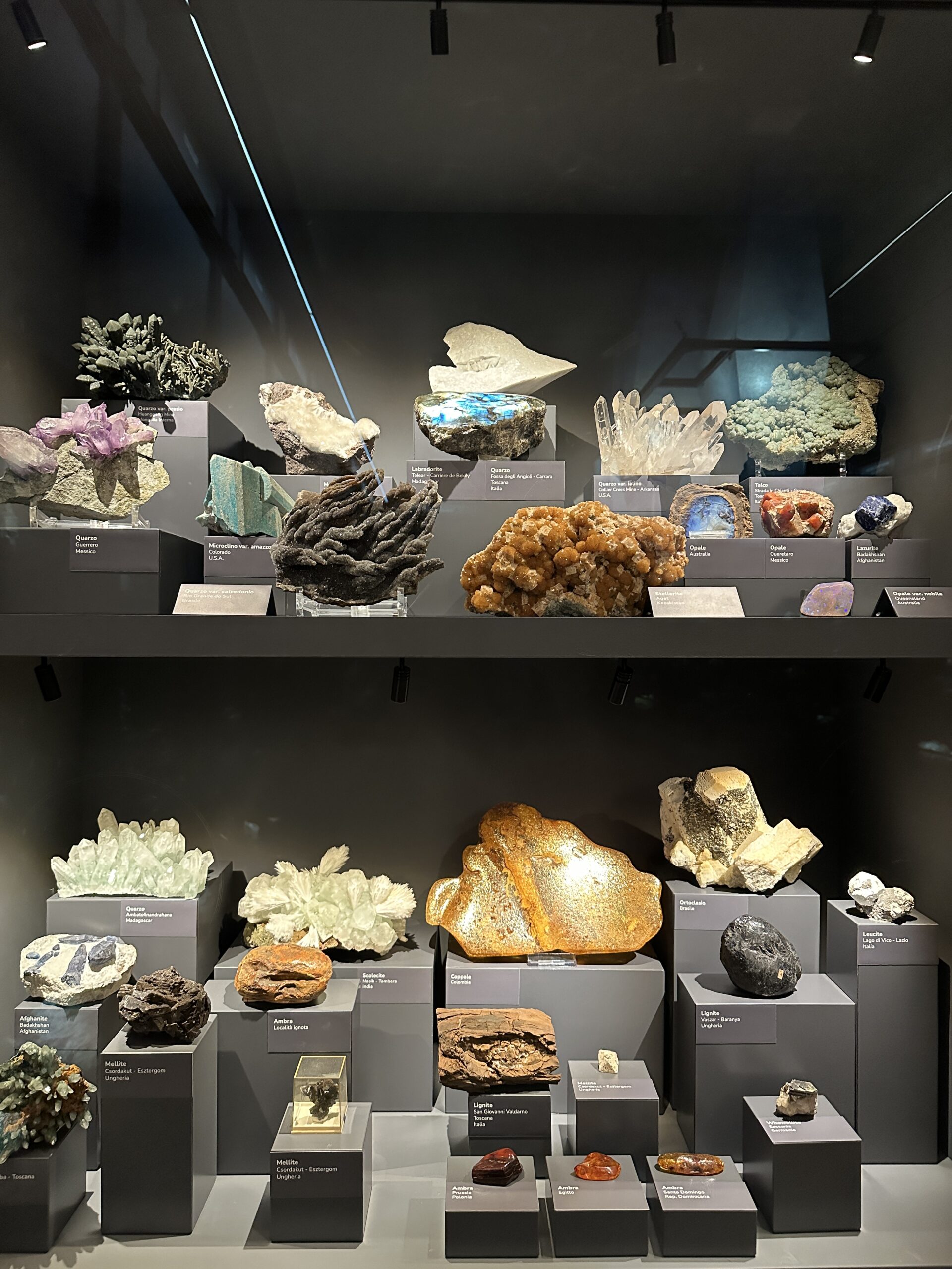 Pannelli scuri, luci molto soffuse stile locale equivoco, teche in vetro. I grandi pietre sono in bella mostra come fossero in una vetrina di alta gioielleria. É senza alcun dubbio la più bella collezione di minerali mai vista. I colori sono incredibili, forme sinuose, geometriche, morbide, granulose, lisce, ruvide, spigolose, frastagliate…è pazzesca la varietà di sfumature e consistenze. Purtroppo non ci sono etichette descrittive né manuali da poter consultare, ma solo piccoli cartellini con il nome della pietra proprio al di sotto di essa. Peccato, avrei apprezzato una presentazione più dettagliata, magari che mi suggerisse la consistenza che ha quel minerale al tatto, l’età della pietra, come e dove viene estratta, l’ utilizzo che se ne può fare, quanto sia preziosa o rara, cose del genere insomma. Nella saletta attigua a quella principale ci sono degli armadi con cassetti in vetro, peccato che non si possano aprire per guardarne il contenuto. C’è anche l’angolo delle pietre fluorescenti. Al buio i colori sono incredibili, sembra di stare ad un rave party, o ad un concerto dei Coldplay. Passo davvero molto tempo in queste sale perché sono letteralmente rapita da questi colori e starei ore ad contemplare il genio e la meraviglia della Natura.