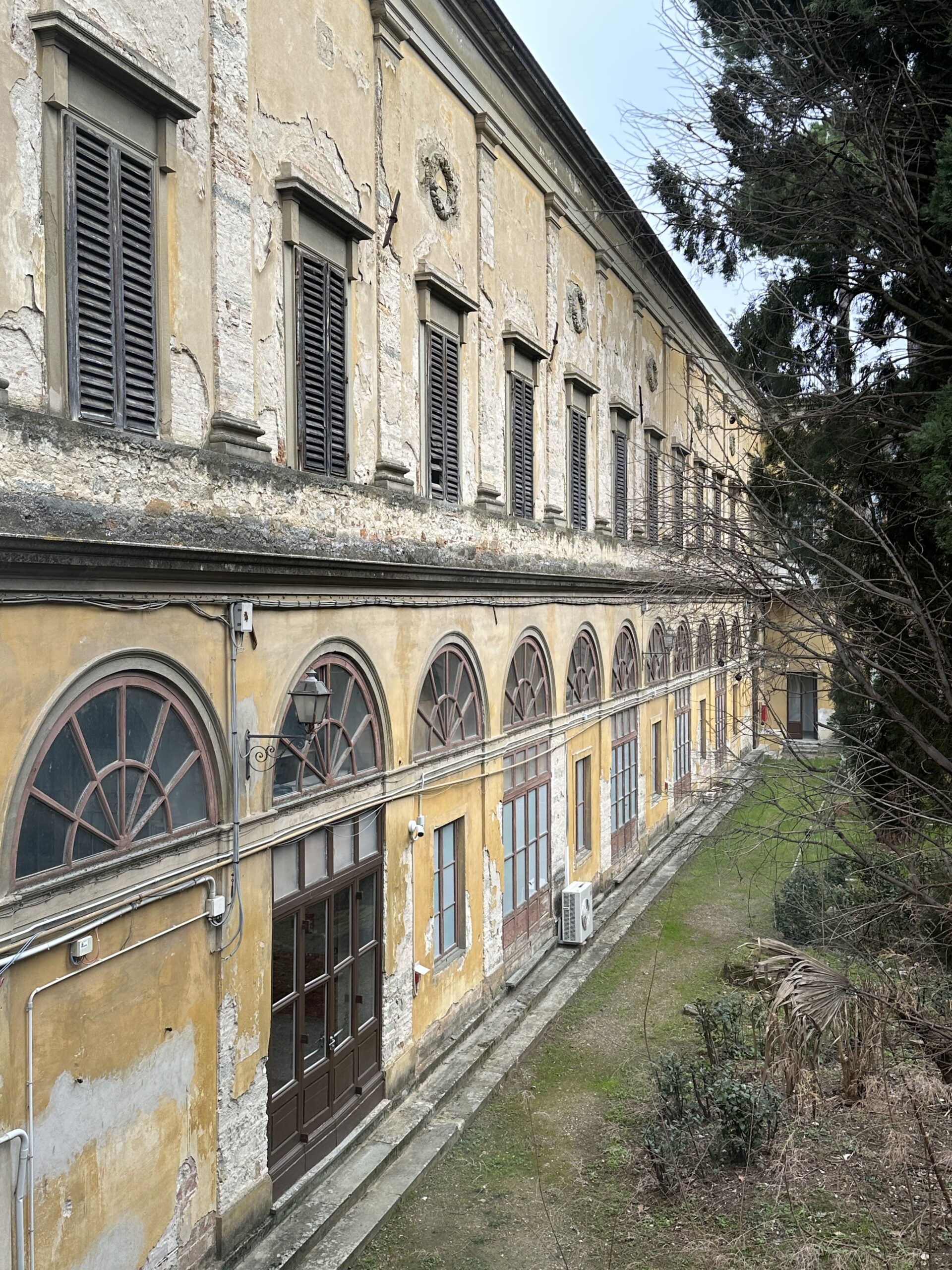 Dopo aver guadagnato l’accesso alla prima sala, il silenzio cala imbarazzante, come ad un primo appuntamento nel quale, improvvisamente, nessuno dei due ha più nulla da dire. Si notano cornicioni scrostati, pareti da ristrutturare e, affacciandosi sul cortile interno attraverso le vecchie porte finestre, è possibile osservare che anche tutte le facciate esterne sono totalmente rovinate.