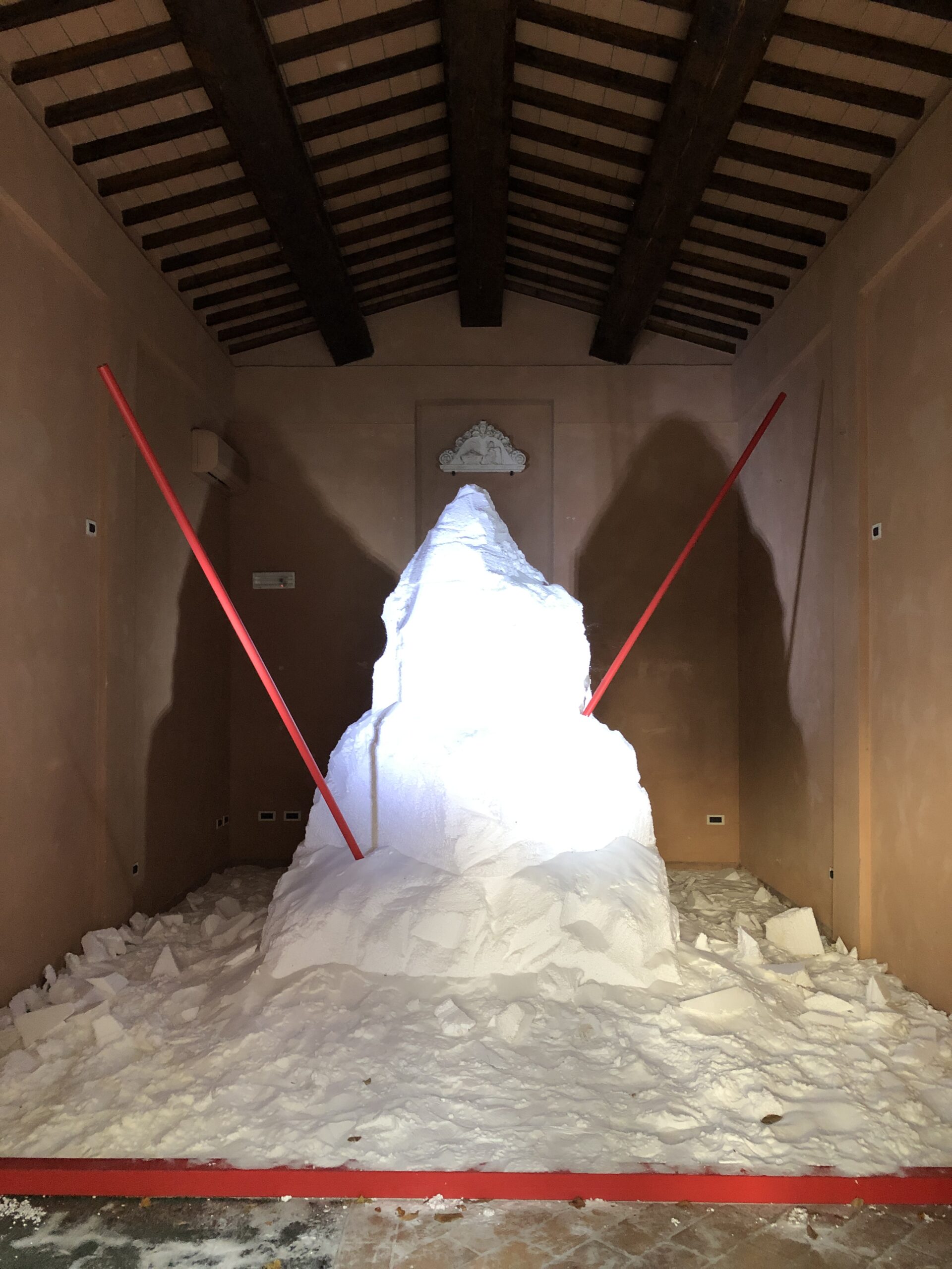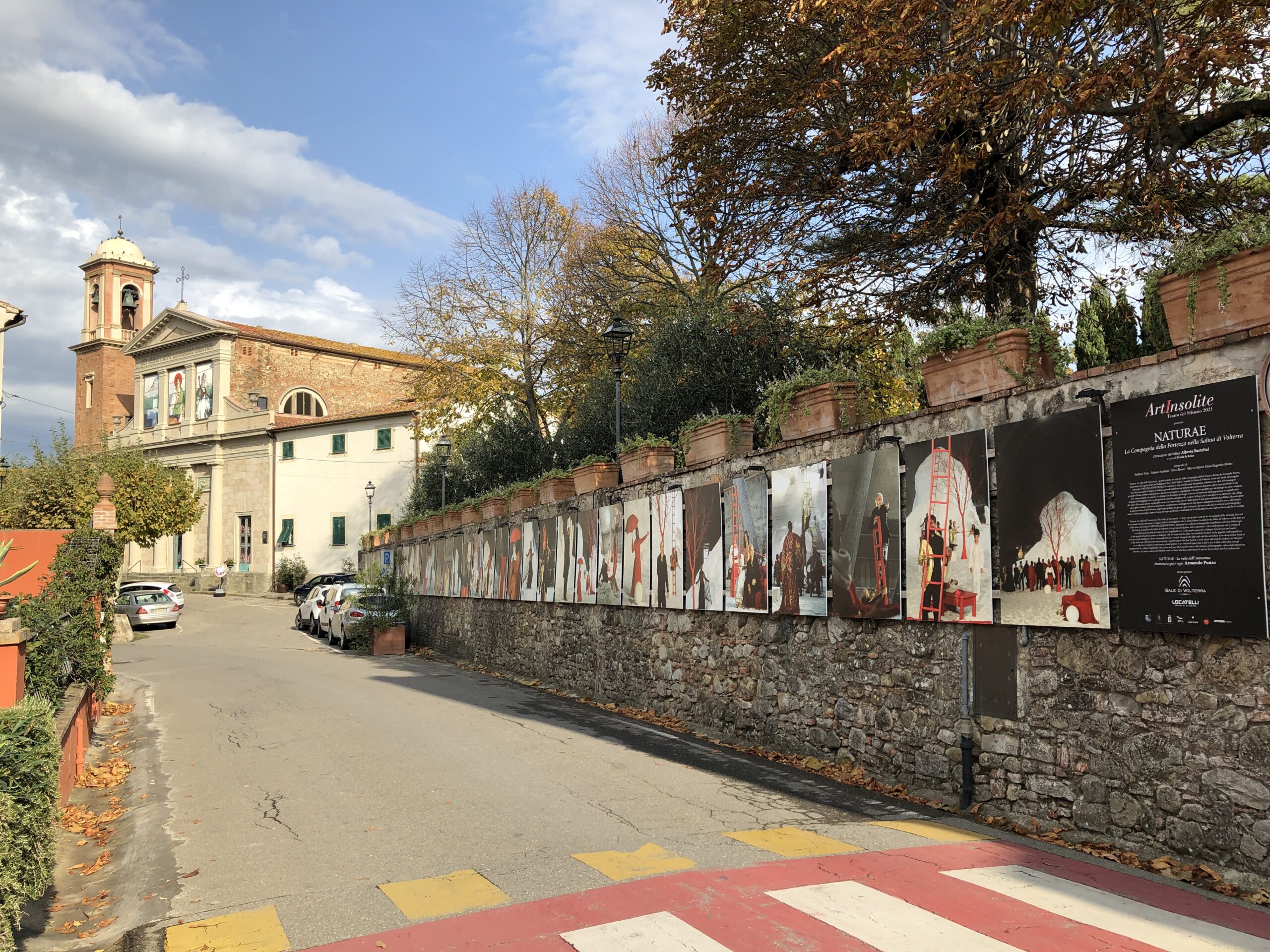 Ci sono bandoni dei negozi dipinti (se non li avessi trovati chiusi non li avrei mai visti), statue, gigantografie che ritraggono scene di spettacoli teatrali, una piccola cappella è stata riempita con un cumulo di sale, quadri e piccoli murales, bandiere e segnavento, e, per non farsi mancare nulla, ci sono anche parti di scenografie dismesse dal vicino Teatro del Silenzio.