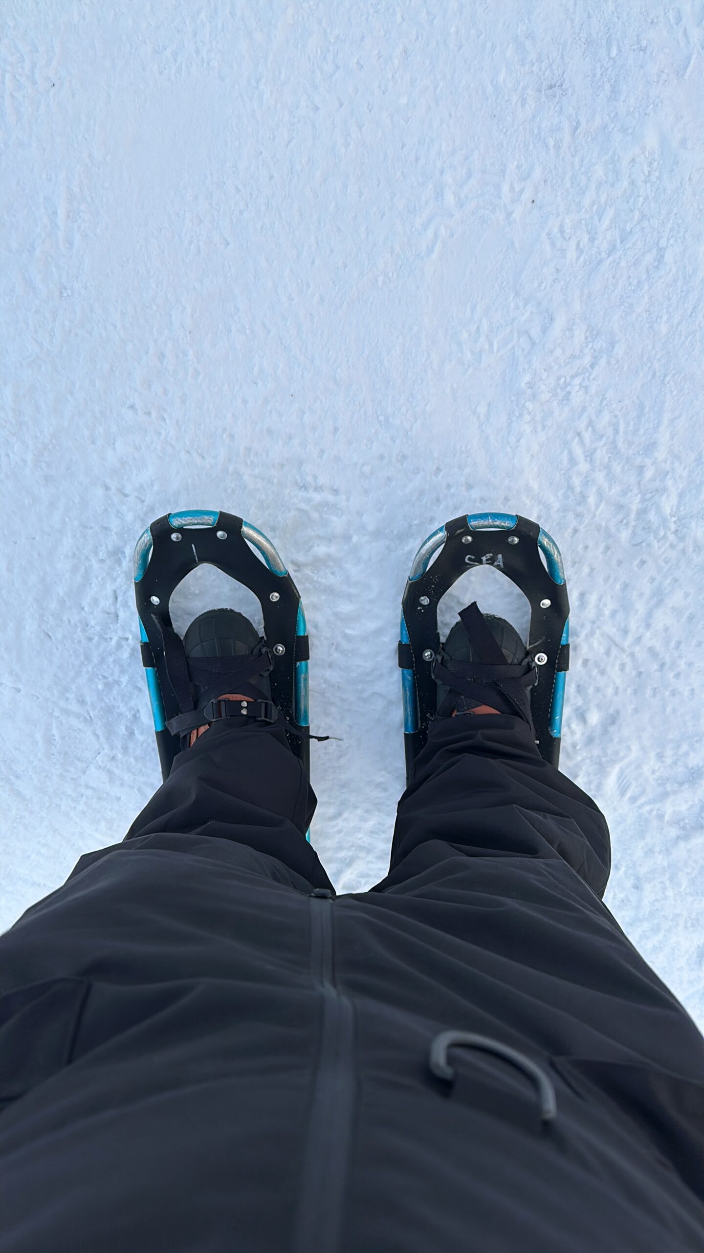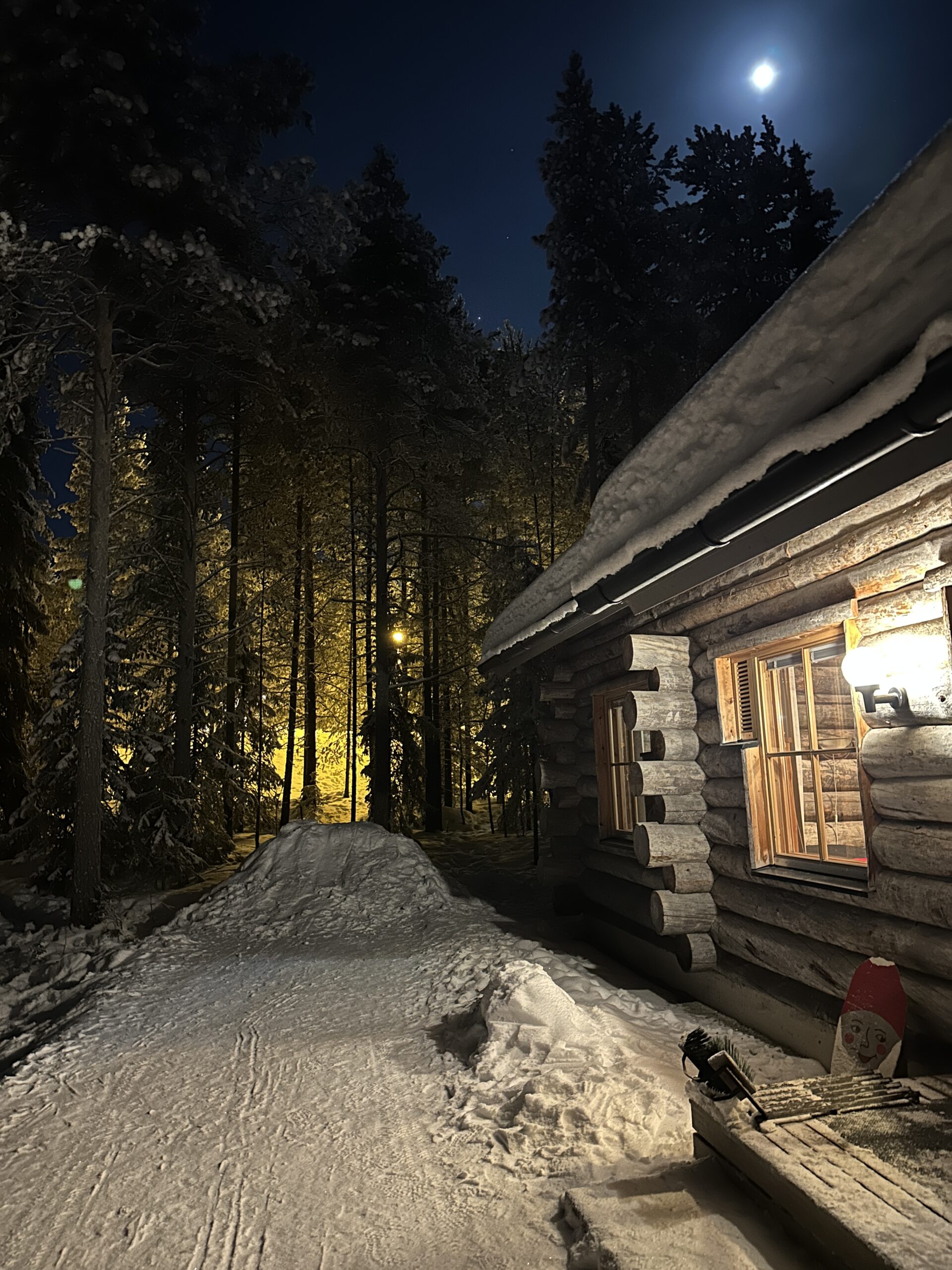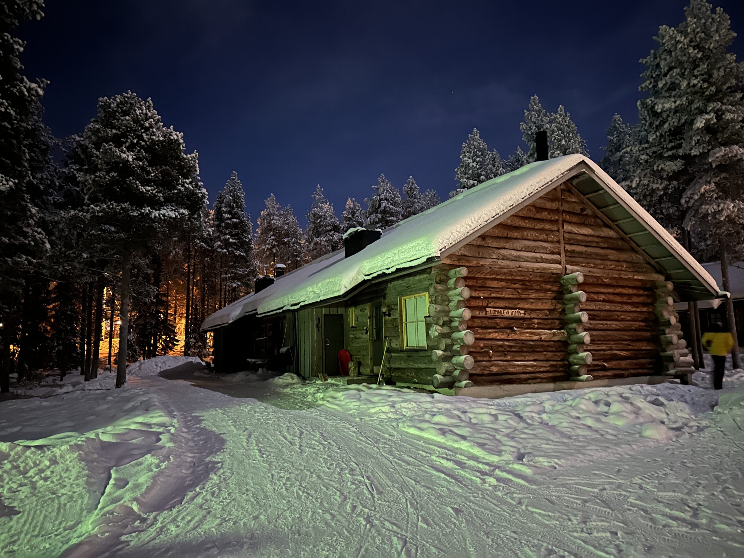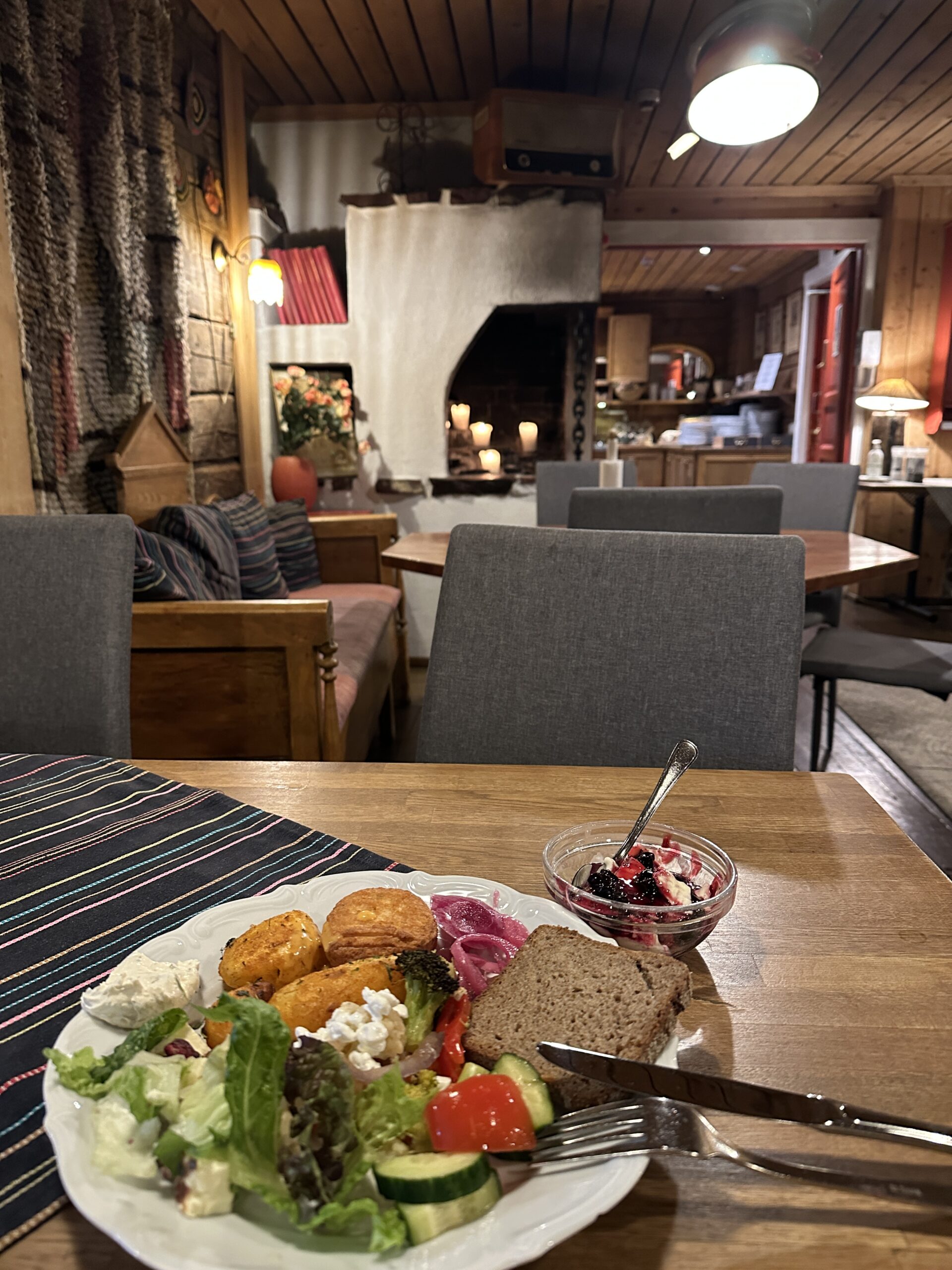 Raggiungiamo il locale ed è bello come tutte le strutture qui intorno, fatto da grossi tronchi di alberi messi uno sull’altro e le vetrate enormi che affacciano sul lago ghiacciato. Pura poesia per gli occhi.