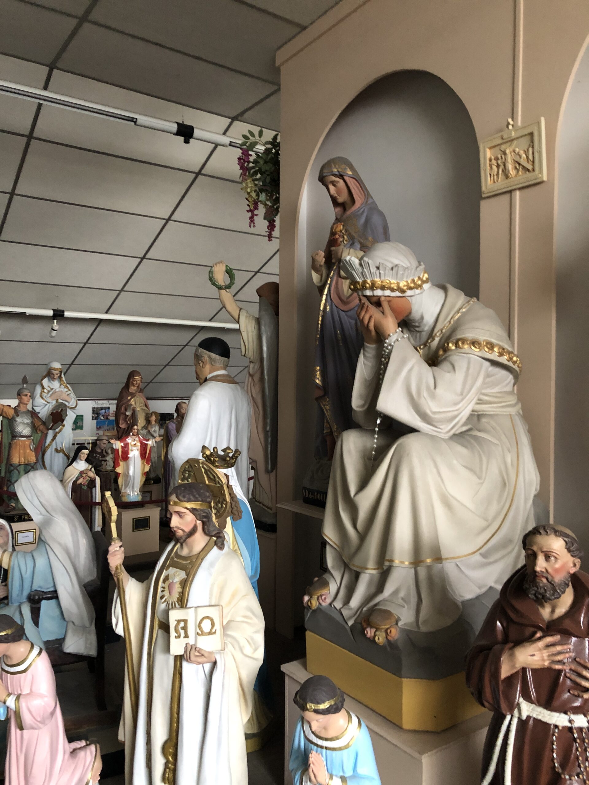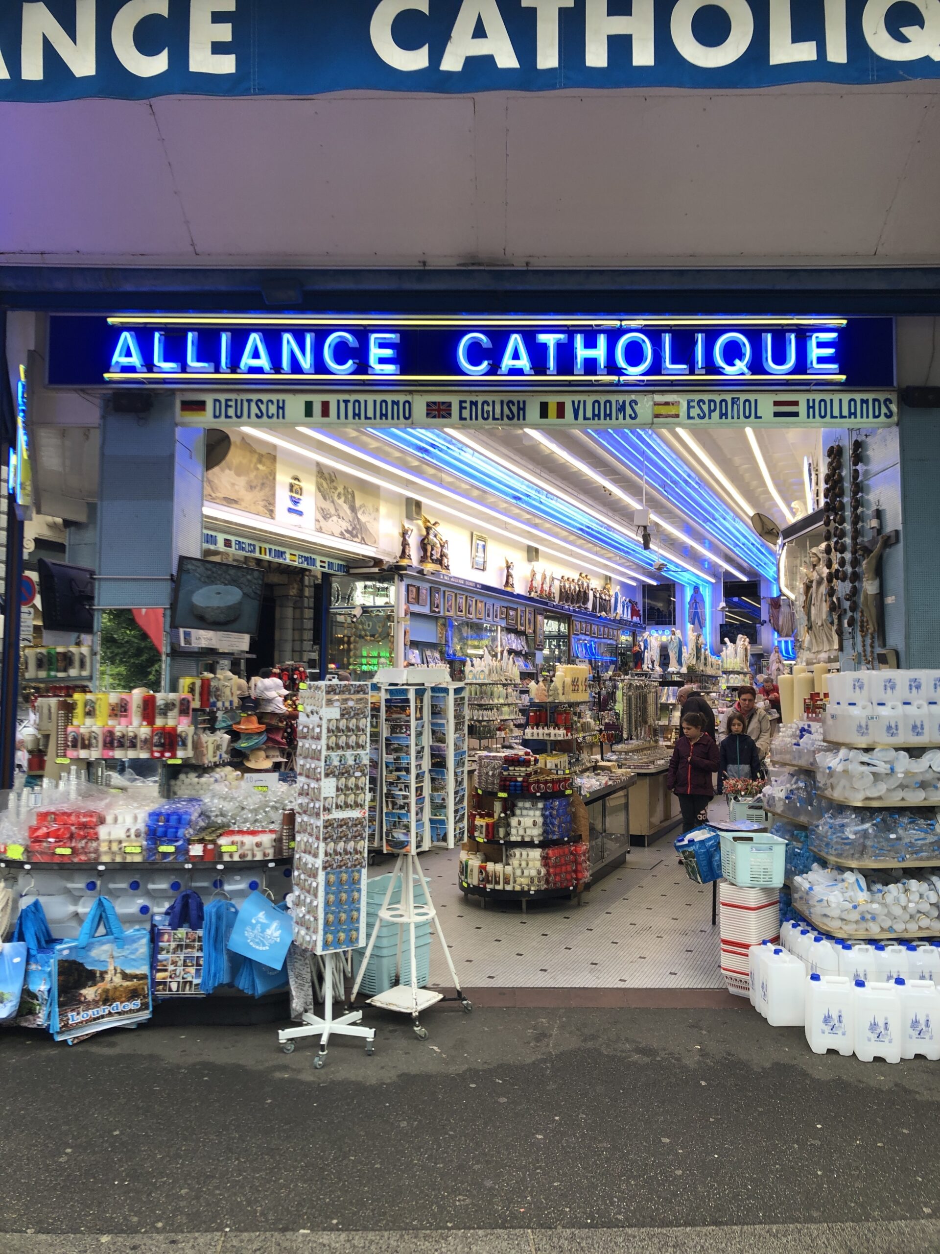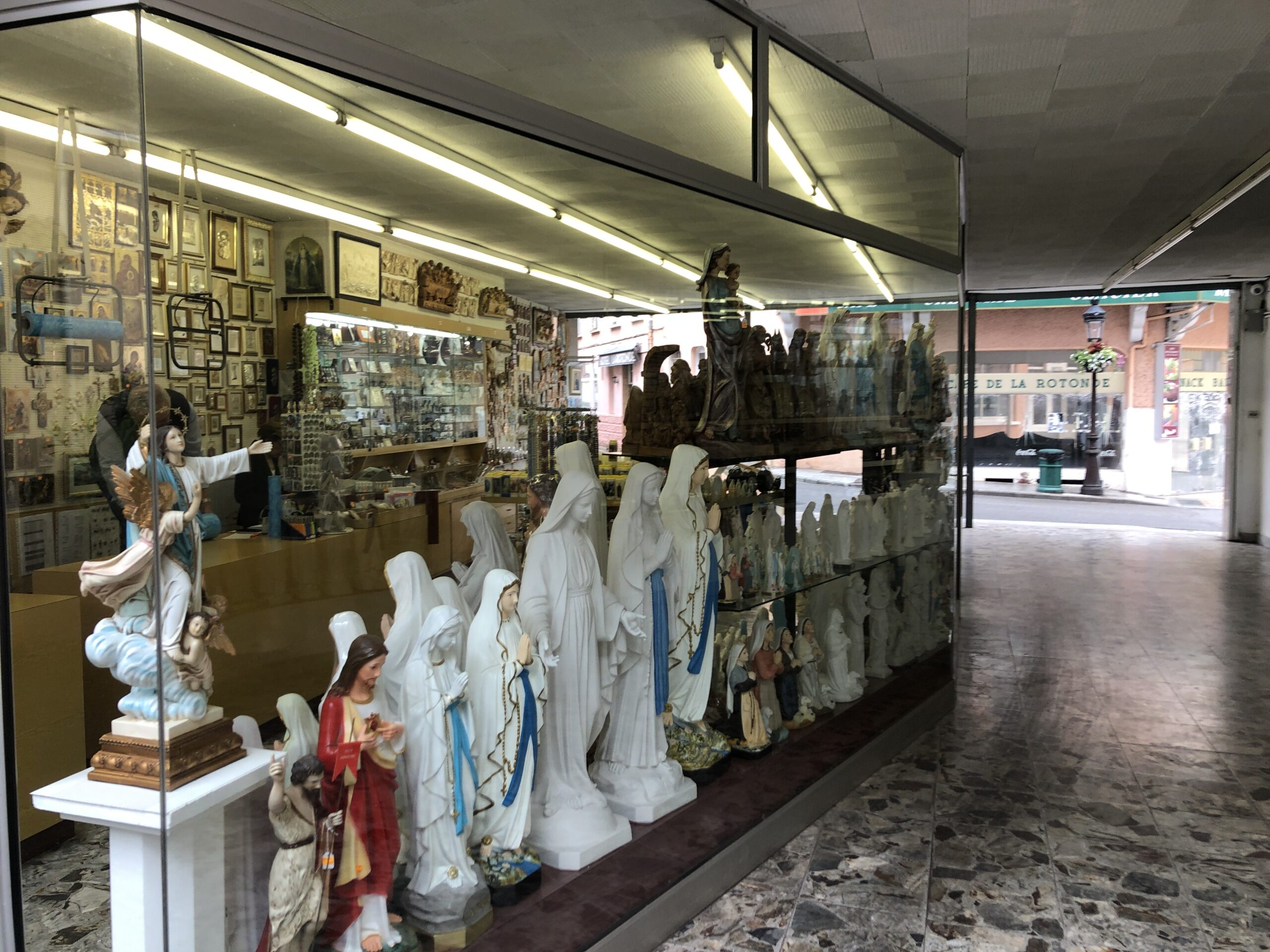 I negozi non hanno vetrine, sono come bocche aperte dalle quali fuoriesce cibo. Sui marciapiedi antistanti gli espositori girevoli le vetrinette e gli scaffali, mostrano una miriade di oggetti impilati sapientemente uno sull’altro. Ci sono bidoncini per conservare l’acqua santa di ogni dimensione e fattezza, croci, immagini sacre, rosari, bigiotteria e gioielleria, vestiario e zaini; qualsiasi cosa sulla quale può essere appiccicata la sagoma di una madonna velata potete trovarla qui. Posate, quaderni, astucci, portachiavi, ombrelli, impermeabili, fermagli per capelli…mi ricorda il ‘Gold and Silver Pawn Shop’ (il negozio del programma tv ‘affari di famiglia’ girato a Las Vegas appunto) dove persino la carta igienica aveva i volti dei proprietari stampati sopra (qui per fortuna non siamo arrivati a tanto). Considerando che la prima forma pubblicitaria al mondo è stata il santino di carta, direi che in quanto a strategie marketing ed oggettistica la Chiesa sia ancora sul pezzo.