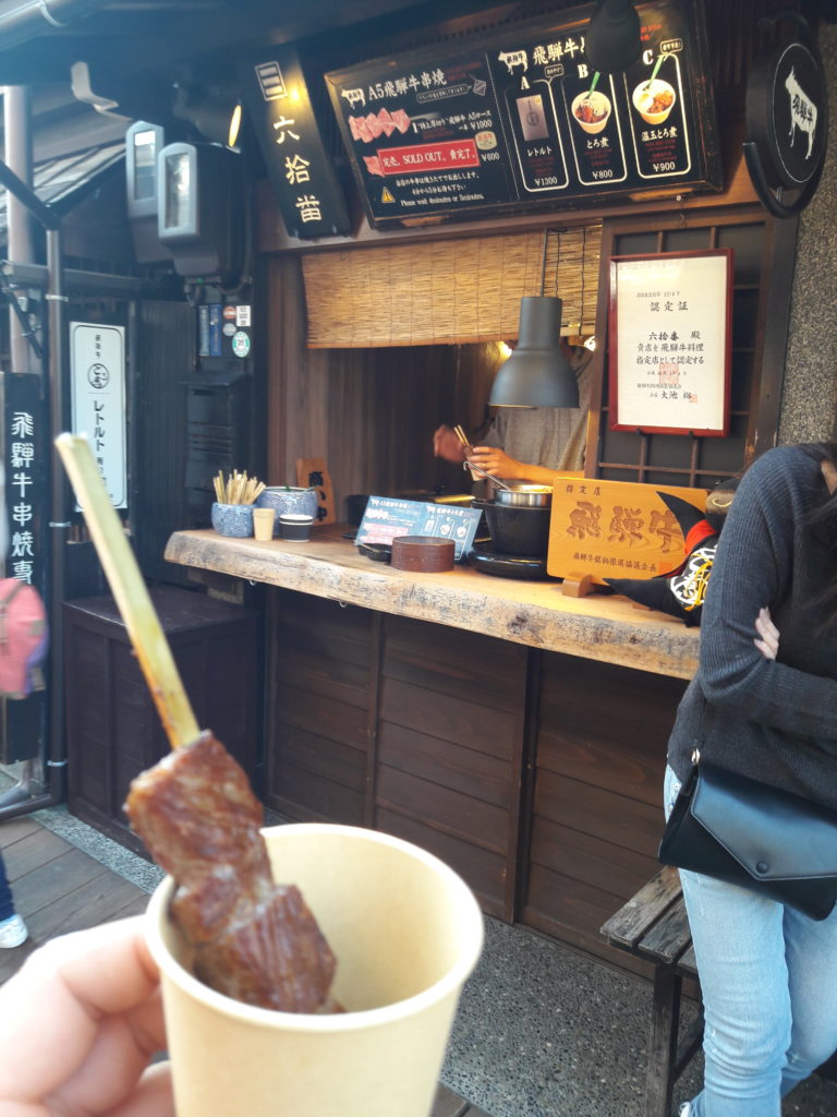 Se non avete avuto tempo e sopratutto se non avete voglia di spendere molti soldi per un piatto di carne, allora fermatevi ad assaggiare uno spiedino di carne della ancor più delicata Hida beef a Takayama. Le 14 euro meglio spese (a spiedino!) ogni boccone era pura estasi per le mie papille. Morbidissima, ben cotta, salata al punto giusto e dopo un paio di morsi si era già sciolta come burro. Consiglio l’assaggio. (ma sappiate che vi sarà difficile fermarvi al primo spiedino!)