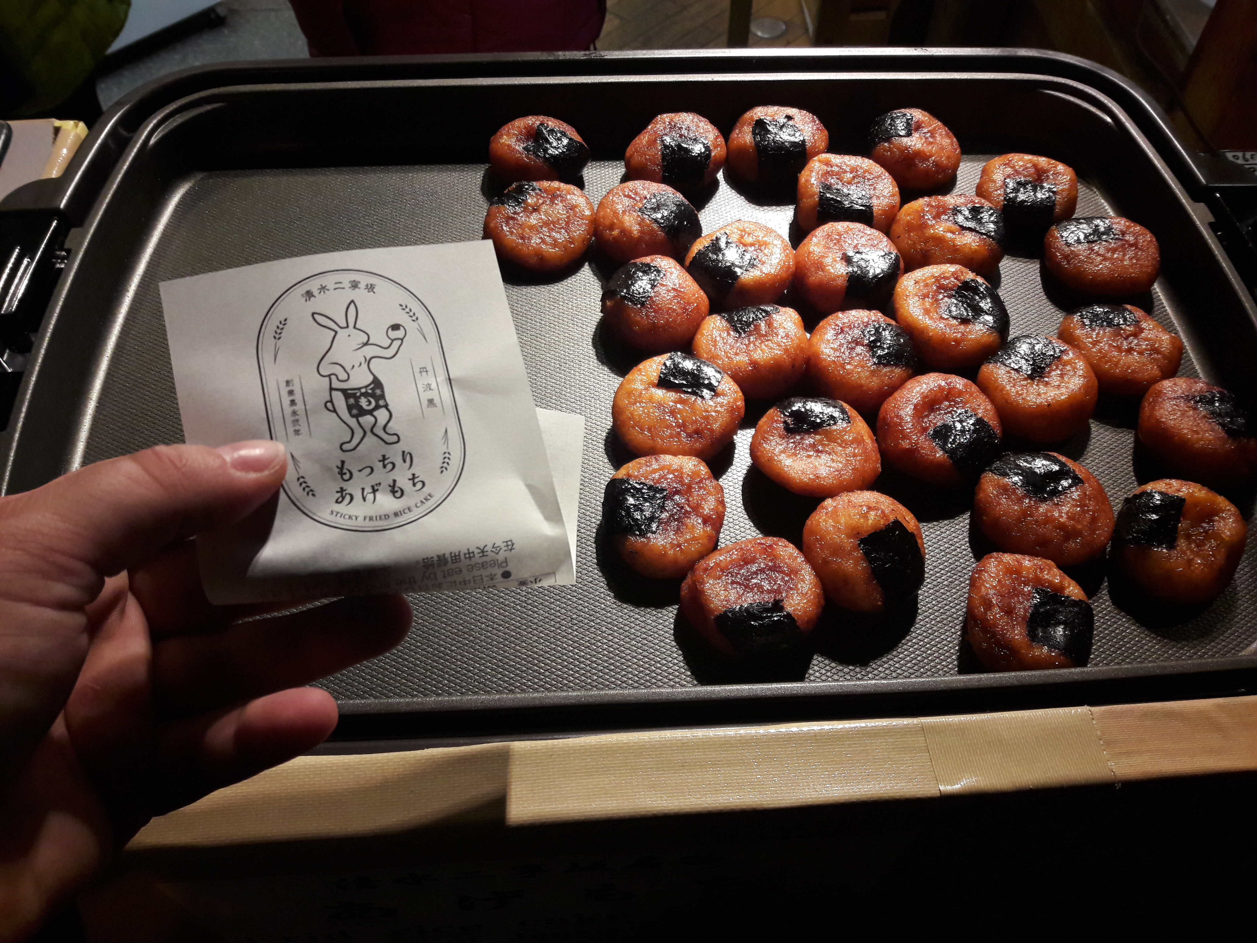 Riso. Lo street food più comune. Nella versione spiedino: palline appiccicosissime dolci con una glassa di zucchero alla soya. A me non sono piaciute. Ci sono anche le palline calde con alga. Ottime come aperitivo, anch’esse gommose ma con il sapore di acciuga e soya, non male da accompagnare ad una birra fresca.