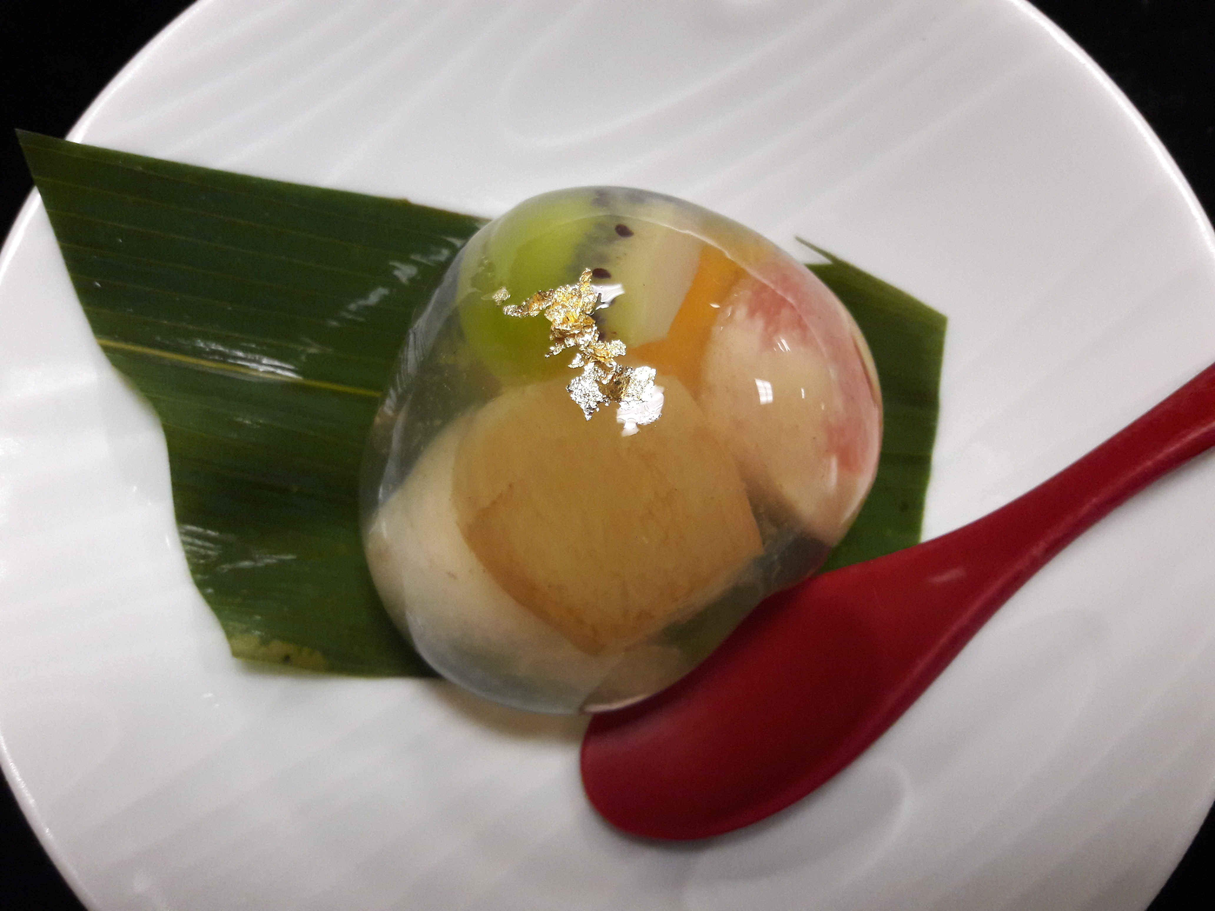 Frutta fresca in una gelatina di acqua e foglie d’oro. Fresco e originale, un’ottimo fine pasto. Peccato finisca in due bocconi.