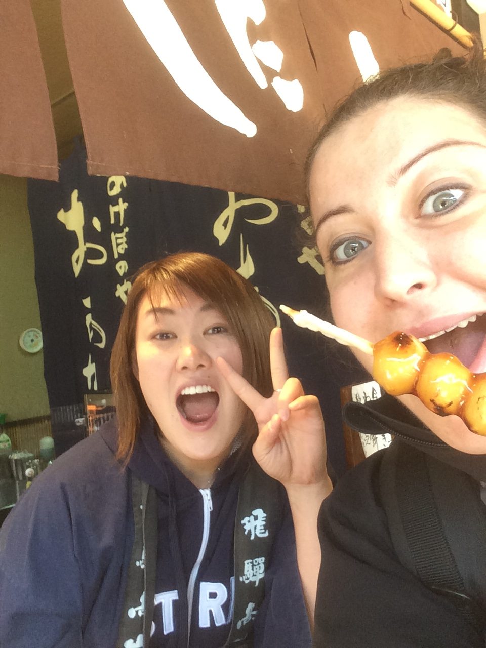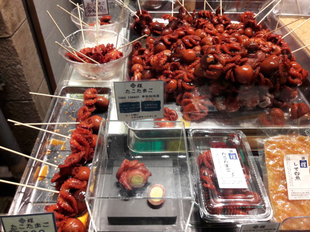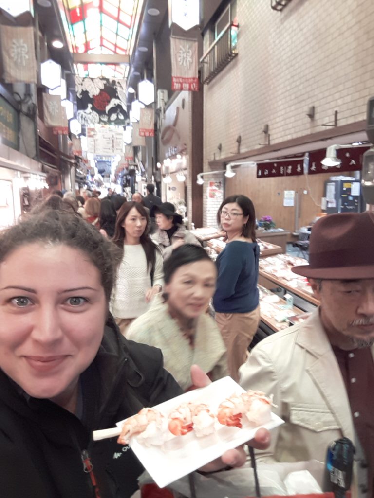 Altre cose strane da poter assaggiare? Il pesce in spiedini al mercato alimentare di Kyoto. Ci sono pesci e molluschi di ogni tipo, io ho preso i gamberoni alla piastra cosparsi di limone fresco, ma c’erano molte cose stranamente invitanti come ad esempio piccoli polipi ripieni di uovo.