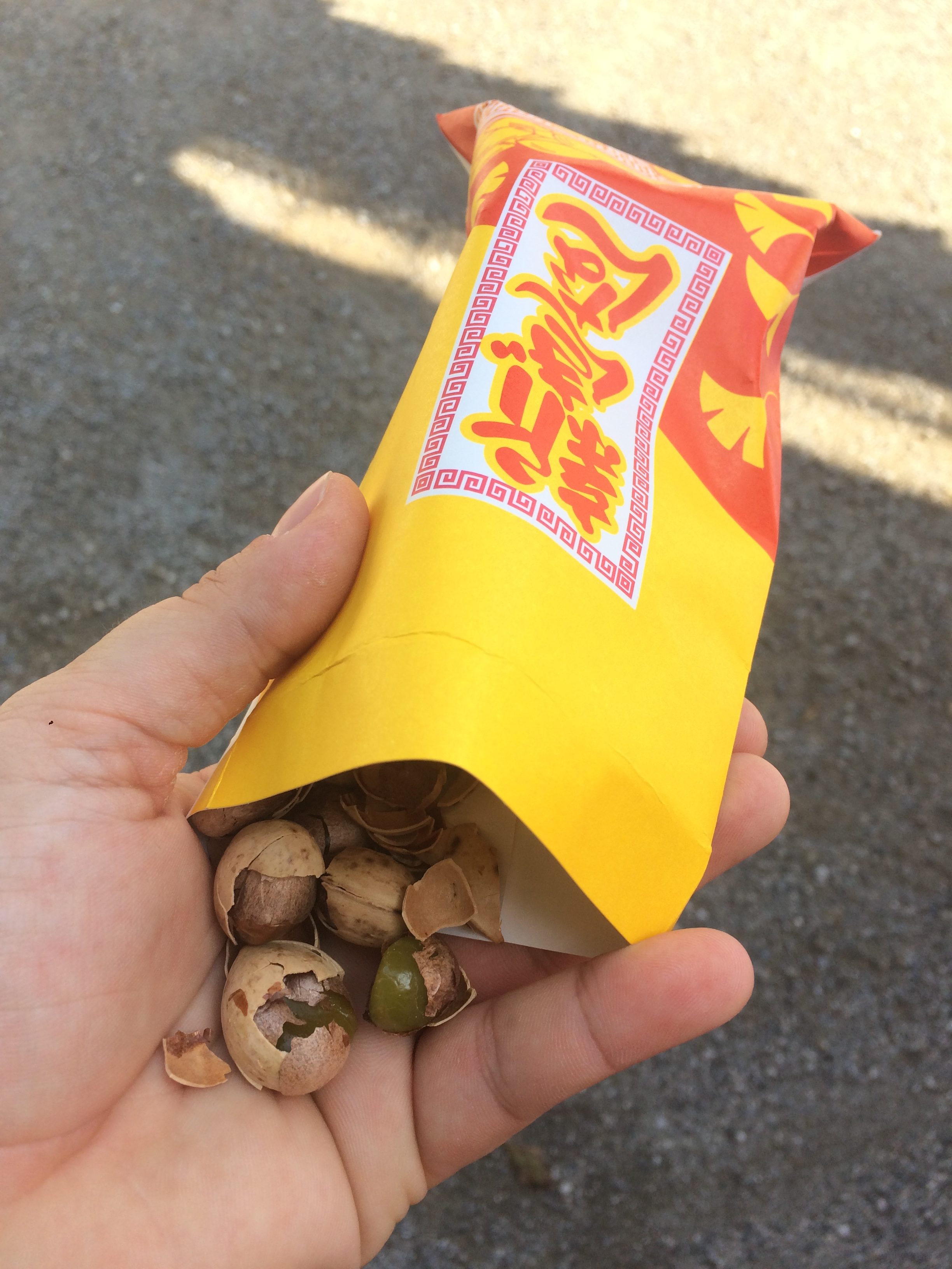 Ginkgo biloba. Fuori dai templi potete trovare dei piccoli mercati che vendono spiedini di frutta fresca o chicchi di uva caramellata. Ci sono anche spiedini di lingua grigliata con spezie e infine potete trovare questi piccoli frutti gelatinosi. Vengono messi in una padella rovente per farli scaldare, poi un colpo di martello ed eccoli pronti per essere mangiati uno dietro l’altro.