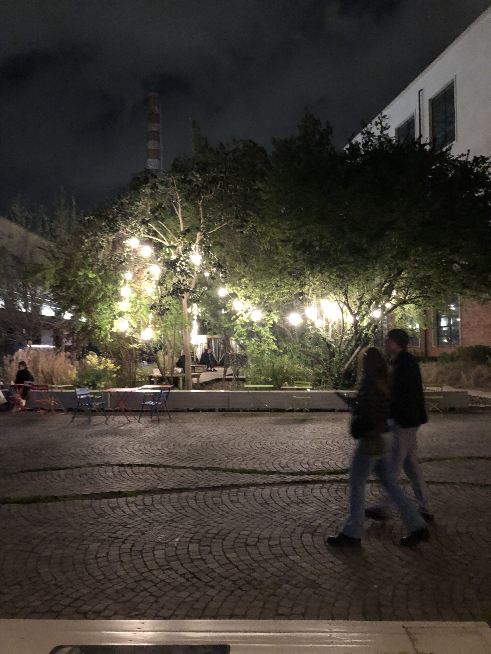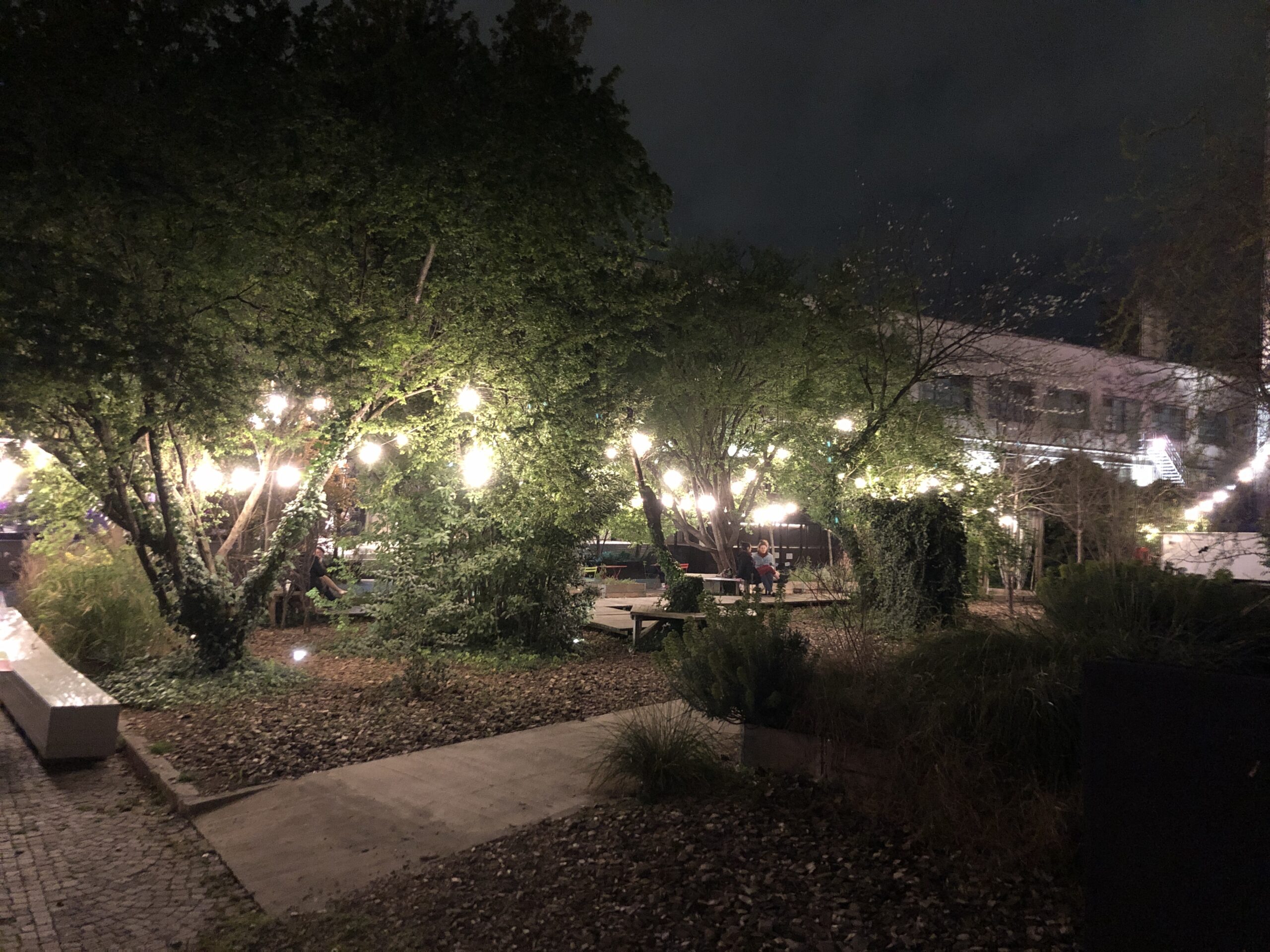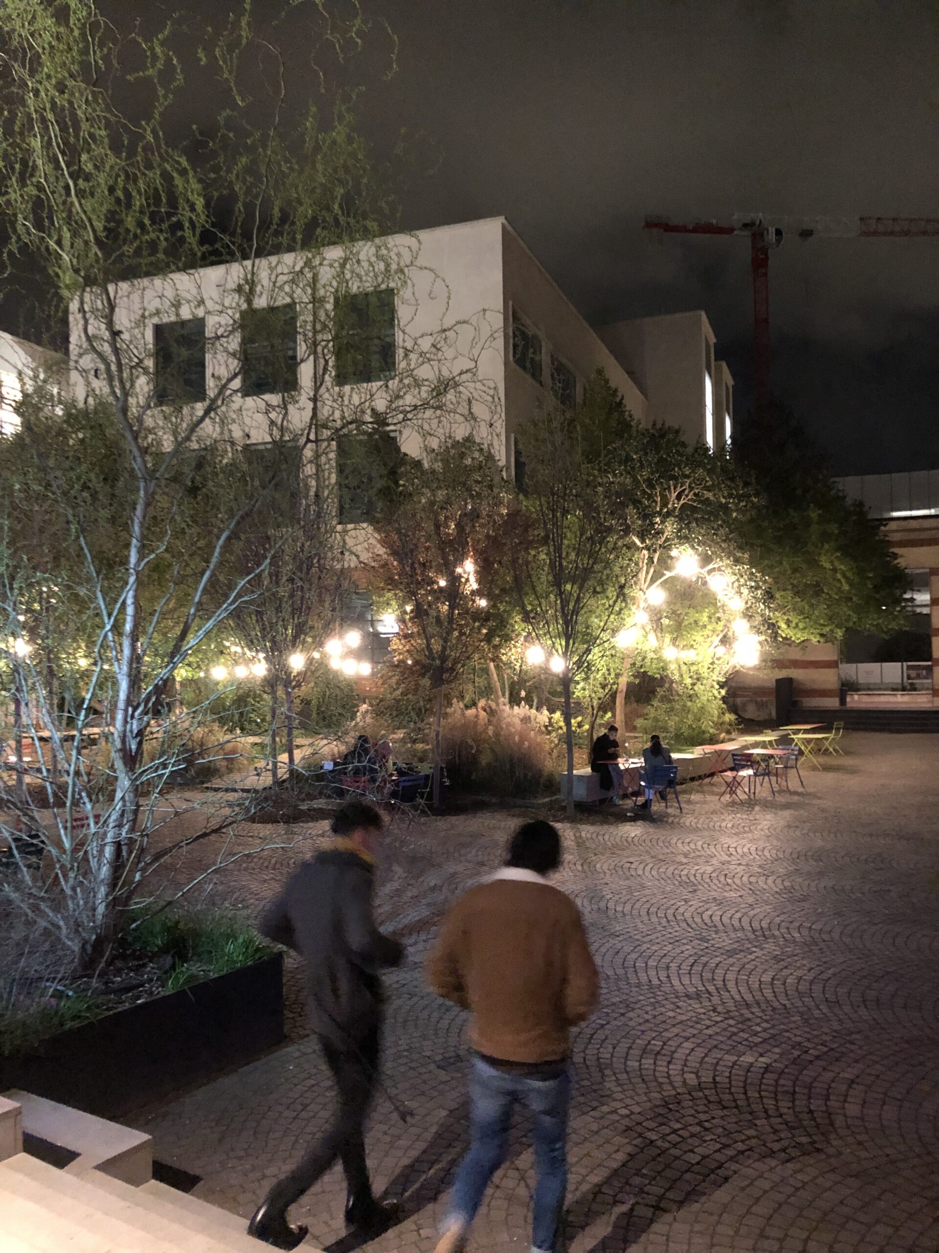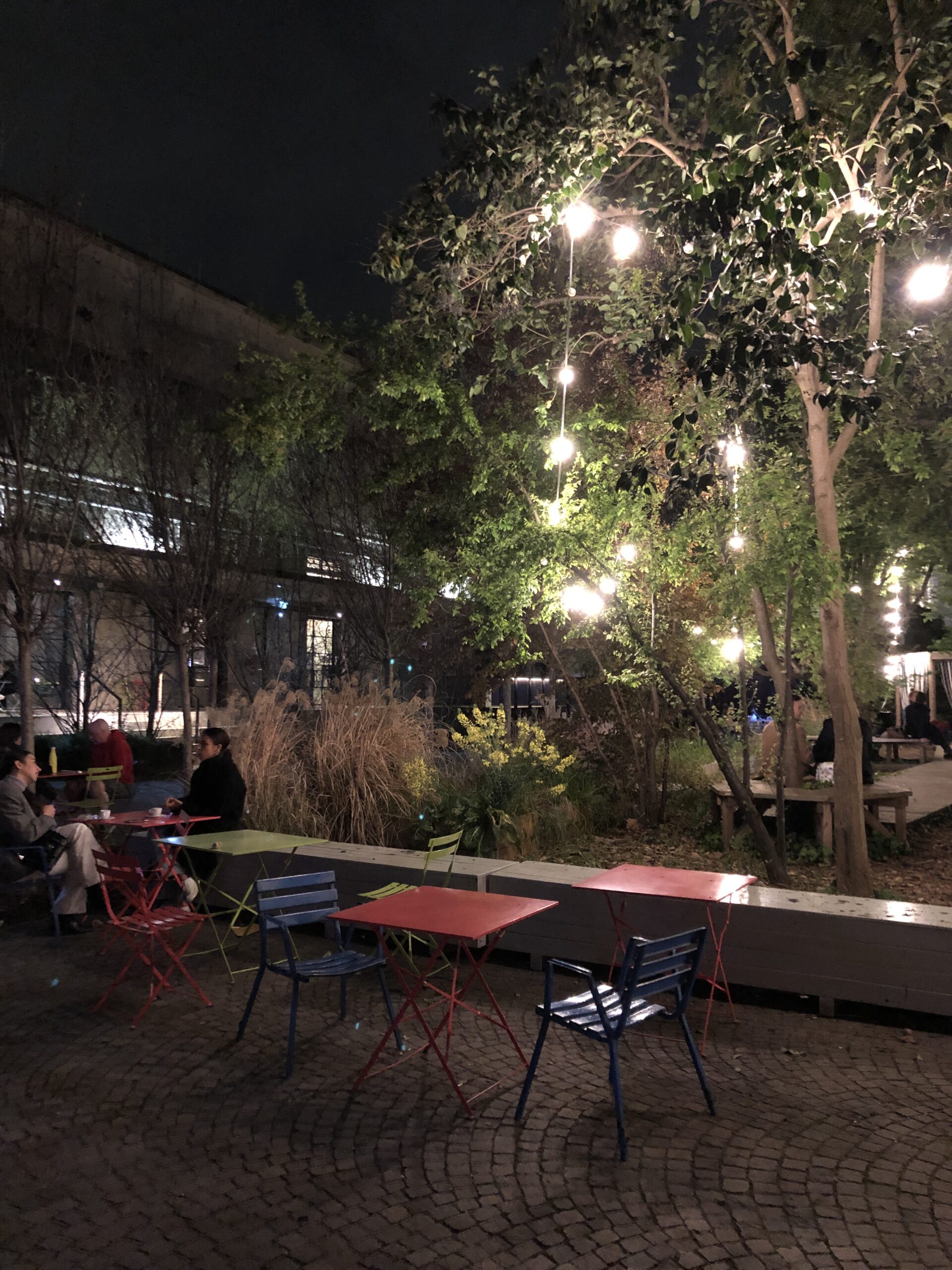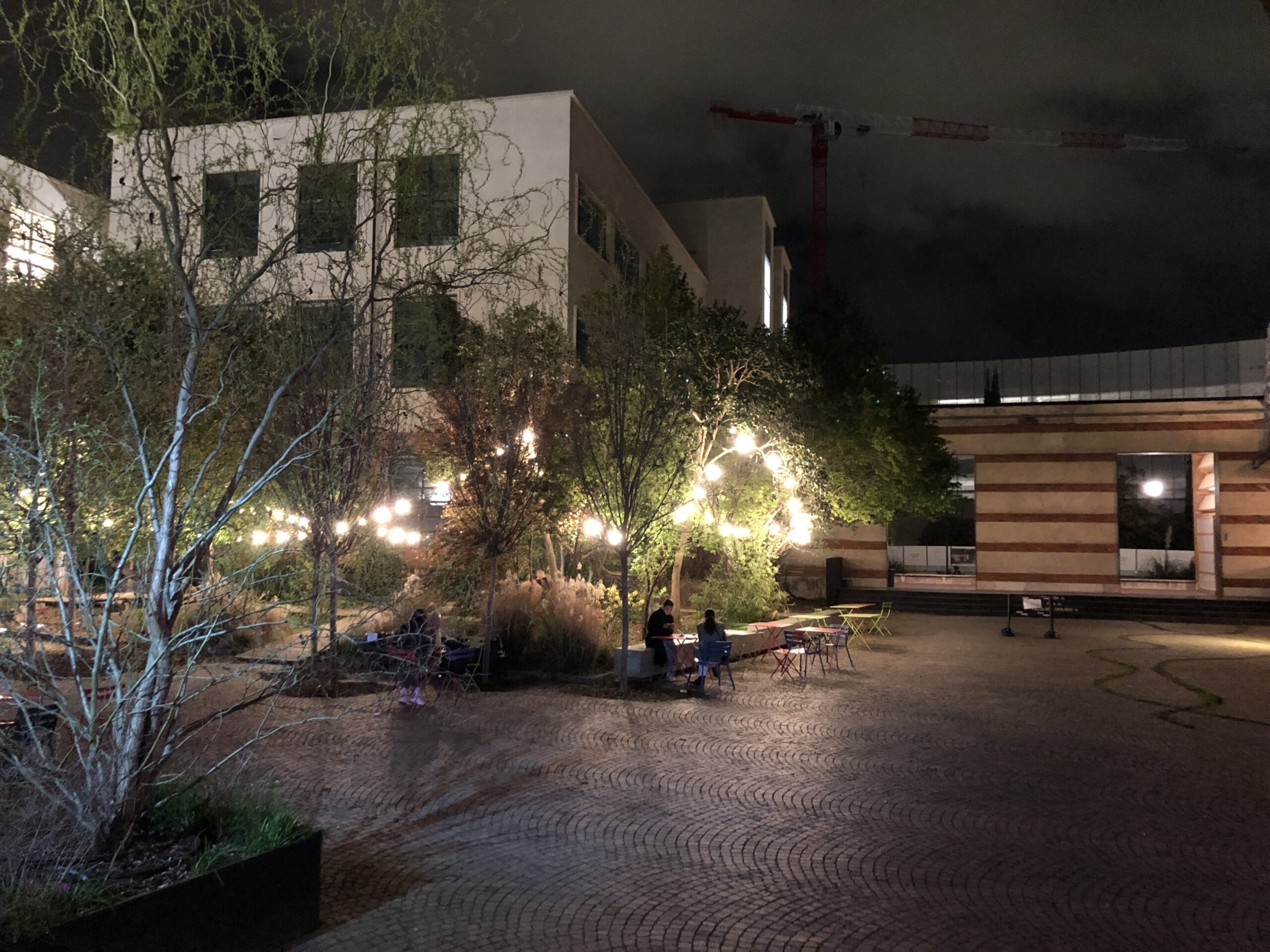 Oggi, sopratutto nelle calde sere d’estate, è un luogo particolare e suggestivo dove ritrovarsi per sorseggiare un drink e fare due chiacchiere. L’illuminazione fievole crea morbide aree illuminate che si poggiano sui giardinetti alberati e su pareti di travertino. Uno complesso urbano con un fascino particolare dove i grandi spazi si fondono coi piccoli dettagli.