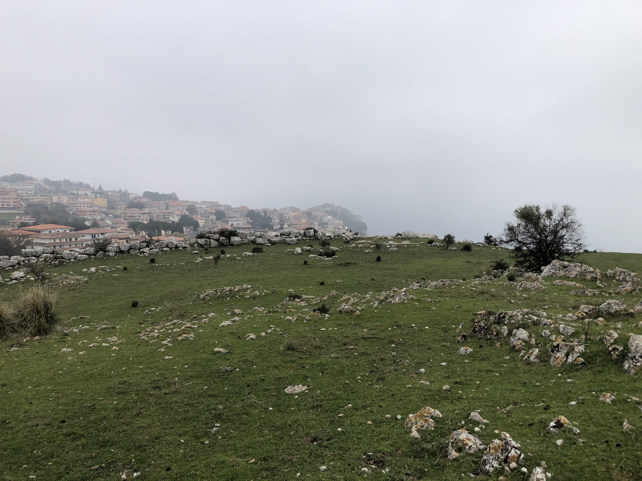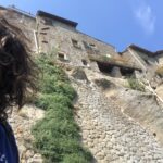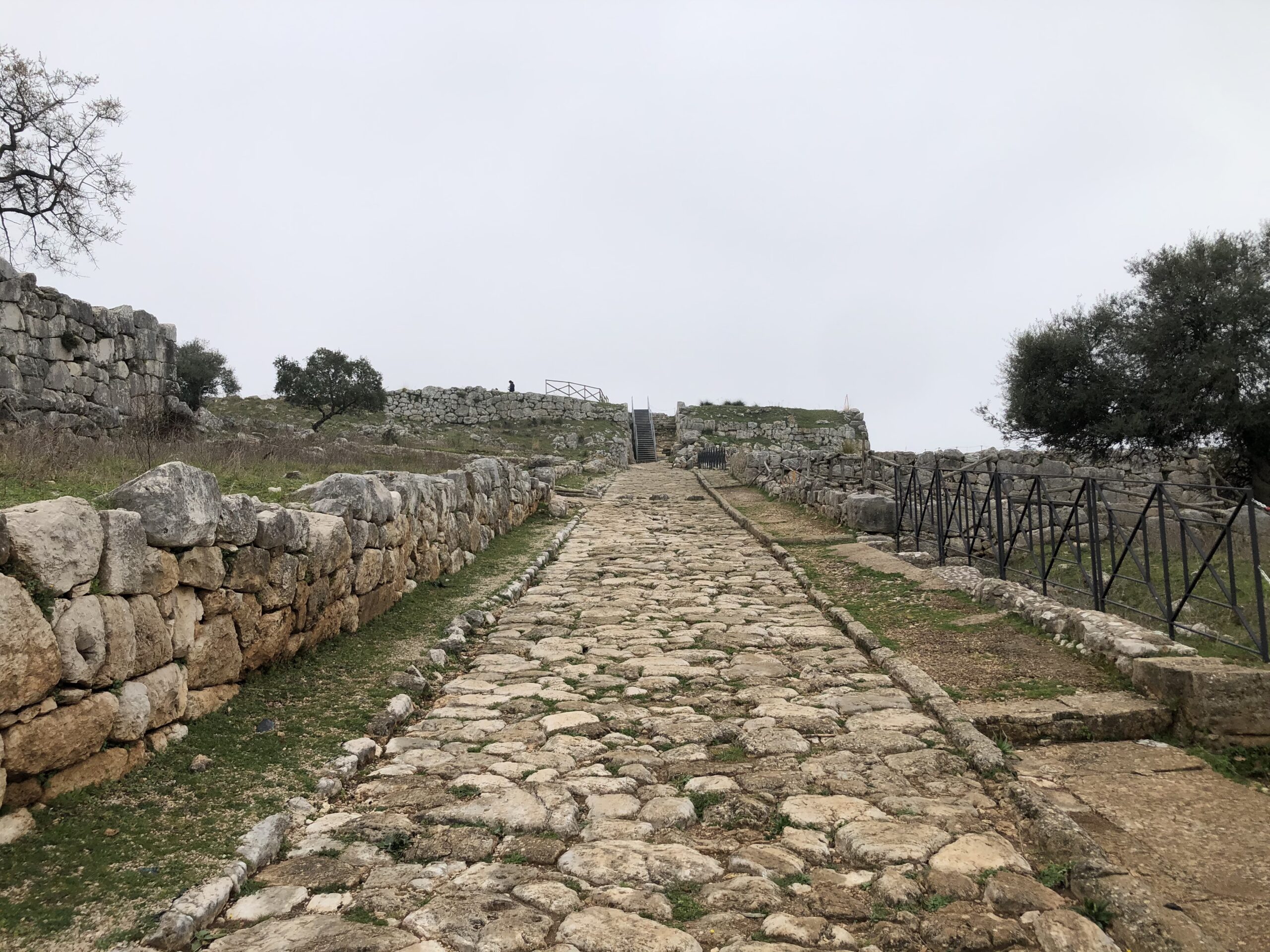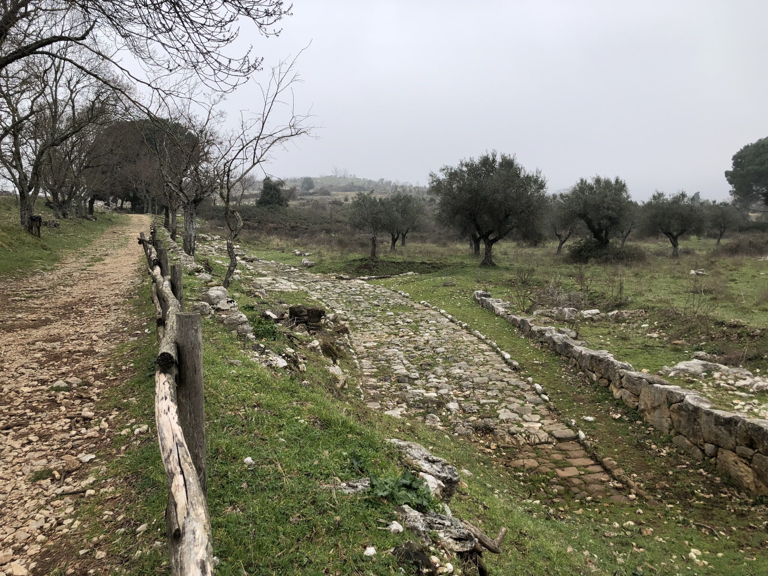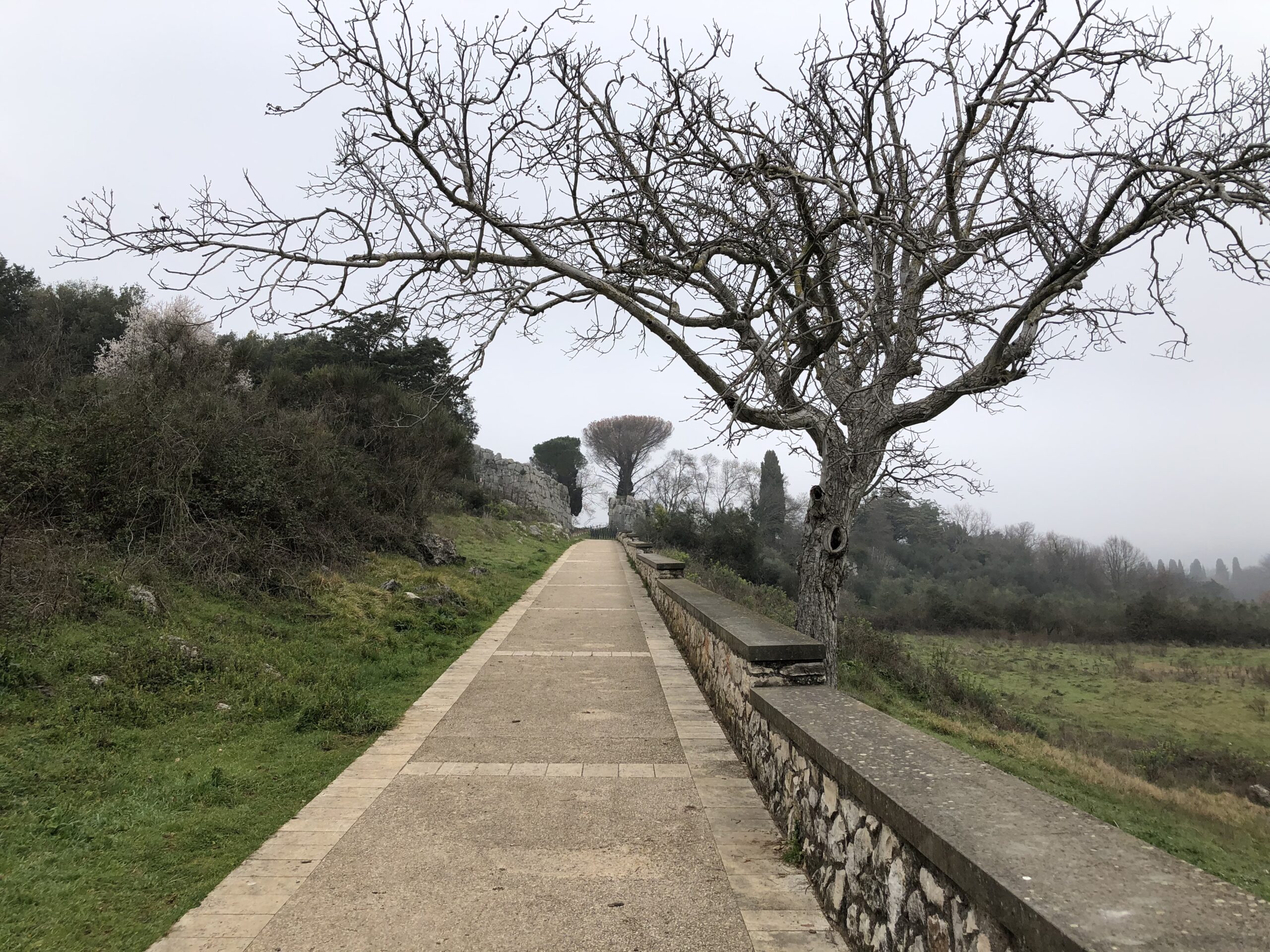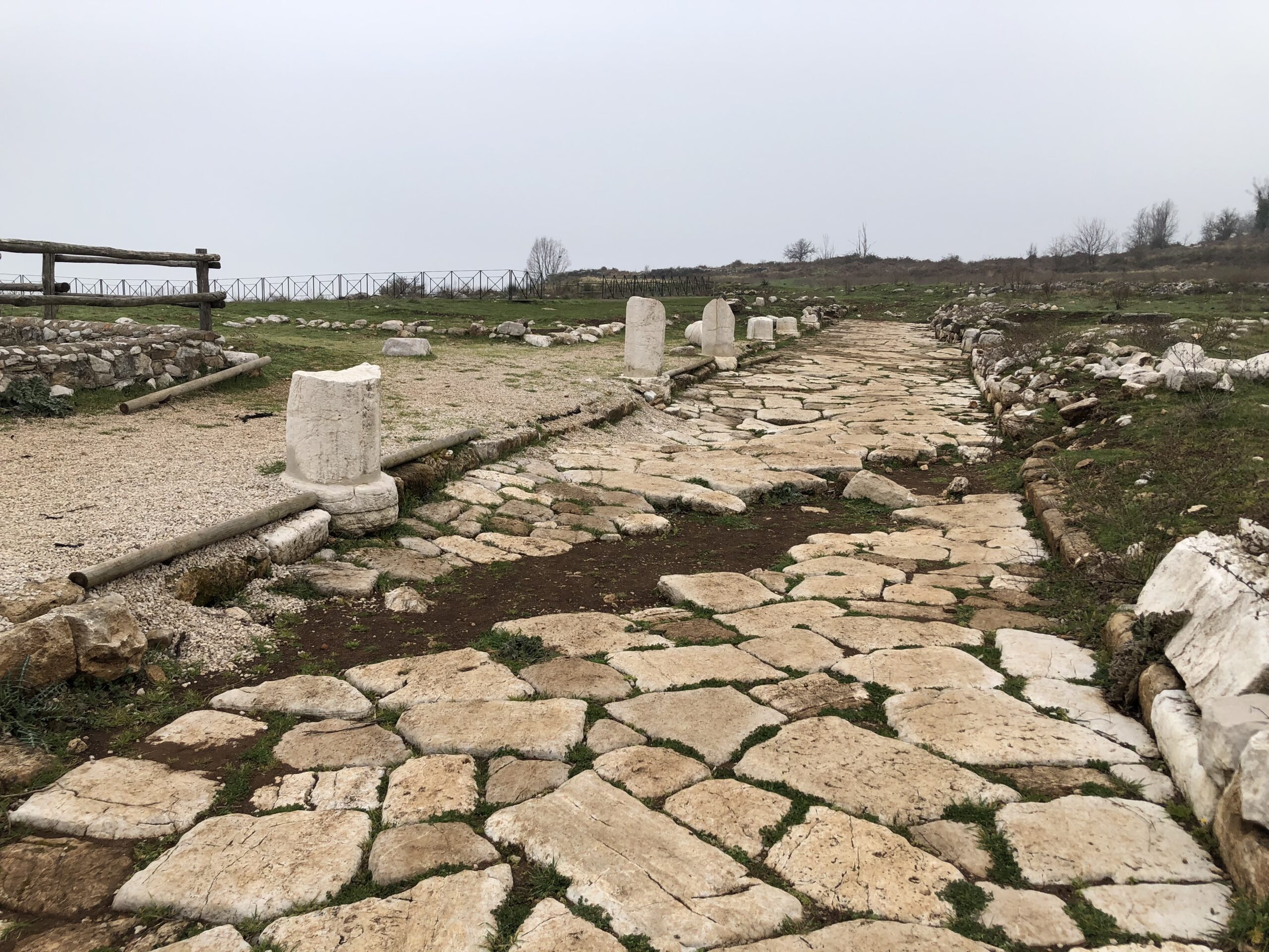 Questa foschia rende il paesaggio ancora più magico, il silenzio assoluto viene interrotto dal rumore dei miei passi e dallo screpitio dei rami secchi che si piegano sotto la debole forza del vento. Per chi ha una fervida immaginazione sarà facile inventarsi storie di vita passata legata a questi luoghi. Confesso che a vederla così questa città sembra costruita meglio delle nostre attuali, ci sono marciapiedi larghi e senza buche (clamoroso!), anche la strada, è decisamente di un altro livello, grandi pietre sistemate una accanto all’altra che resistono da secoli senza alcun cedimento mentre il nostro asfalto si sgretola dopo un paio di giorni di pioggia.