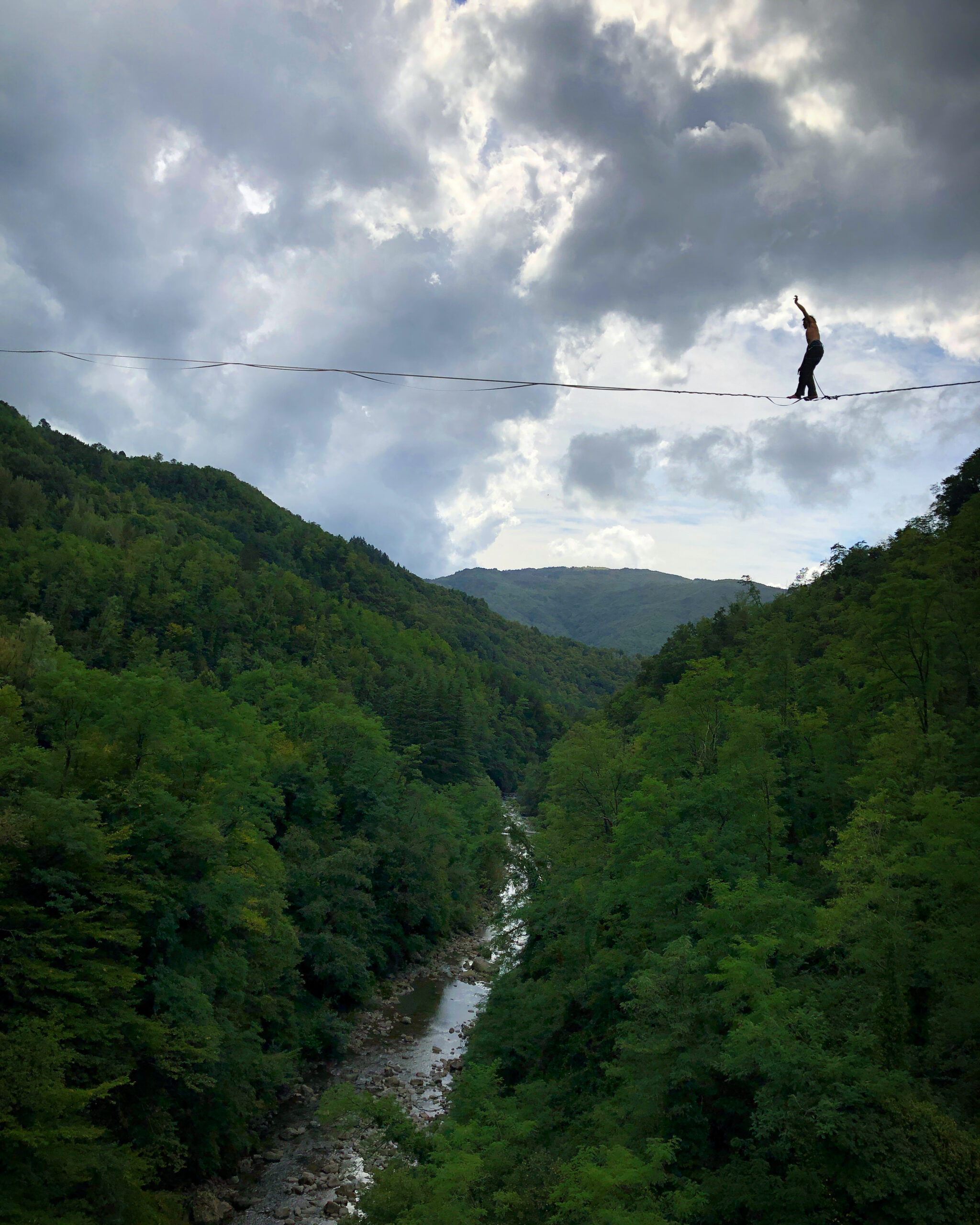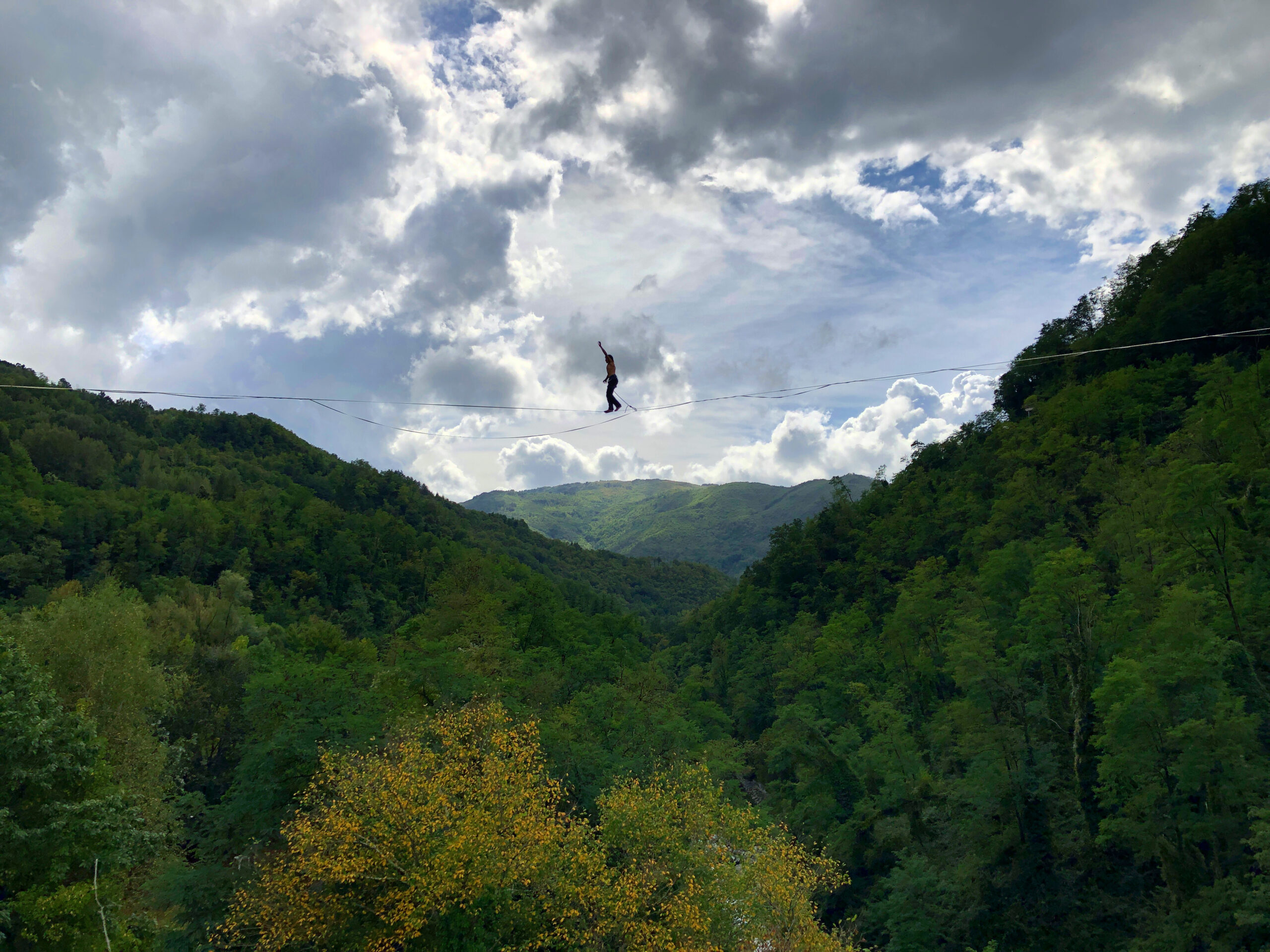 Cammina con un equilibrio innaturale, concentrato sì ma, con uno strano sorriso di libertà disegnato sul viso sudato. Rimango immobile per diversi minuti pensando che il cigolio del ferro del ponte potesse distrarlo. Sono totalmente incantata. Stiamo tutti e due sospesi in aria (beh non proprio allo stesso modo!), tutti e due lì insieme, in piedi sopra il silenzio del bosco.
