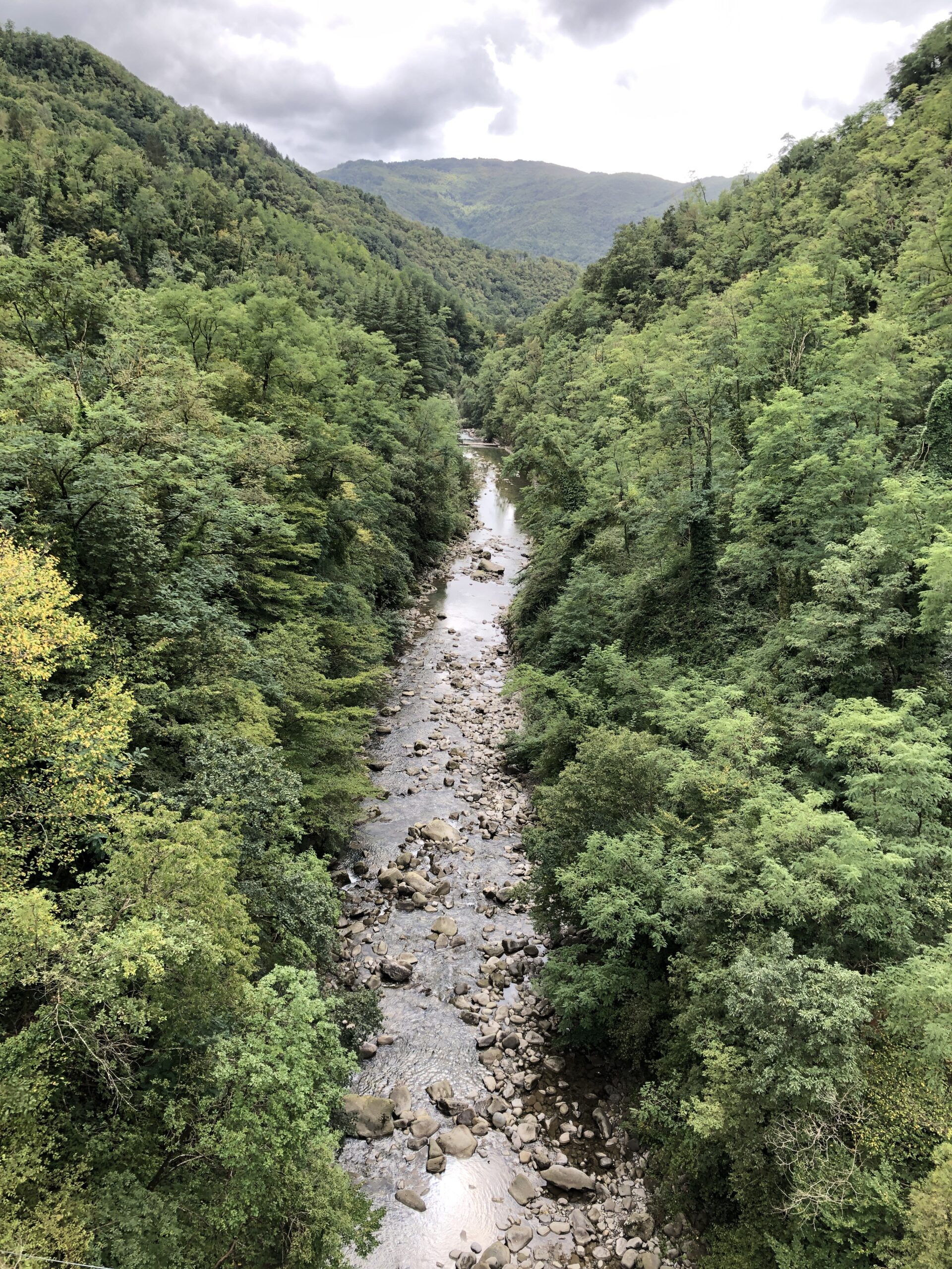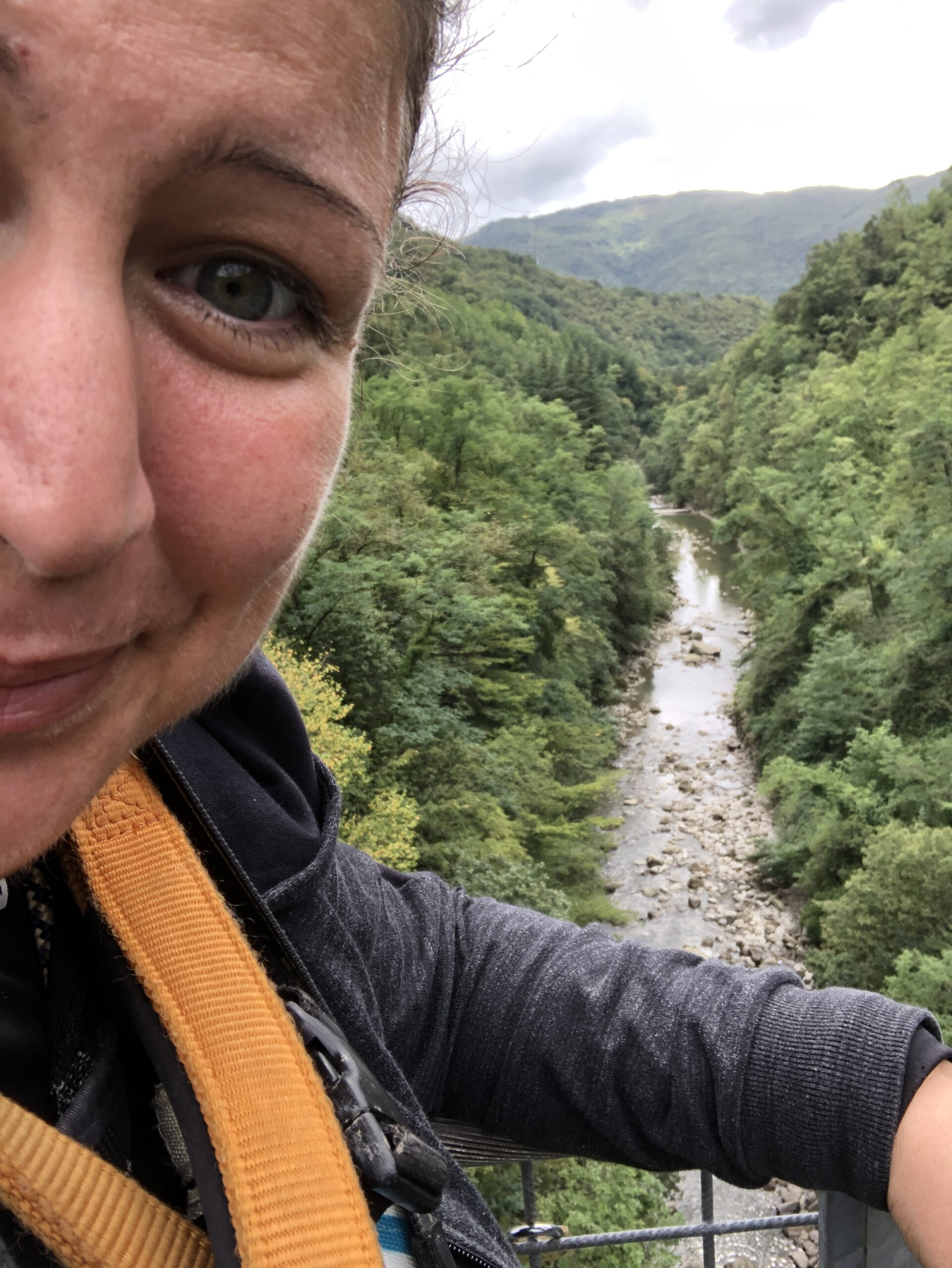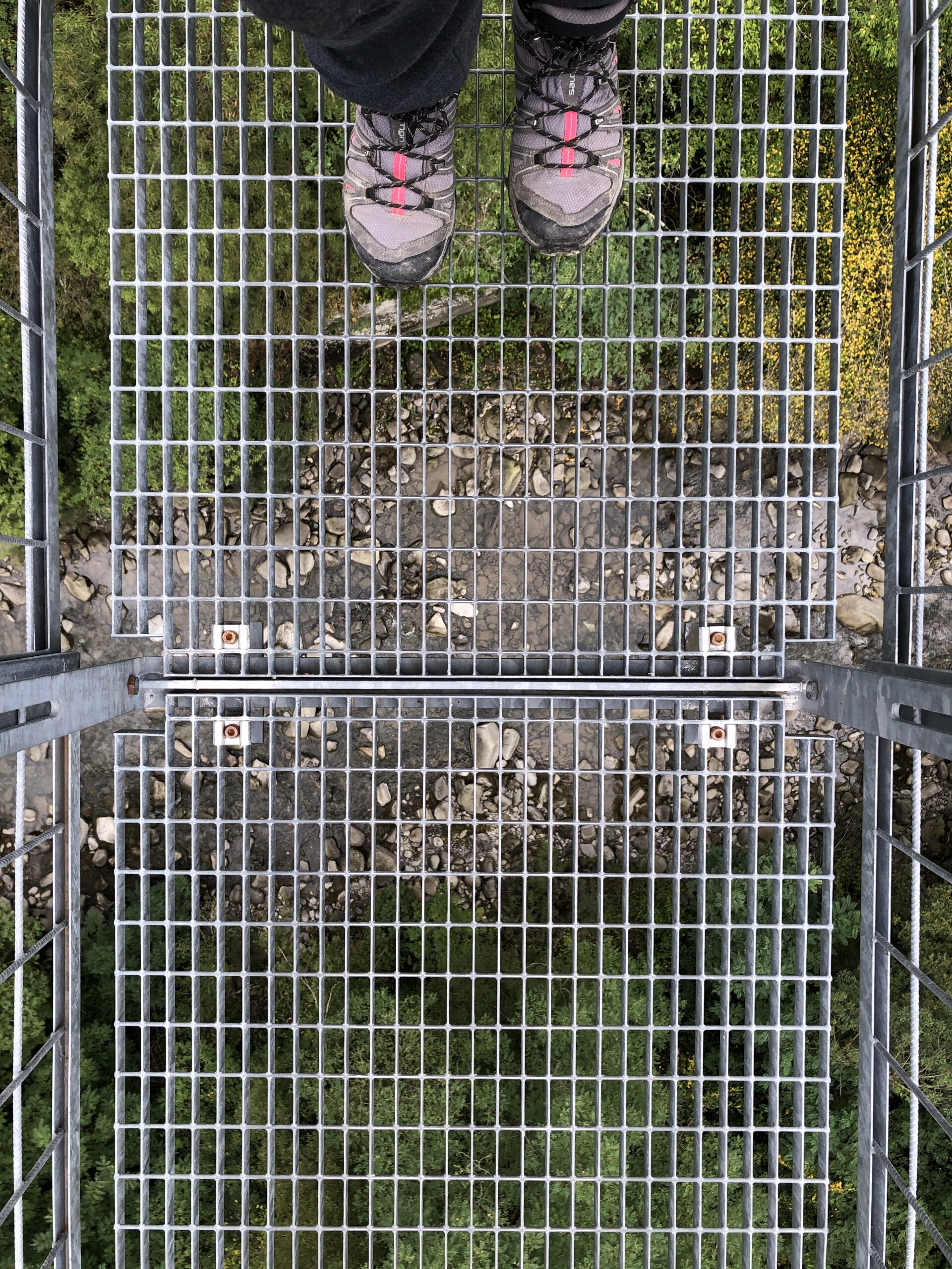 La regola del ‘non guardare giù’ per me non funziona, continuo ad osservarmi le punte delle scarpe. Metto a fuoco ciò che sta sotto la grata e scorgo uno spettacolo senza eguali. Il fiume scorre proprio sotto di me e le cime degli alberi hanno piccole foglie verdi che ondeggiano al ritmo dei miei passi.