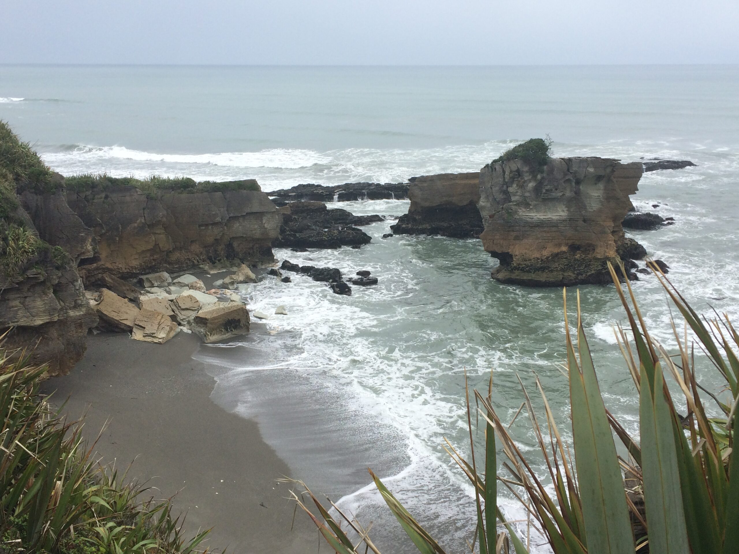 Continuo a camminare nella tranquillità di questo luogo situato nella costa occidentale a Nord dell’Isola del Sud, mi sporgo di tanto intanto a sbirciare l’oceano che si spalma sulla sabbia plumbea. Le lunghe e spesse foglie degli arbusti che mi circondano, suonano al vento creando un fruscio sordo che si sposa perfettamente con il ticchettare delle gocce di pioggia sul terreno.