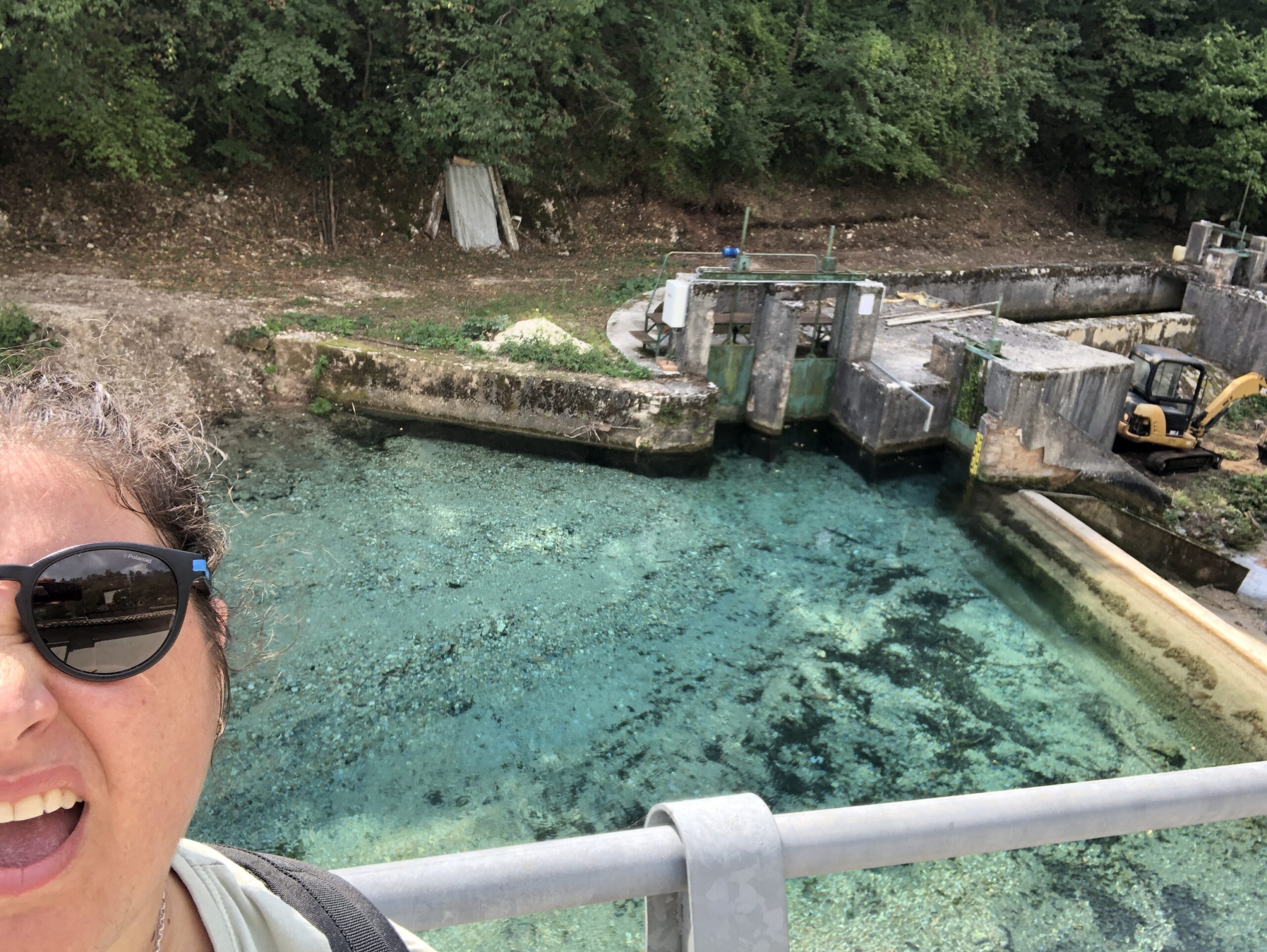 Esco dal paese camminando sulla statale dove una lunga fila di auto staziona sotto il sole; al si dotto della strada il corso d’acqua forma un piccolo bacino turchese, lo riconosco, è il luogo nel quale un sacco di persone si sono fotografate con i piedi in ammollo facendo credere che fosse un posto incantato nel quale potersi tuffare e invece, è più simile ad un cantiere. (La mia espressione dice tutto)