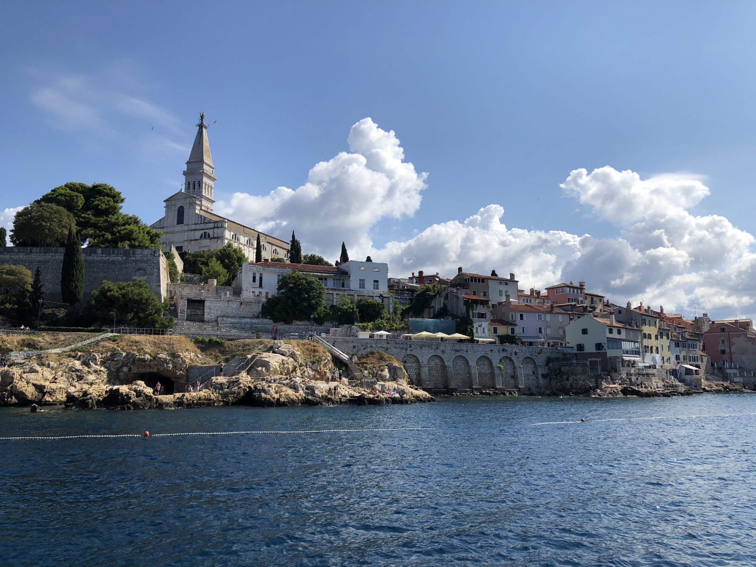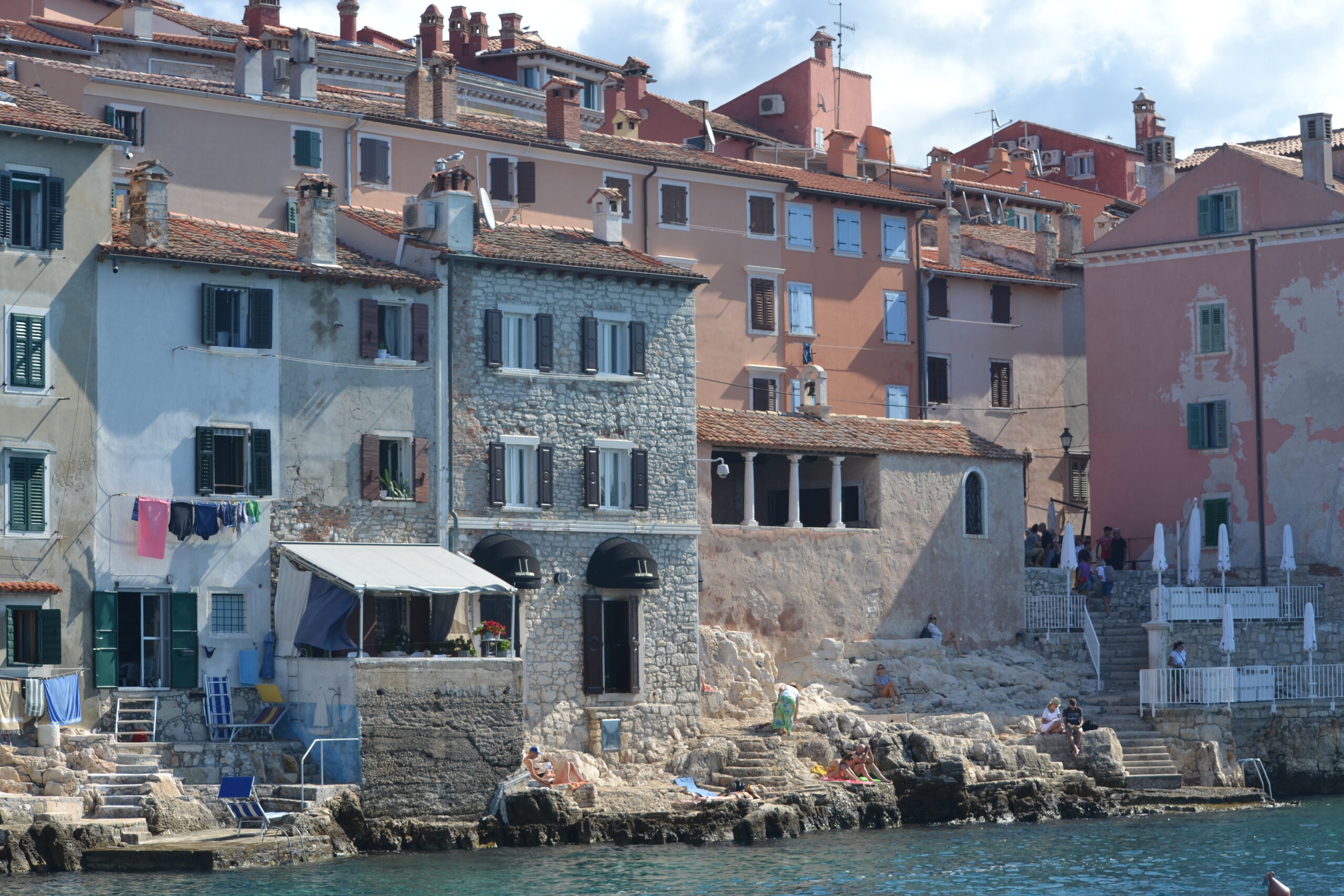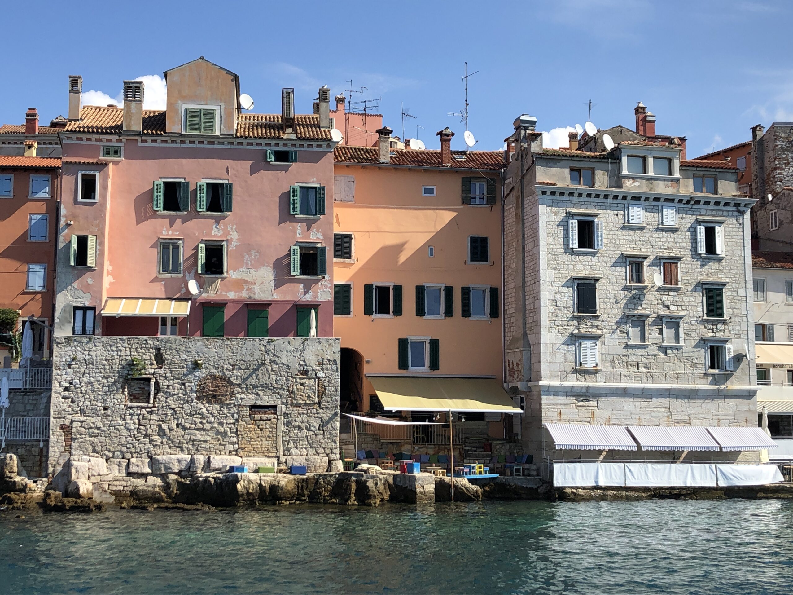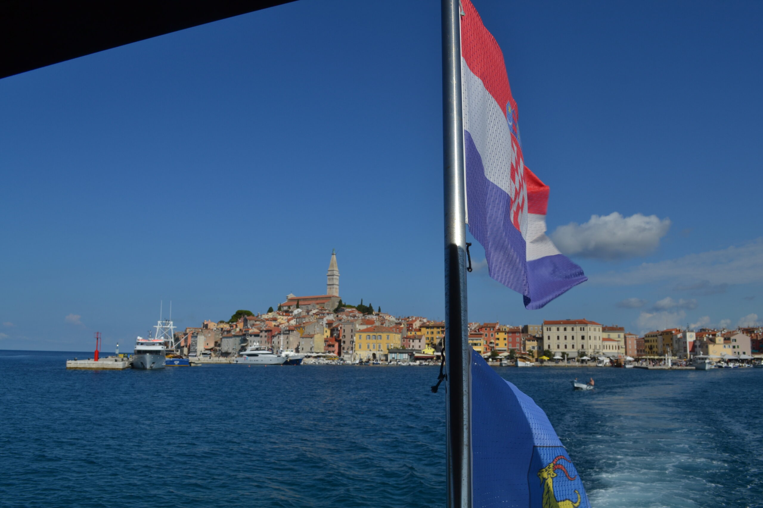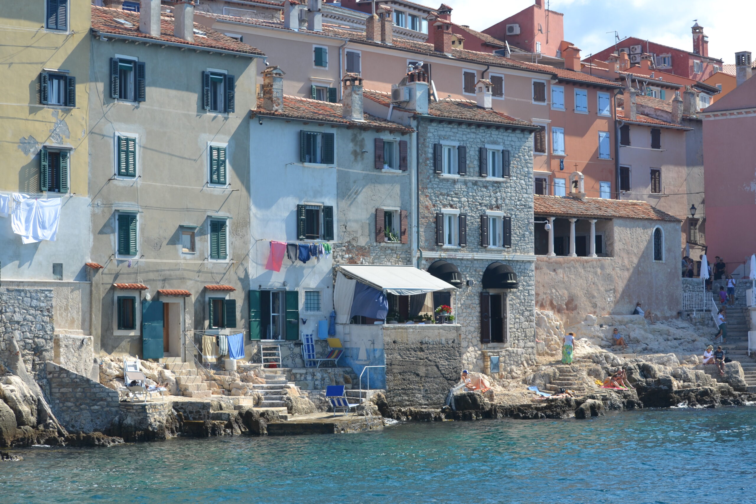 Tra le tante barche ce n’è una che assomiglia al pesciolino Nemo. Il suo fondo è trasparente ed è possibile ammirare i pesci che nuotano a pelo del fondale sabbioso. Il mare è una tavola e un giro è d’obbligo. Al largo Rovigno appare ancora più bella. Le casette a picco sul mare fanno un certo effetto. Immagino un ospite un po’ frettoloso che, in cerca del bagno, apre la porta che conduce dritta nell’Adriatico. “Franco! Me lo potevi dire che tenevi il mare in salotto! Li muerti…”