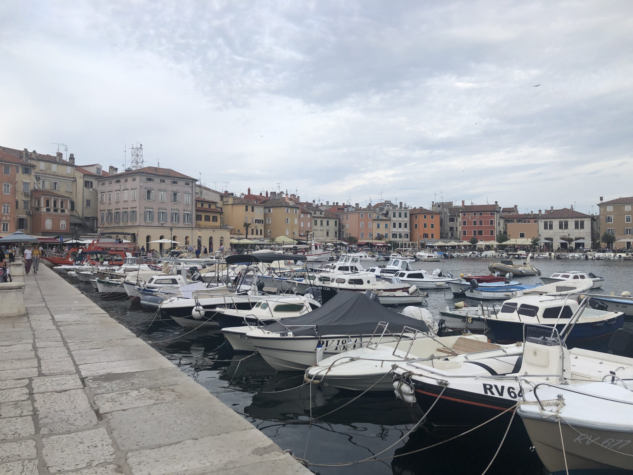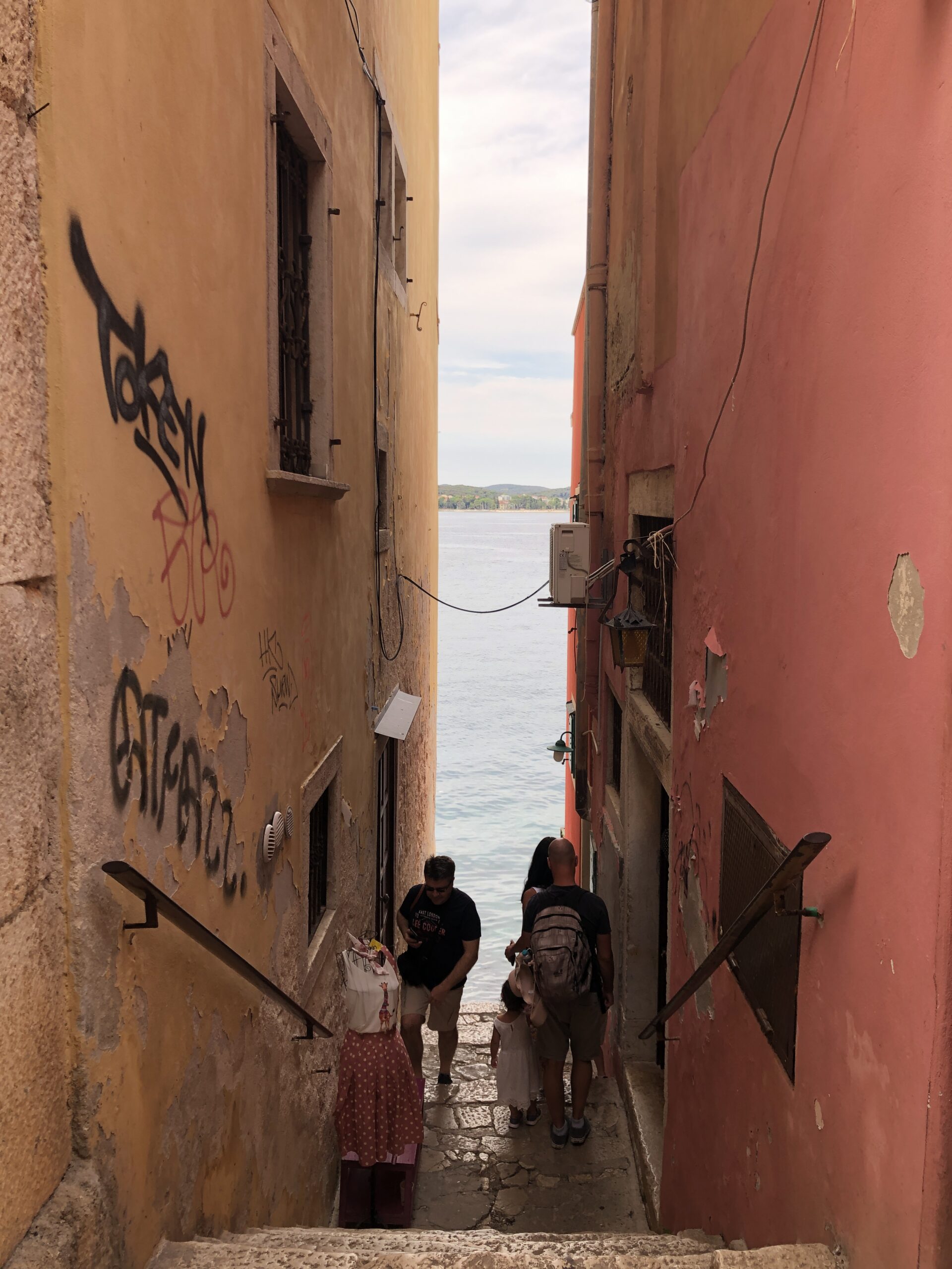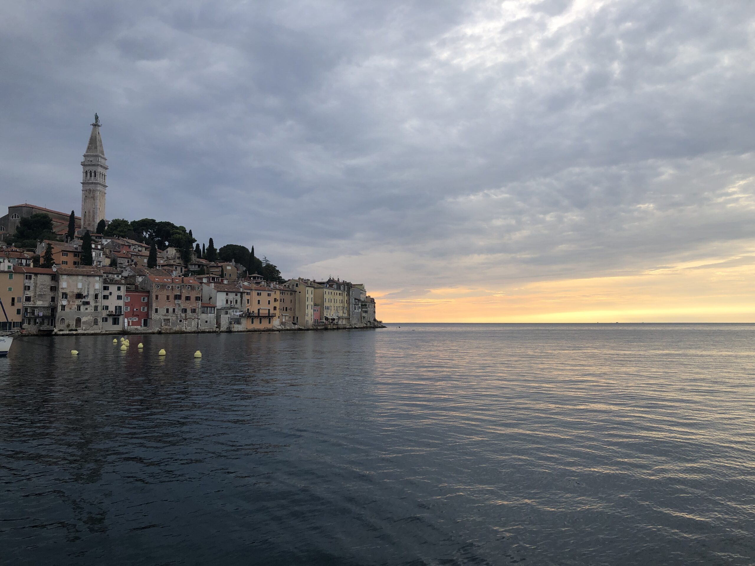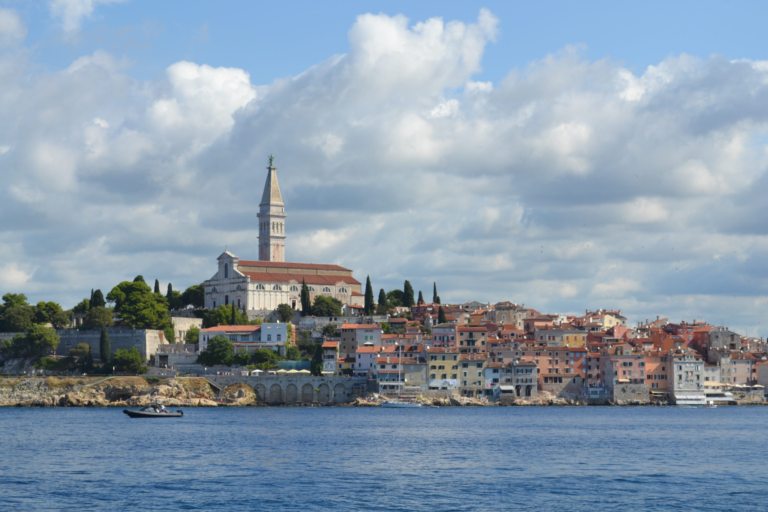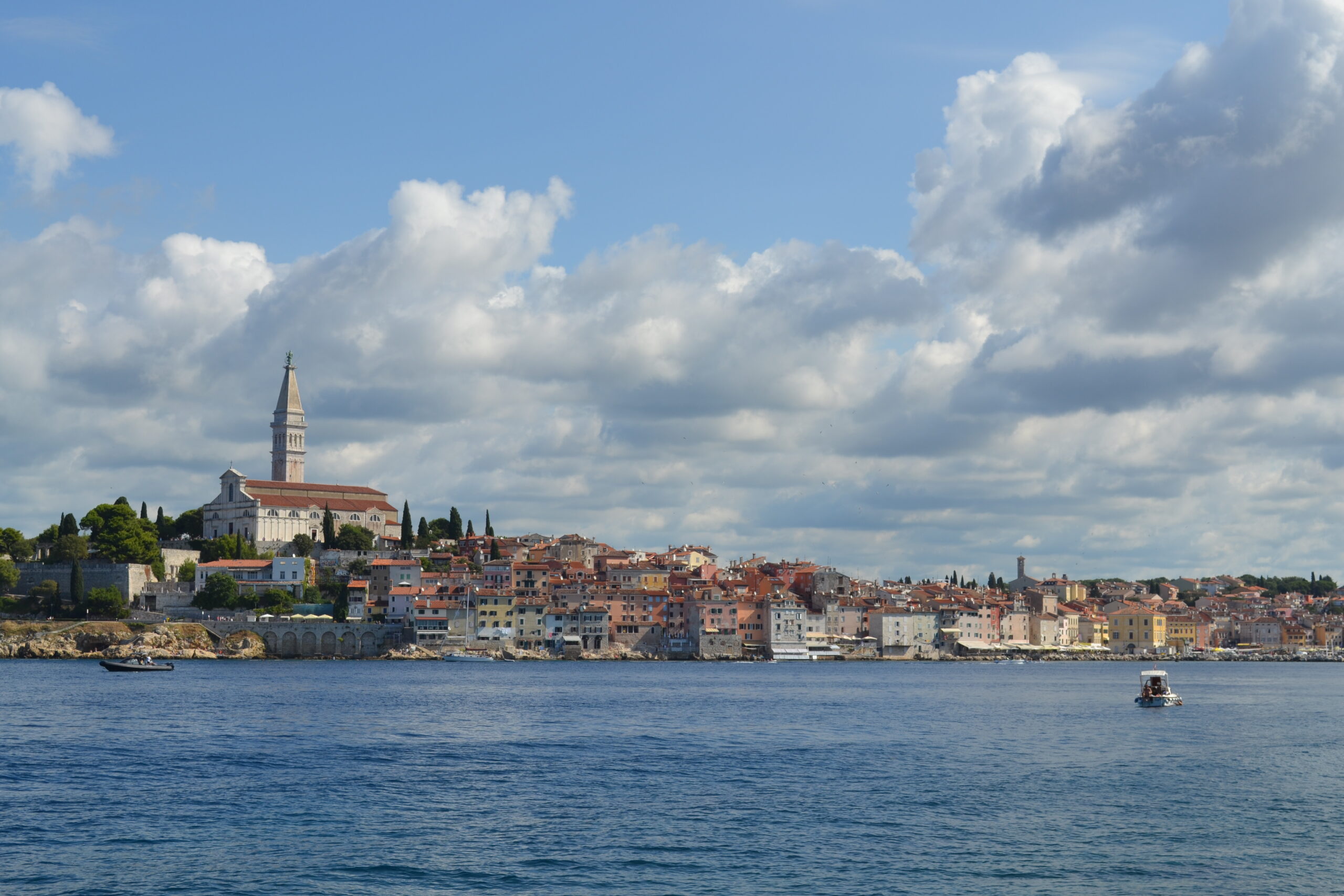 Tra le tante barche ce n’è una che assomiglia al pesciolino Nemo. Il suo fondo è trasparente ed è possibile ammirare i pesci che nuotano a pelo del fondale sabbioso. Il mare è una tavola e un giro è d’obbligo. Al largo Rovigno appare ancora più bella. Le casette a picco sul mare fanno un certo effetto. Immagino un ospite un po’ frettoloso che, in cerca del bagno, apre la porta che conduce dritta nell’Adriatico. “Franco! Me lo potevi dire che tenevi il mare in salotto! Li muerti…”