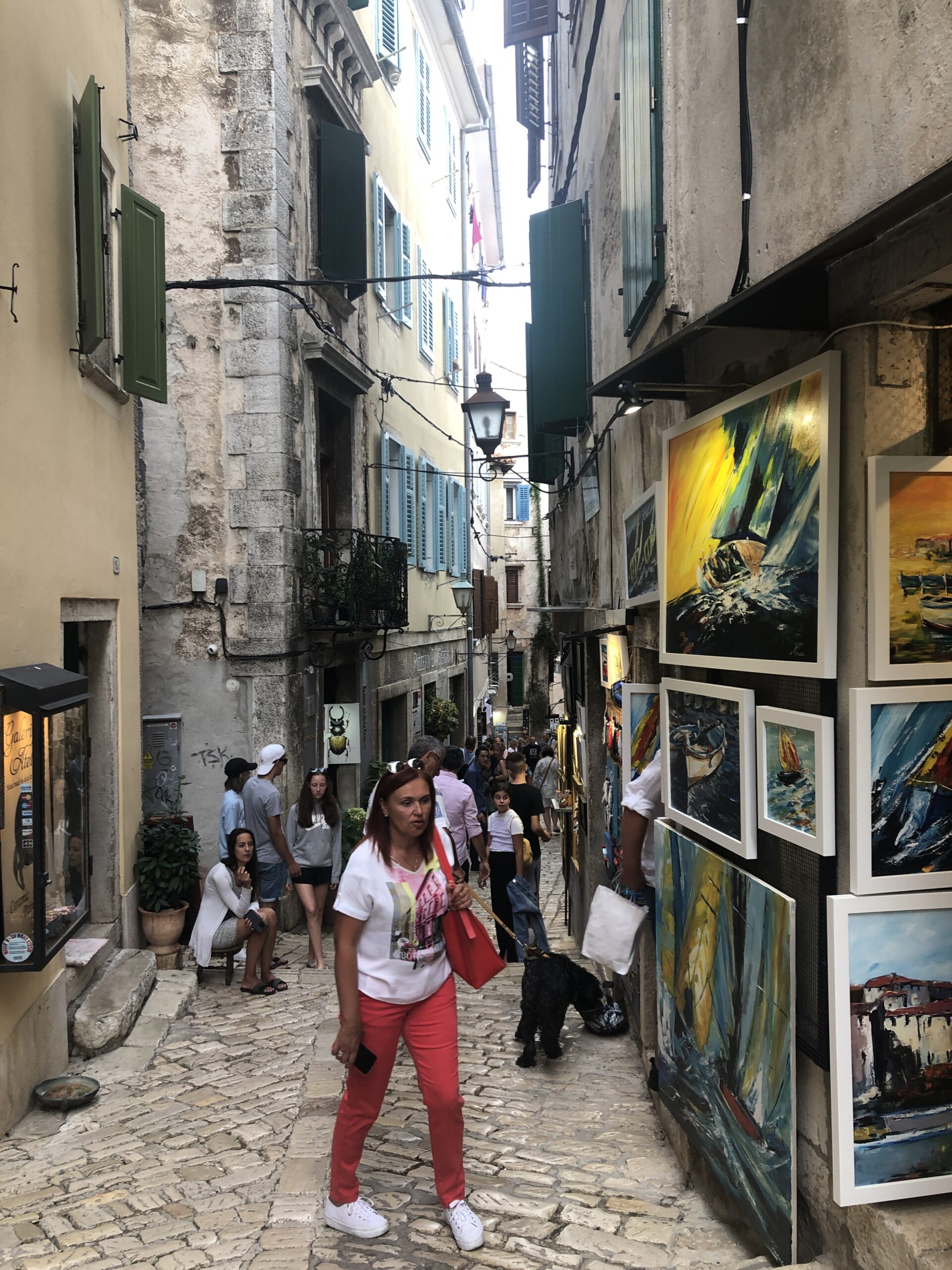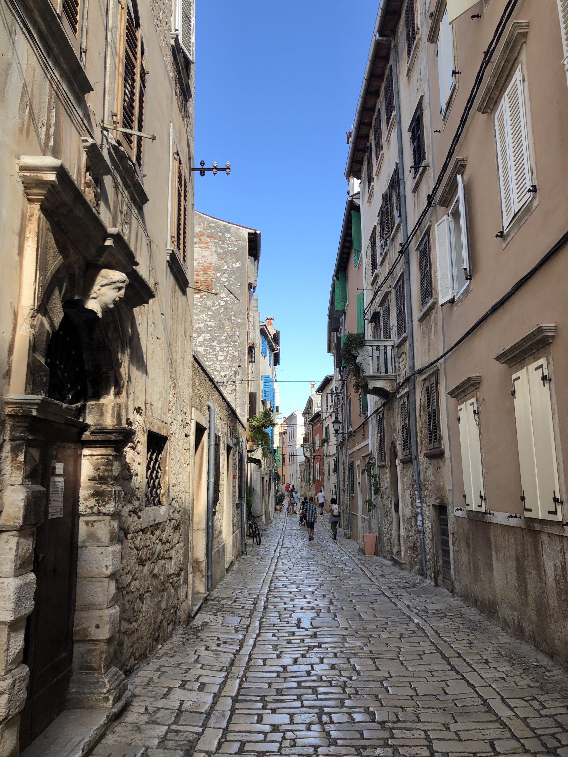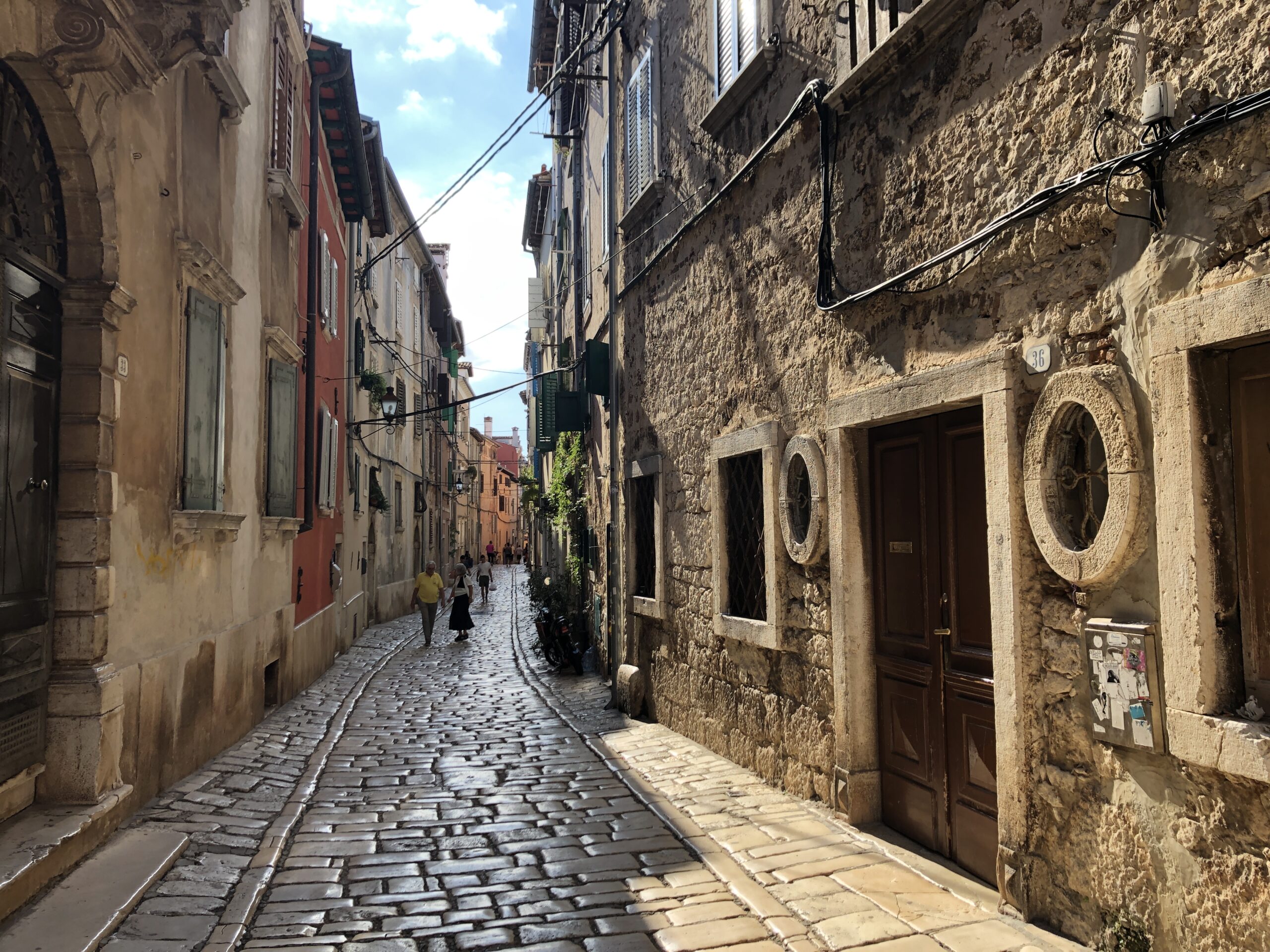 Una stretta stradina lastricata con pietre lisce color panna introduce ai vicoli nascosti di Rovigno. Negozietti per turisti e atelier di artisti allietano la passeggiata leggermente in salita che conduce in cima alla collina. Un piccolo faro, dei giardini pubblici e la cattedrale sono la conclusione della breve promenade. Scendendo dal lato opposto, sul retro della chiesa per intenderci, altre piccole vie piene di colori conducono all’altro lato della città. Proprio qui si trovano il maggior numero di ristoranti e locali, tutti affacciati sul porticciolo gremito di imbarcazioni in legno. C’è un’atmosfera rilassata e spensierata.