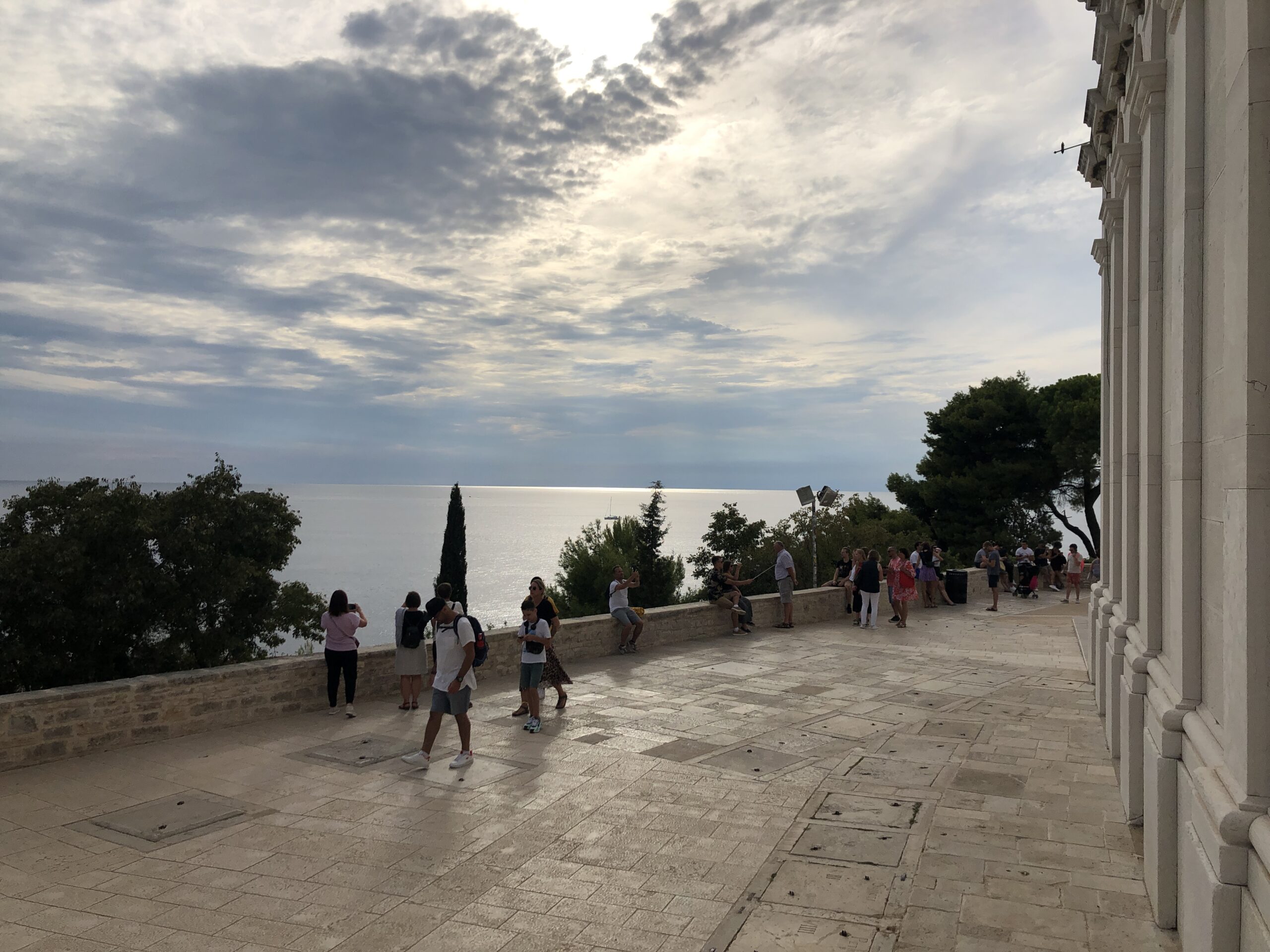 Il marito la prende sottobraccio e la sorregge nell’ultimo tratto in salita che porta alla chiesa di Sant’Eufemia. Probabilmente affiderà alla Santa il povero coccige martoriato. Da quassù in cima si può dominare tutta la città le cui piccole case vestono abiti colorati per presentarsi al mare che, innamorato, cinge tutto il promontorio.