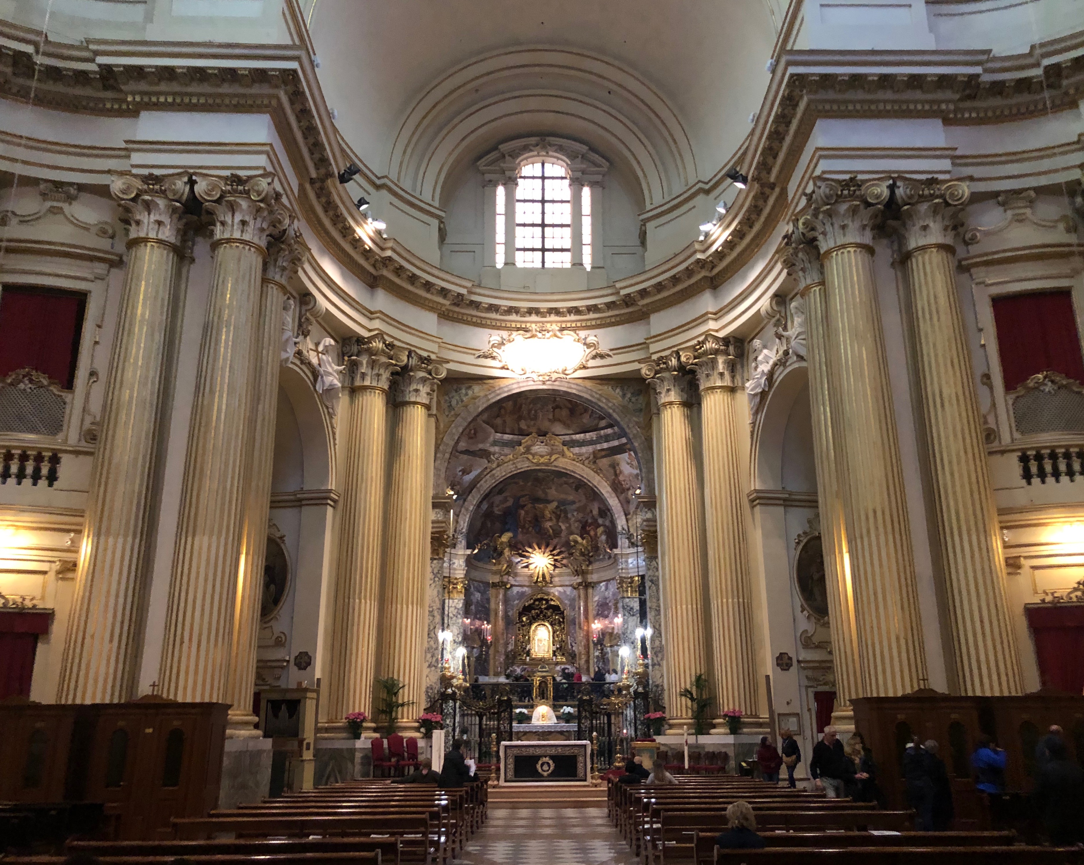 Mi rifugio all’interno della grande basilica; tanta gente è accasciata sulle strette sedute in legno in attesa di un’illuminazione o di un respiratore (chissà!).