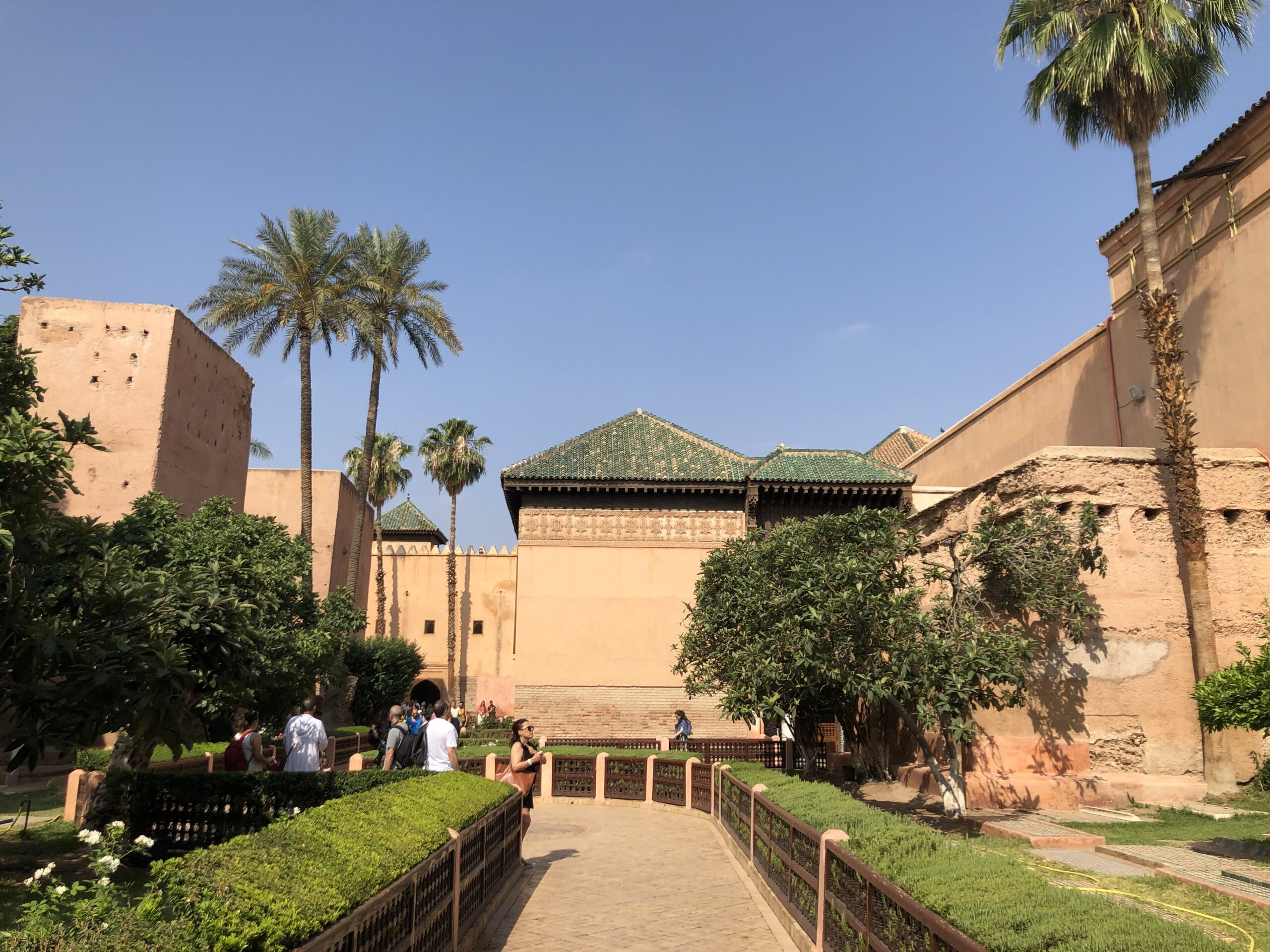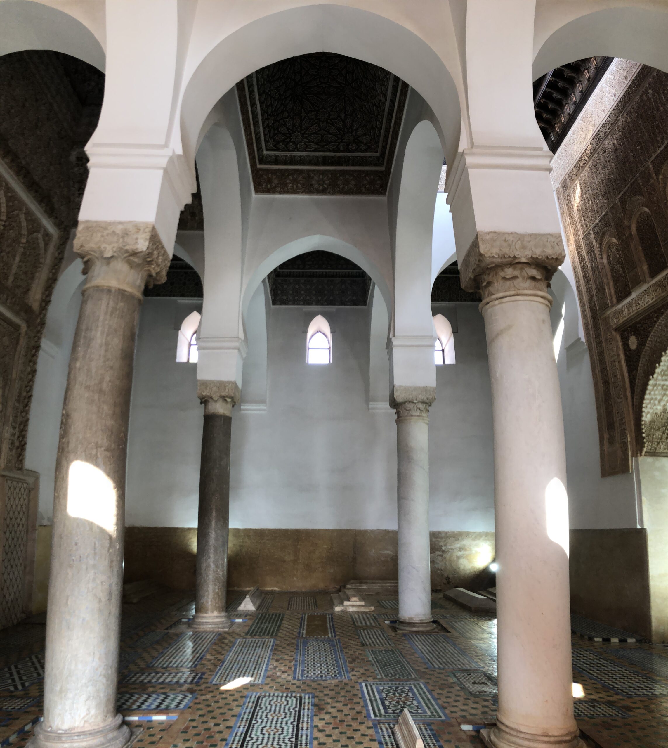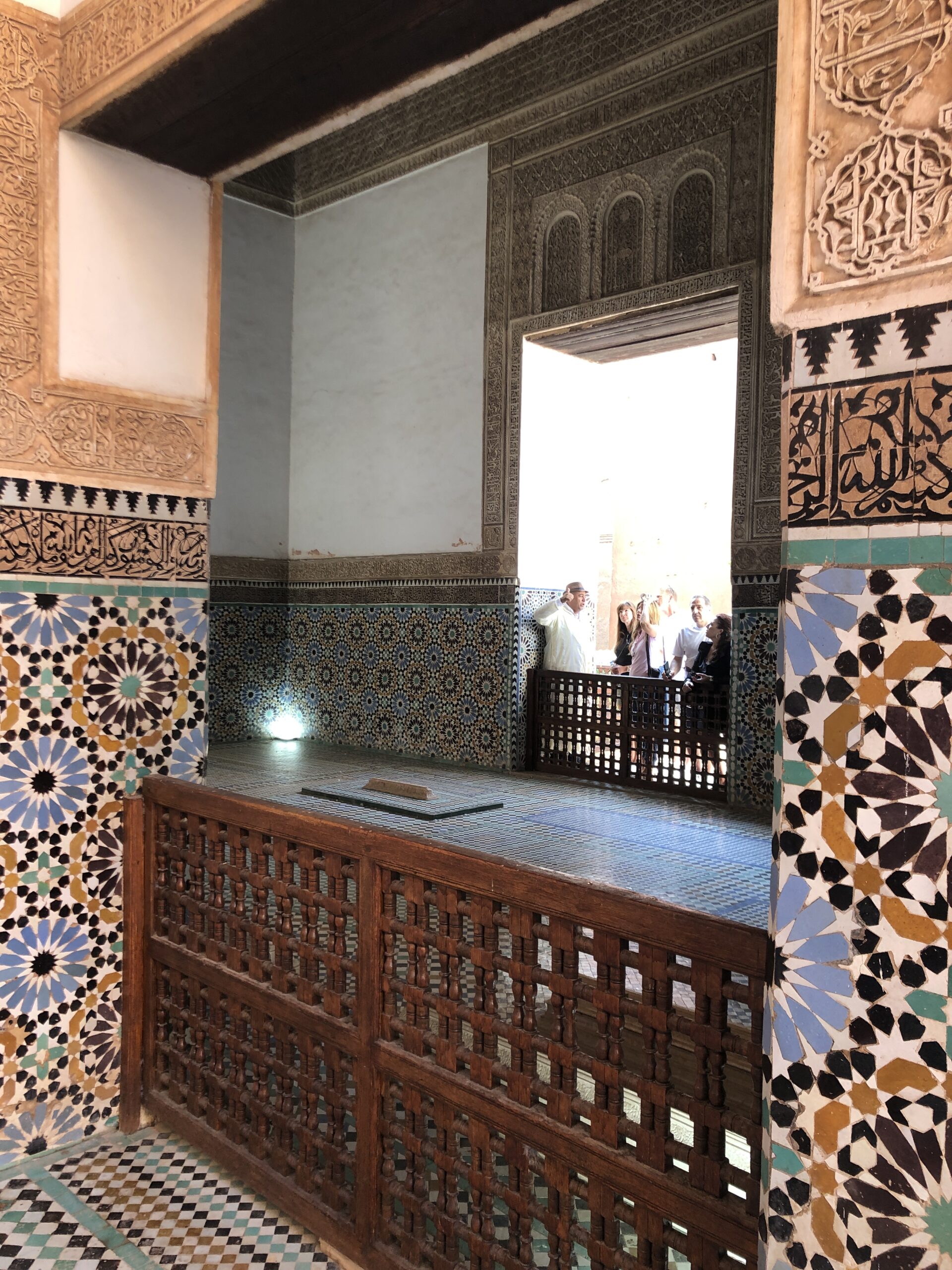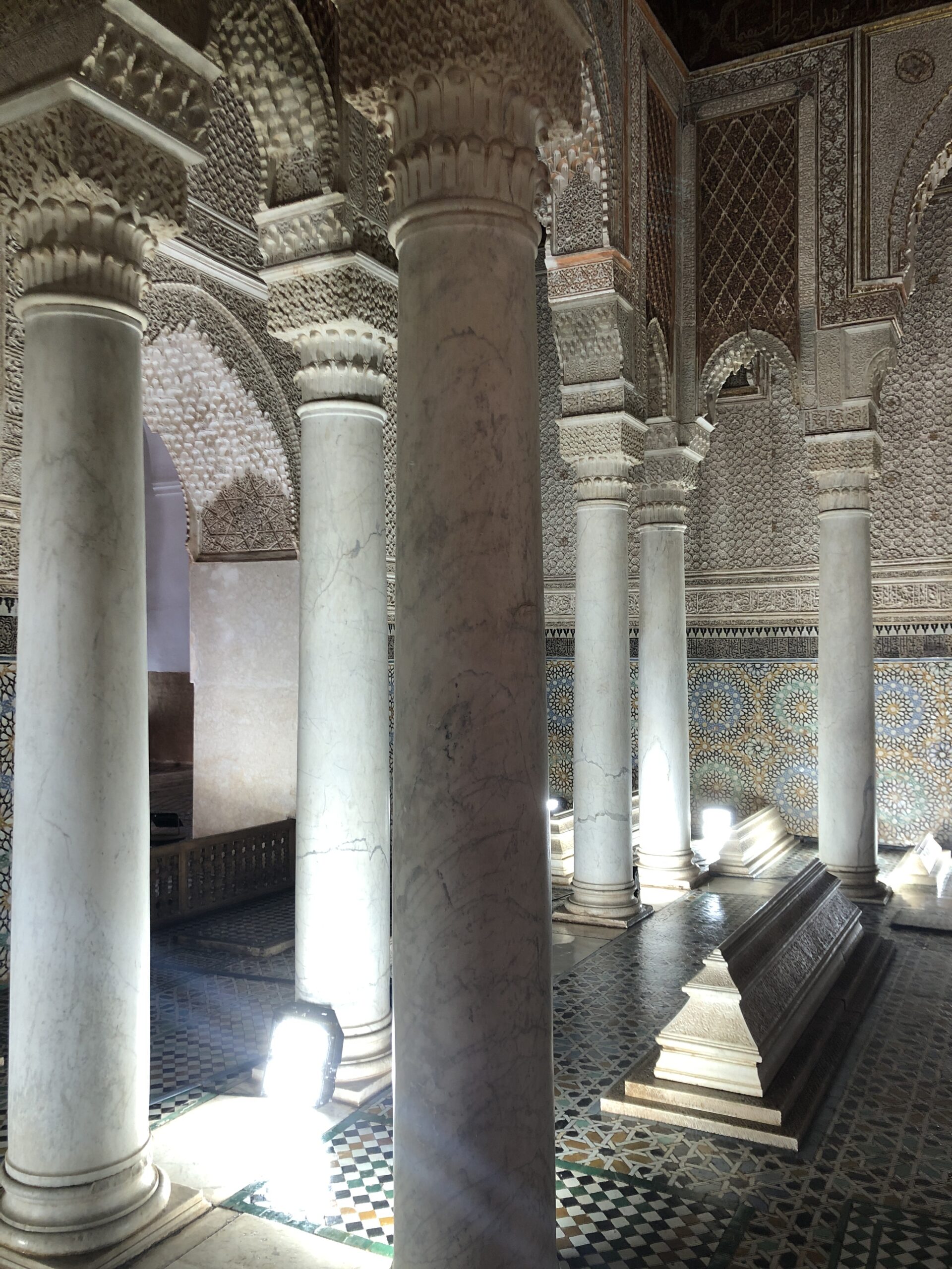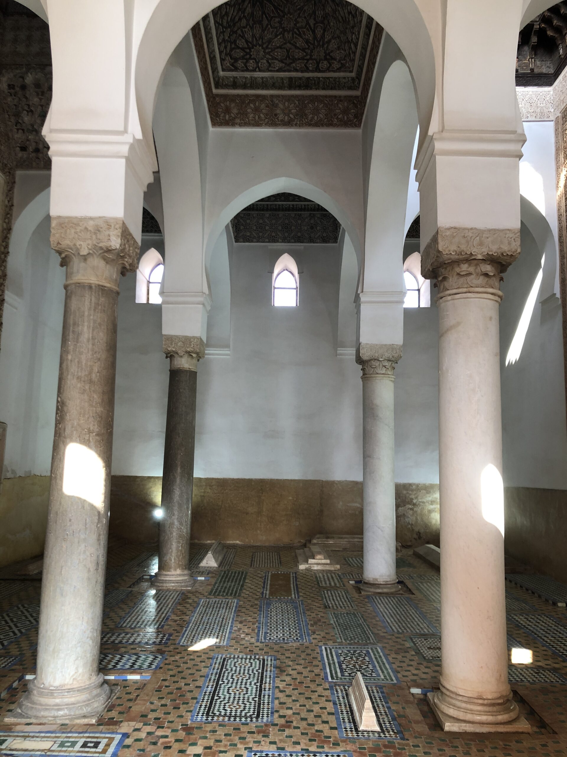 A tutti gli effetti si tratta di un cimitero monumentale, diviso in ambienti coperti ed aree verdi, che ospita centosessantasei tombe risalenti alla seconda metà 1500. Tra i defunti: il sultano Ahmad al-Mansur (il committente) e i membri della sua famiglia, oltre a cancellieri e consorti. Le tre sale facenti parte del mausoleo principale, sono decorate con mosaici che rivestono senza soluzione di continuità pareti e tombe. I capitelli e le volte delle sale sembrano fatti di trine e, uno di questi ambienti (il più famoso), ha al suo interno ben dodici colonne.