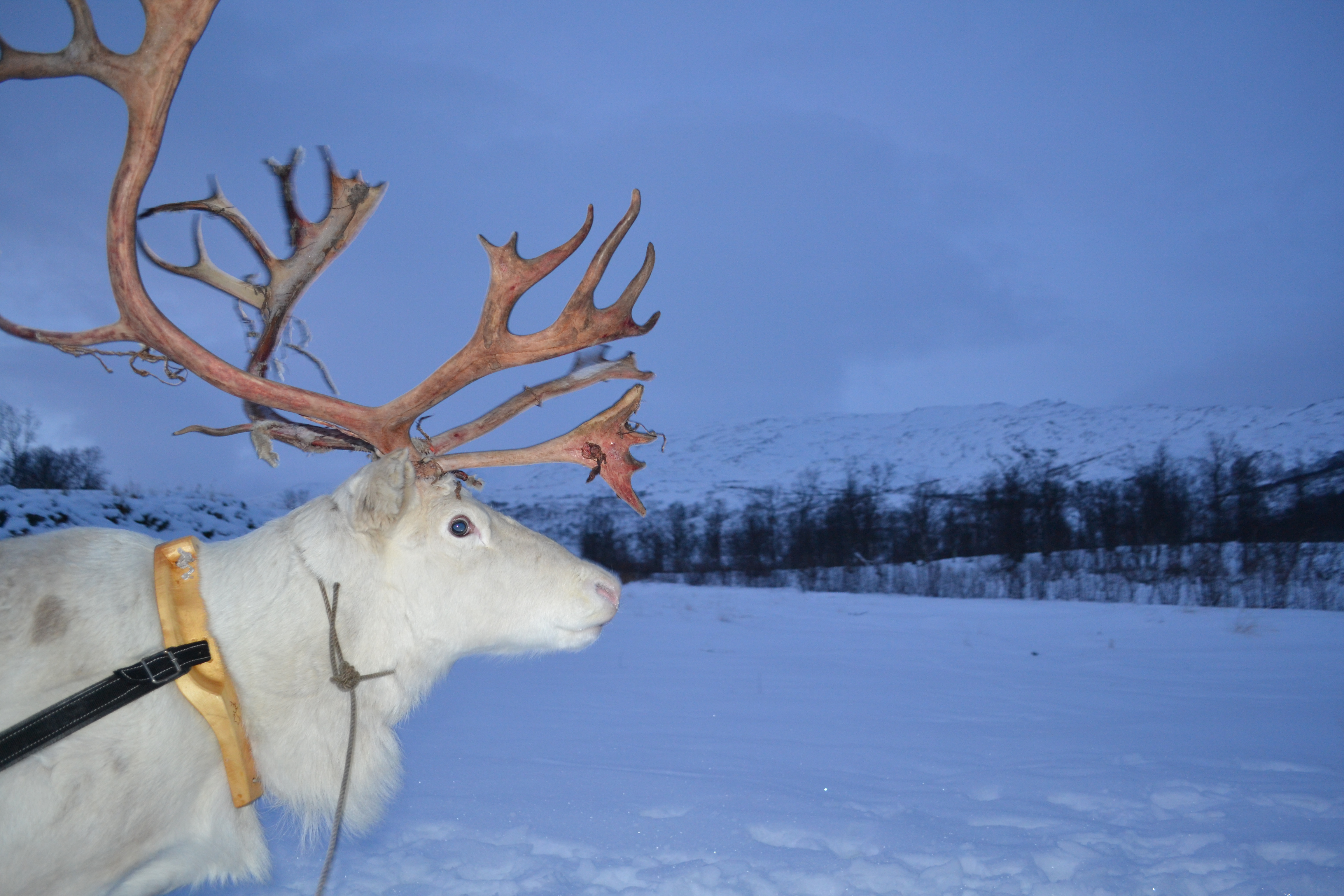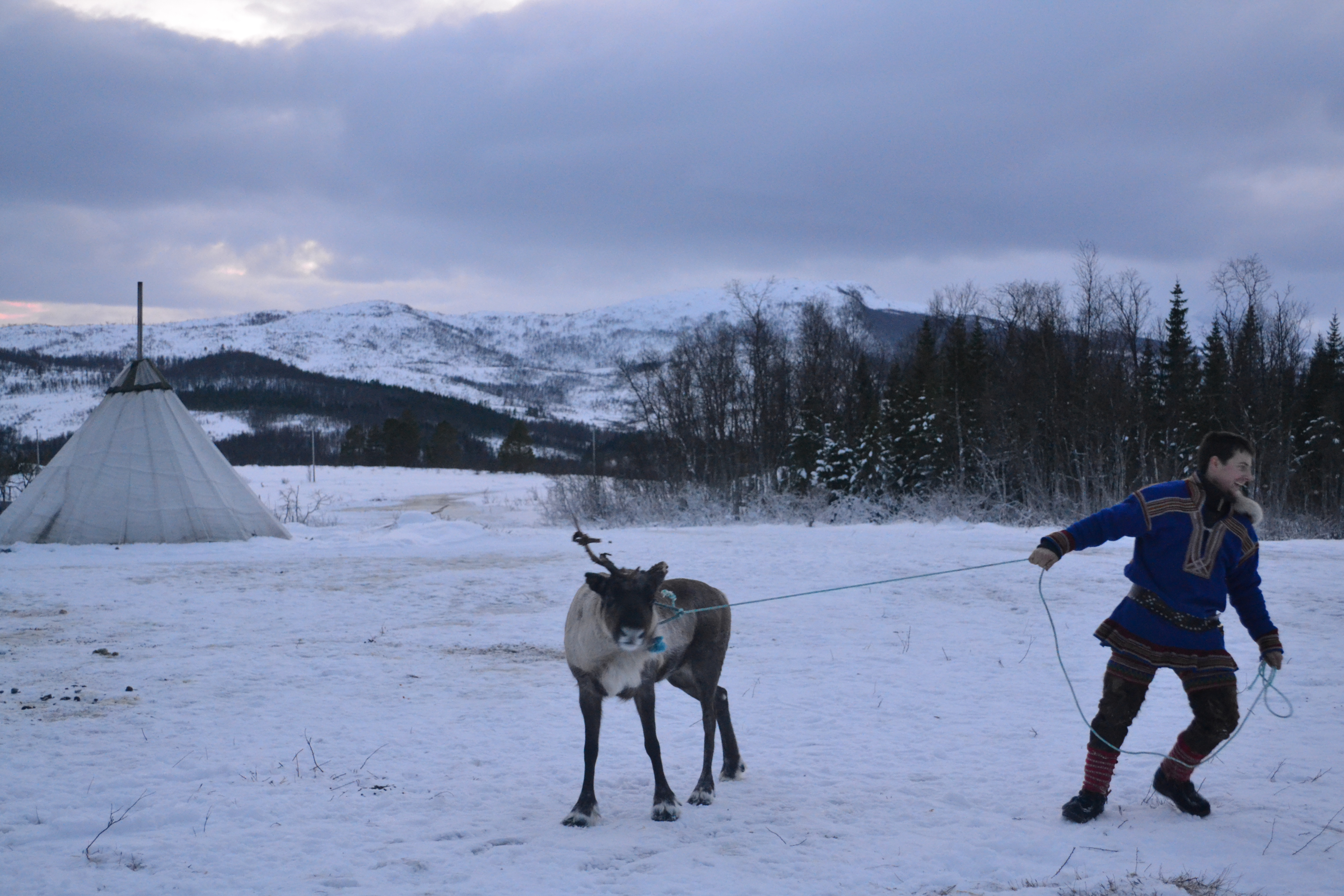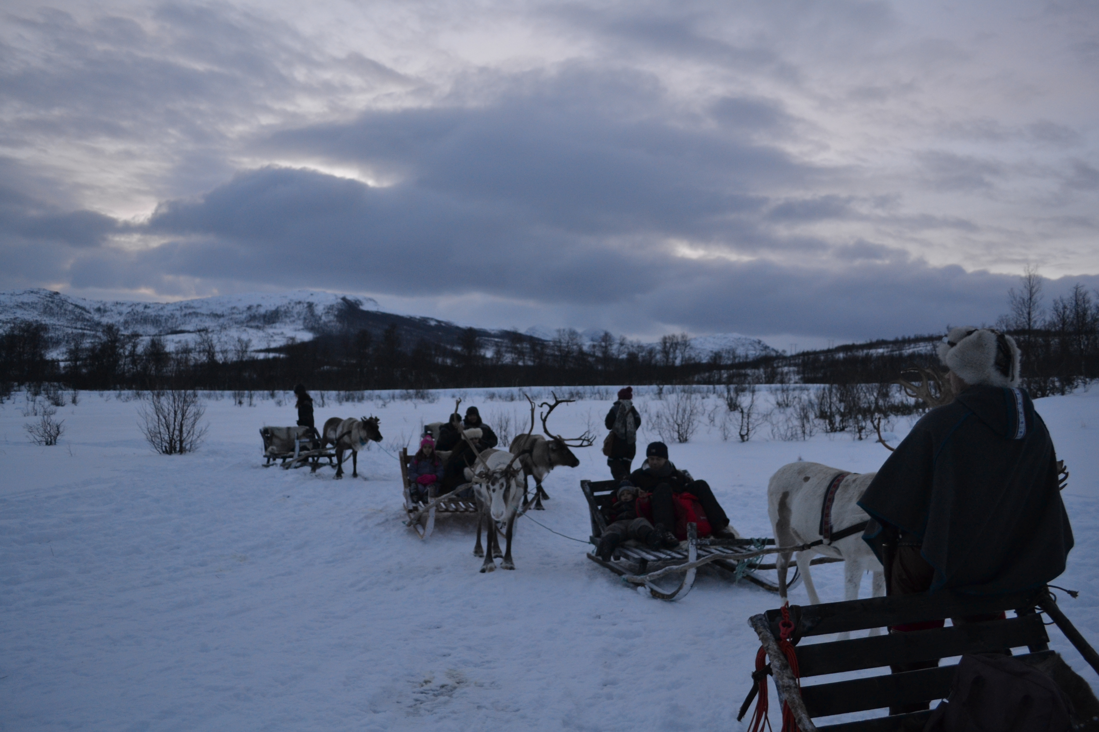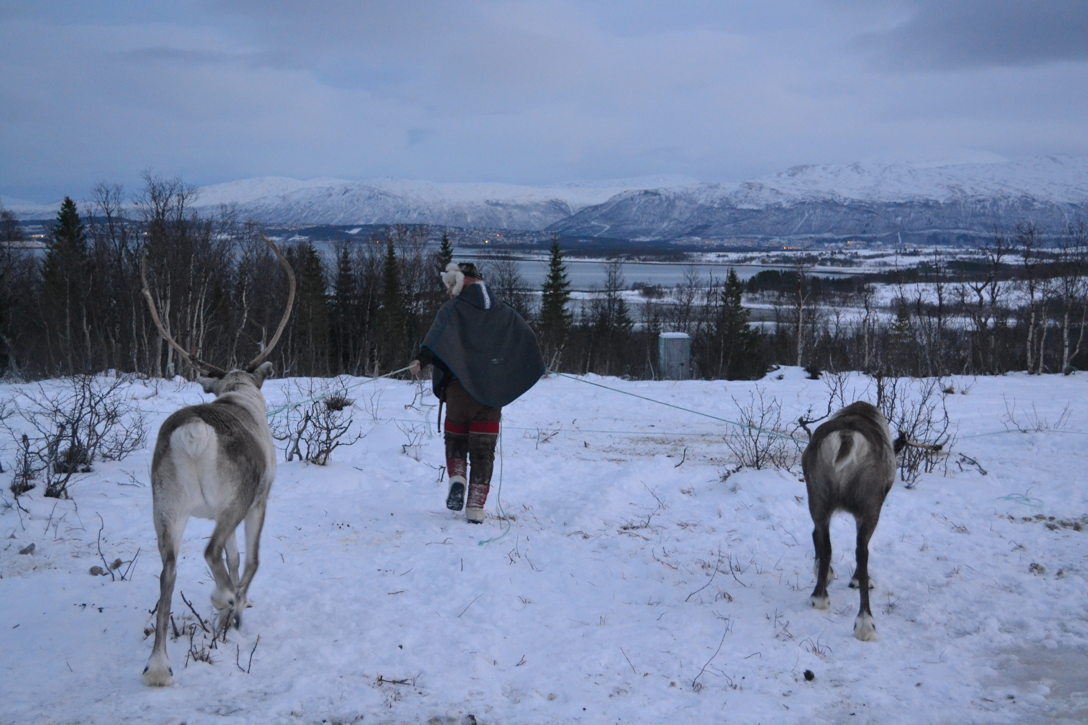Poco fuori Tromsø è possibile fare un’escursione di mezza giornata, protagoniste: le renne! Non credo ci sia nessuno al mondo che non le ami, non hanno il naso rosso ma sono egualmente tenere e irriverenti, proprio come ci si aspetta che siano le renne. Prima di raggiungere i simpatici quadrupedi, ci fermiamo per una tazza di caffè caldo in un accampamento in riva al mare sulla sponda opposta al centro. Da qui si gode di un panorama veramente elegante su tutto il golfo, le luci dorate della città sbrilluccicano laggiù in lontananza tra tutte quelle sfumature di blu. Dei veri Sami ci accompagnano in questa grandiosa avventura, sorridenti nei loro vestiti tradizionali così colorati e unici, da attribuire all’atmosfera quel magico tocco di terra straniera.