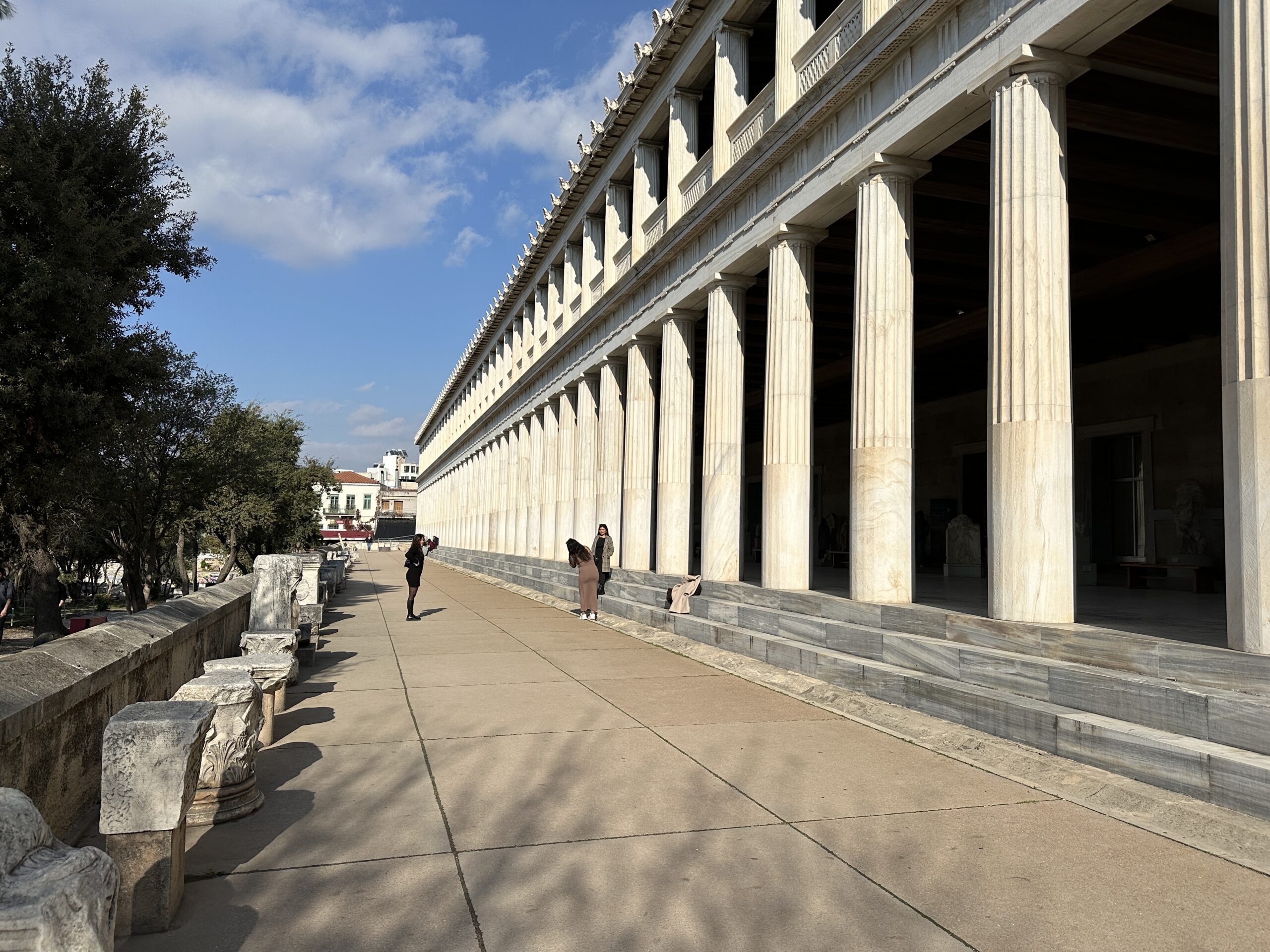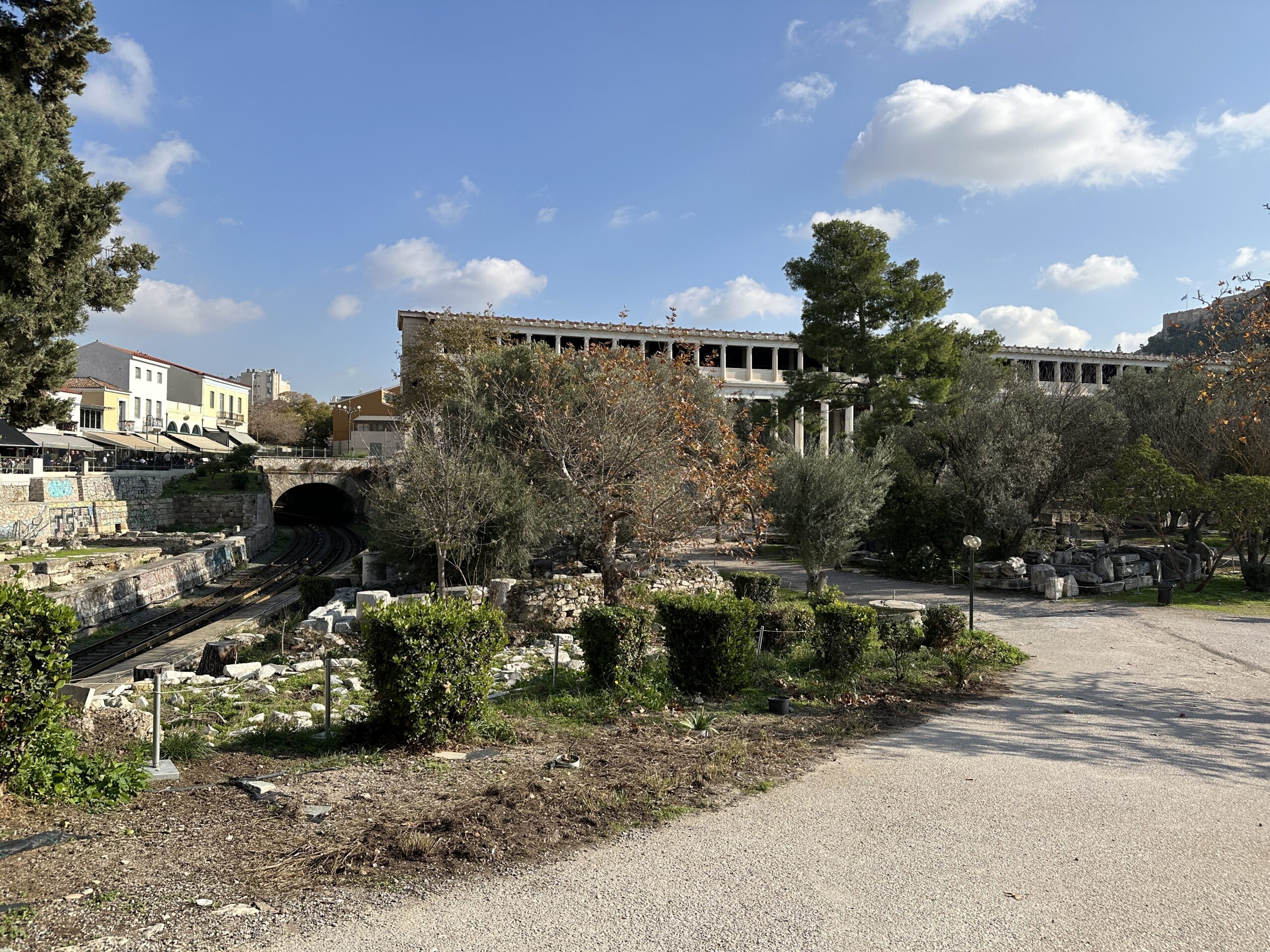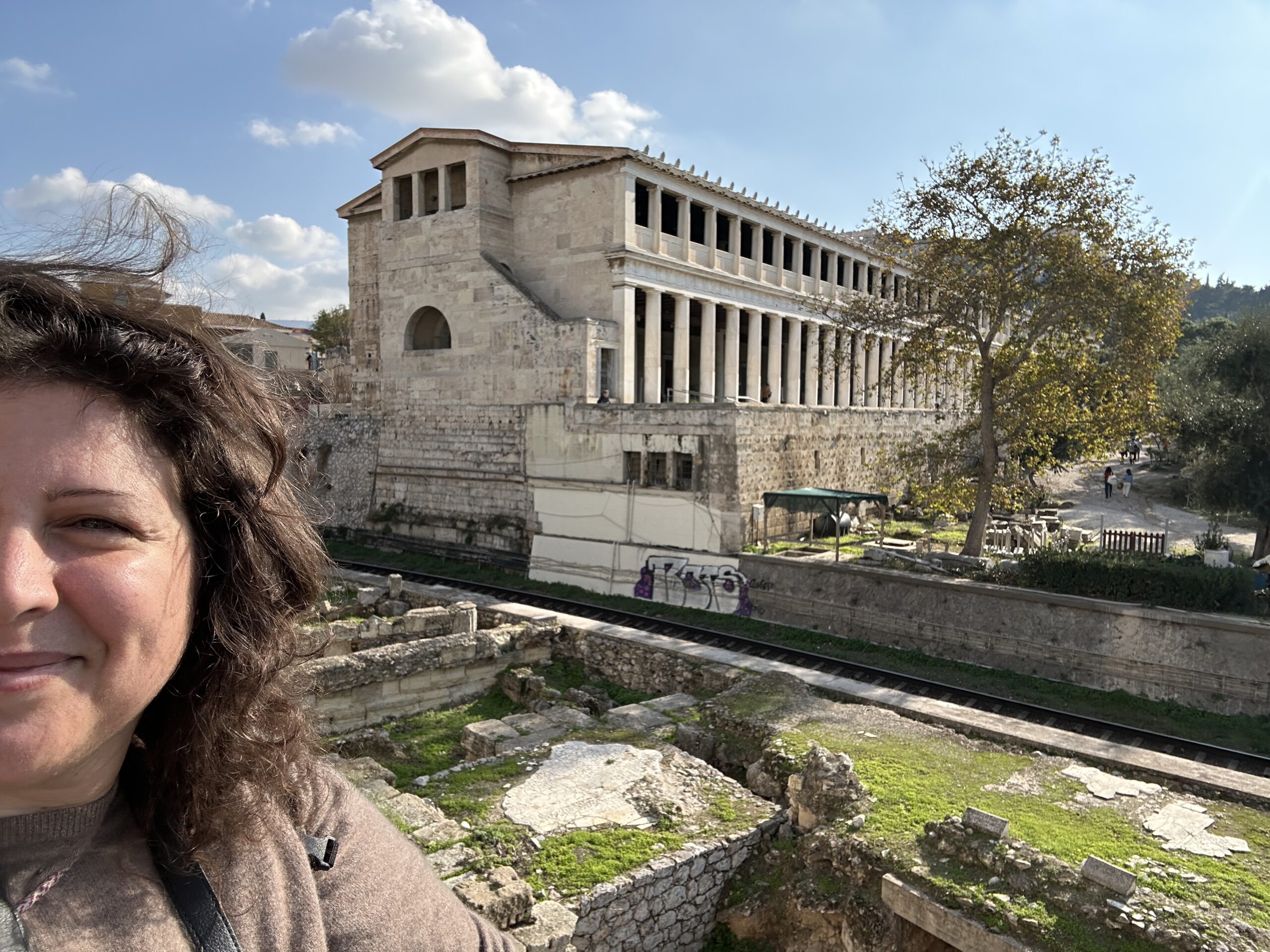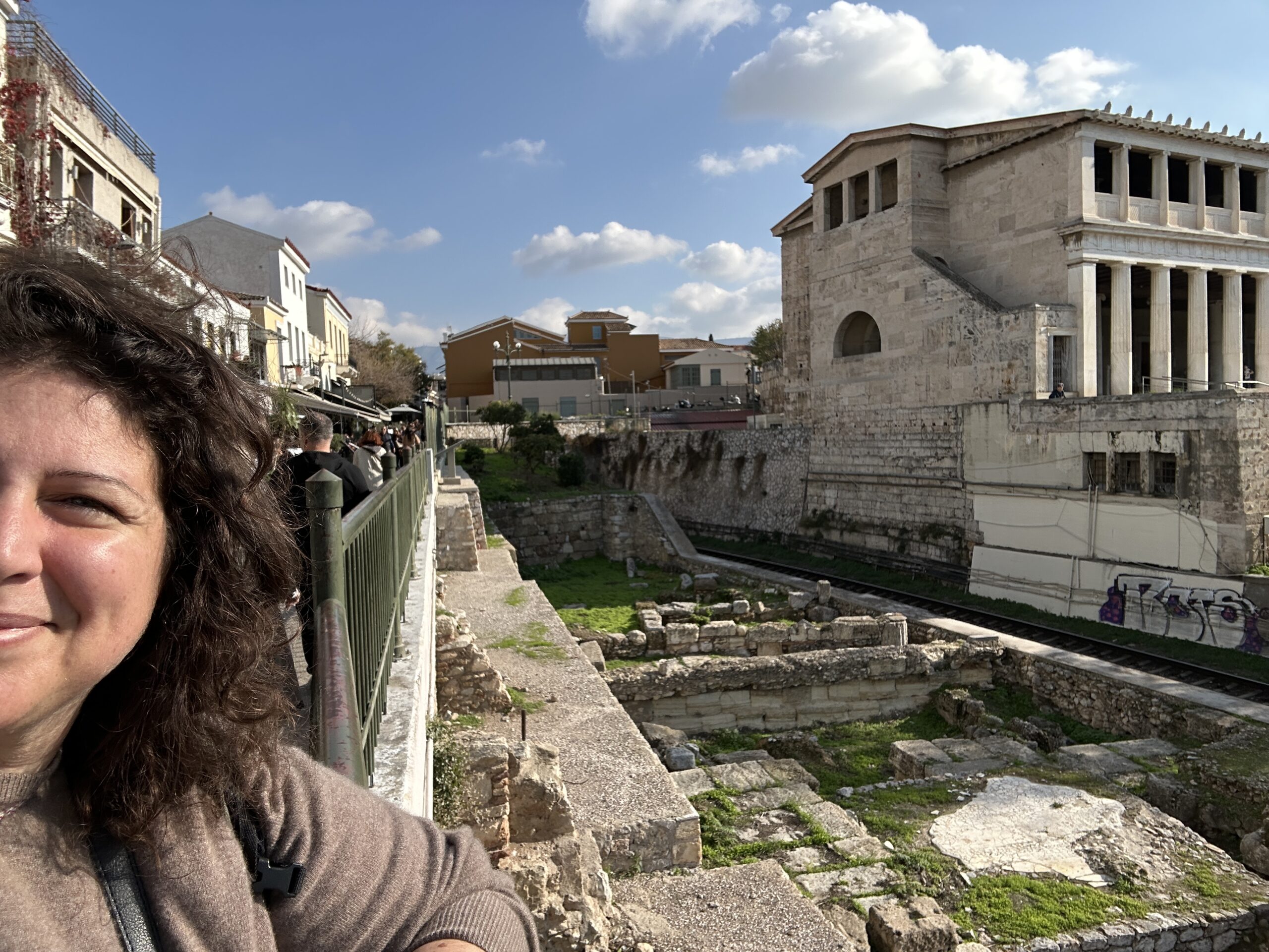 Dicembre. Un sole caldo ci conduce sino ai piedi dell’Acropoli. La dritta ferrovia separa il parco archeologico dalla strada dei ristoranti, gremita di gente e invasa da profumi invitanti. Il sito antico ha un giardino che si estende a perdita d’occhio. Ci troviamo all’interno di una delle Agorà più grandi e meglio conservate al mondo, luogo di ritrovo cittadino caratterizzato da diverse strutture che adempivano ai vari scopi sociali. Templi, mercati, altari, pinacoteche, piazze; se potessimo tornare indietro nel tempo scorgeremmo animali destinati alla vendita o al sacrificio, banchetti, uomini di cultura scambiarsi vicendevolmente idee e pensieri all’ombra di qualche albero, fedeli ammirare con lo sguardo all’insù le alte colonne dei templi. Le musiche e lo stridore degli zoccoli dei cavalli sul selciato non si odono più, c’è un piacevole silenzio interrotto da qualche flebile miagolio. C’è tanto verde, macchiato qua e là da candidi resti architettonici, e ci sono molti gatti che si nascondono ai turisti, bighellonano, si trascinano goffamente in giro, saltando tra un resto di colonna ed un capitello mezzo interrato.
