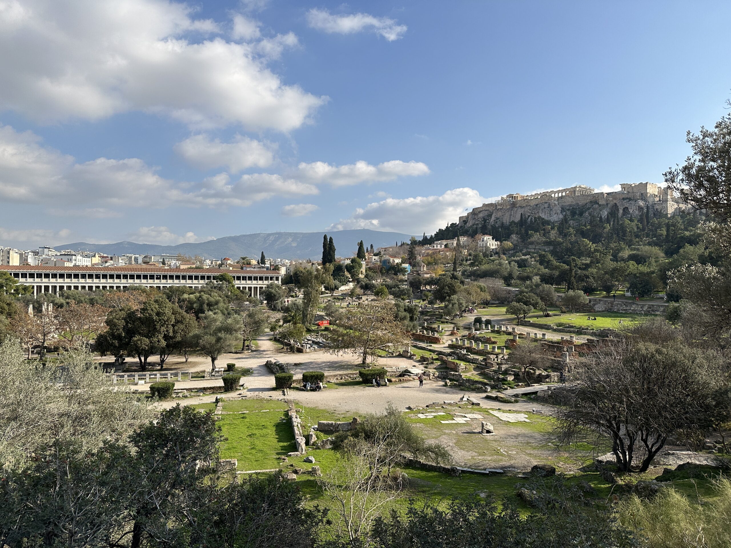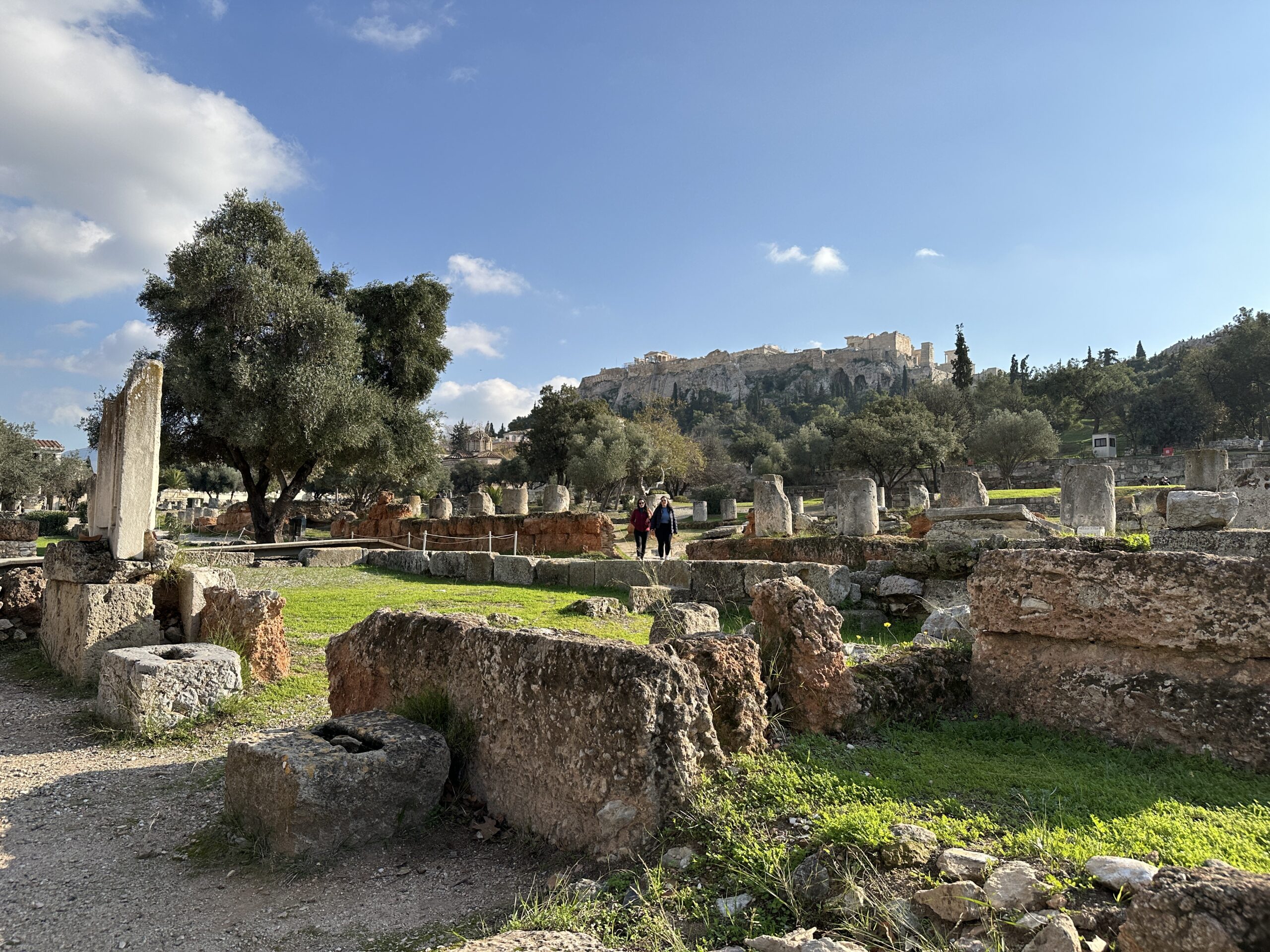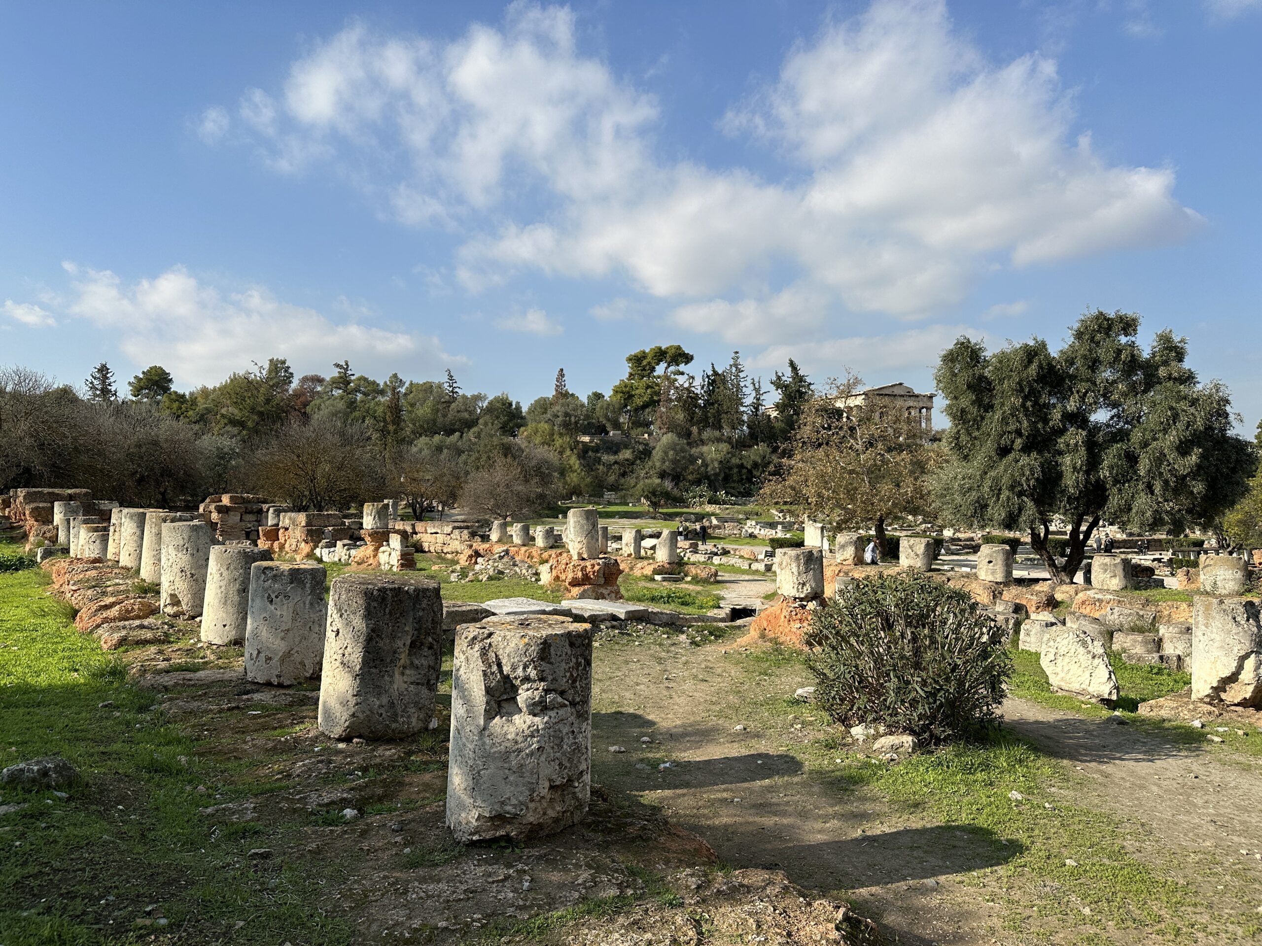 Dicembre. Un sole caldo ci conduce sino ai piedi dell’Acropoli. La dritta ferrovia separa il parco archeologico dalla strada dei ristoranti, gremita di gente e invasa da profumi invitanti. Il sito antico ha un giardino che si estende a perdita d’occhio. Ci troviamo all’interno di una delle Agorà più grandi e meglio conservate al mondo, luogo di ritrovo cittadino caratterizzato da diverse strutture che adempivano ai vari scopi sociali. Templi, mercati, altari, pinacoteche, piazze; se potessimo tornare indietro nel tempo scorgeremmo animali destinati alla vendita o al sacrificio, banchetti, uomini di cultura scambiarsi vicendevolmente idee e pensieri all’ombra di qualche albero, fedeli ammirare con lo sguardo all’insù le alte colonne dei templi. Le musiche e lo stridore degli zoccoli dei cavalli sul selciato non si odono più, c’è un piacevole silenzio interrotto da qualche flebile miagolio. C’è tanto verde, macchiato qua e là da candidi resti architettonici, e ci sono molti gatti che si nascondono ai turisti, bighellonano, si trascinano goffamente in giro, saltando tra un resto di colonna ed un capitello mezzo interrato.