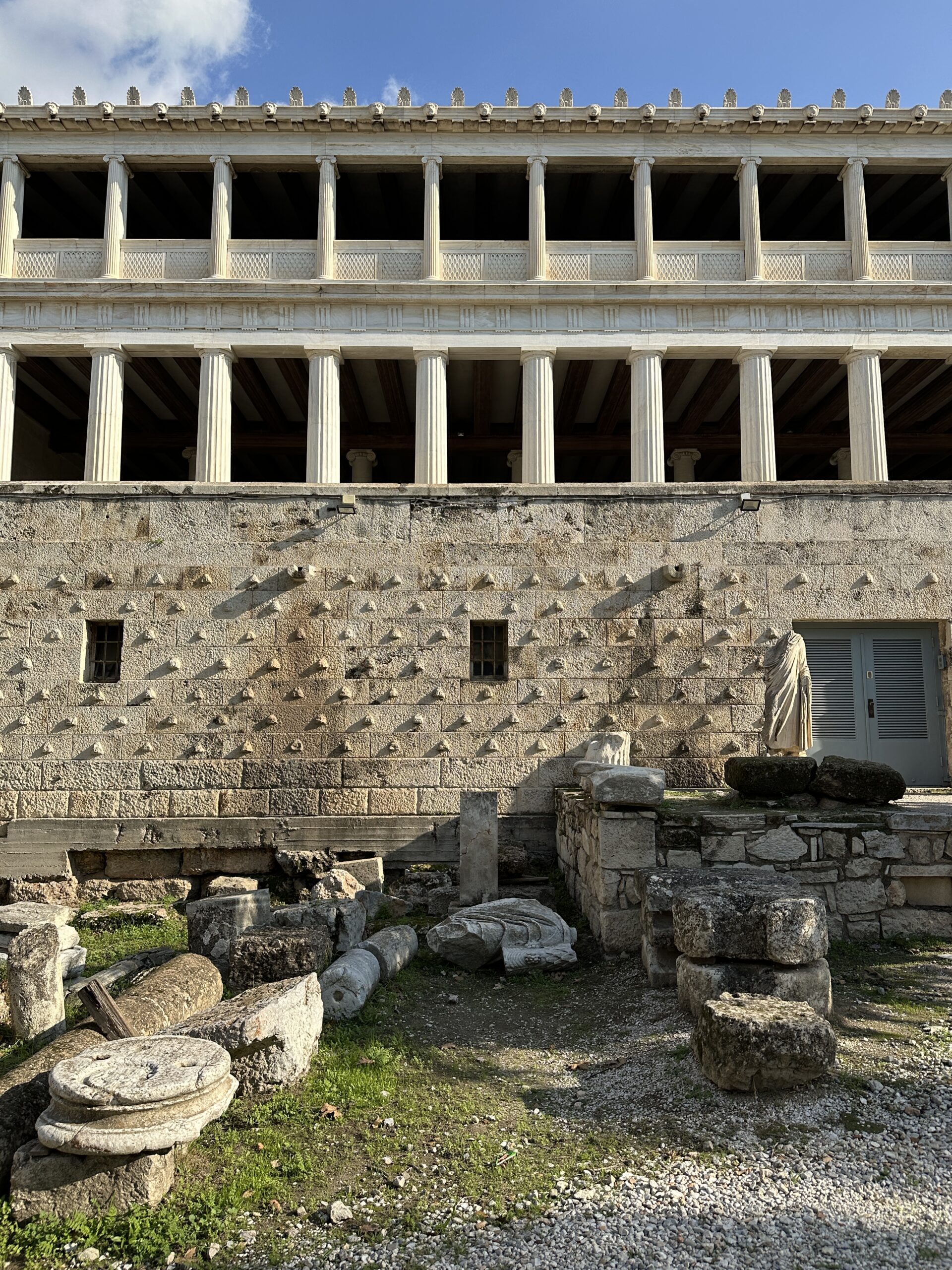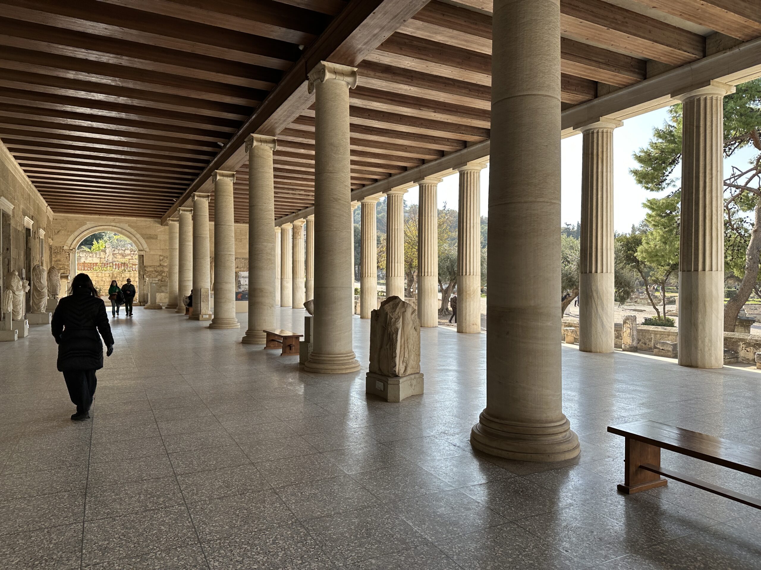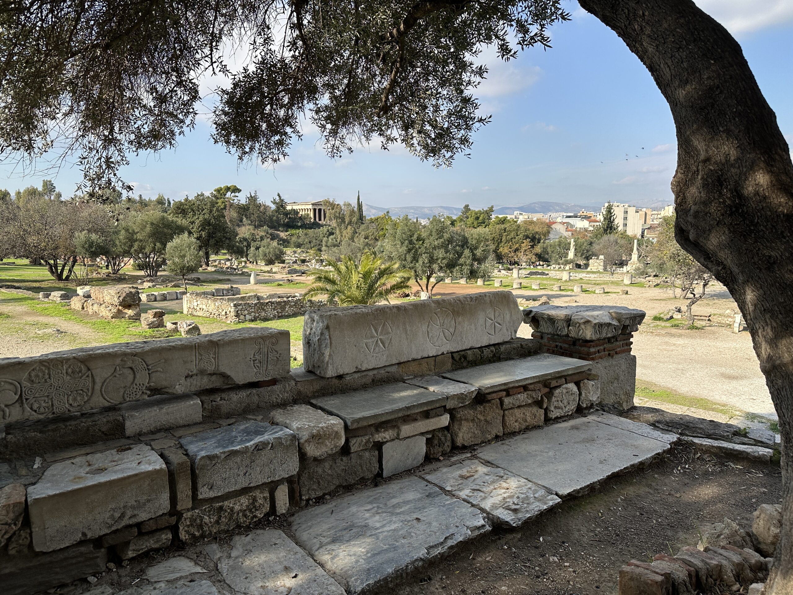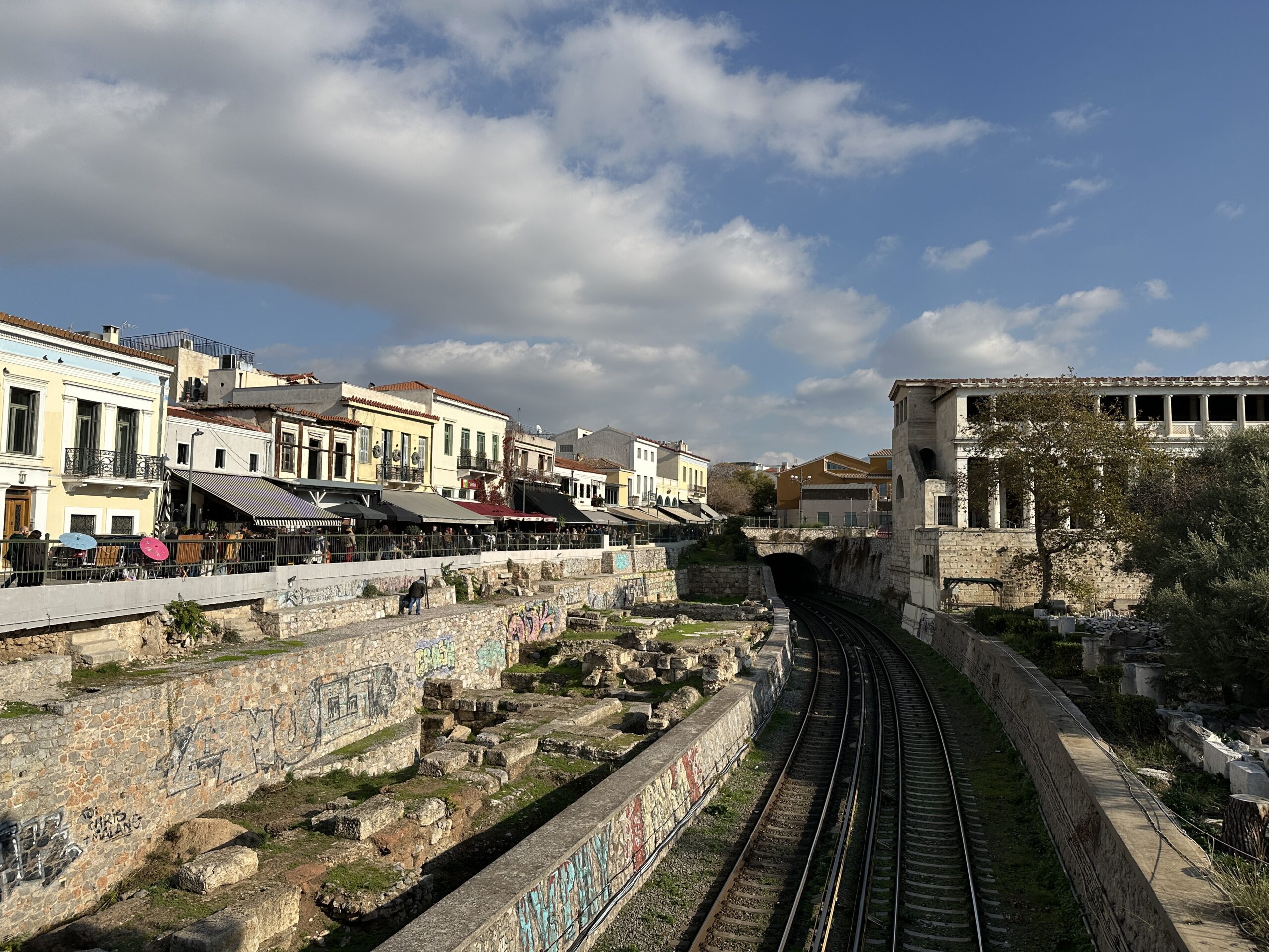 Dicembre. Un sole caldo ci conduce sino ai piedi dell’Acropoli. La dritta ferrovia separa il parco archeologico dalla strada dei ristoranti, gremita di gente e invasa da profumi invitanti. Il sito antico ha un giardino che si estende a perdita d’occhio. Ci troviamo all’interno di una delle Agorà più grandi e meglio conservate al mondo, luogo di ritrovo cittadino caratterizzato da diverse strutture che adempivano ai vari scopi sociali. Templi, mercati, altari, pinacoteche, piazze; se potessimo tornare indietro nel tempo scorgeremmo animali destinati alla vendita o al sacrificio, banchetti, uomini di cultura scambiarsi vicendevolmente idee e pensieri all’ombra di qualche albero, fedeli ammirare con lo sguardo all’insù le alte colonne dei templi. Le musiche e lo stridore degli zoccoli dei cavalli sul selciato non si odono più, c’è un piacevole silenzio interrotto da qualche flebile miagolio. C’è tanto verde, macchiato qua e là da candidi resti architettonici, e ci sono molti gatti che si nascondono ai turisti, bighellonano, si trascinano goffamente in giro, saltando tra un resto di colonna ed un capitello mezzo interrato.