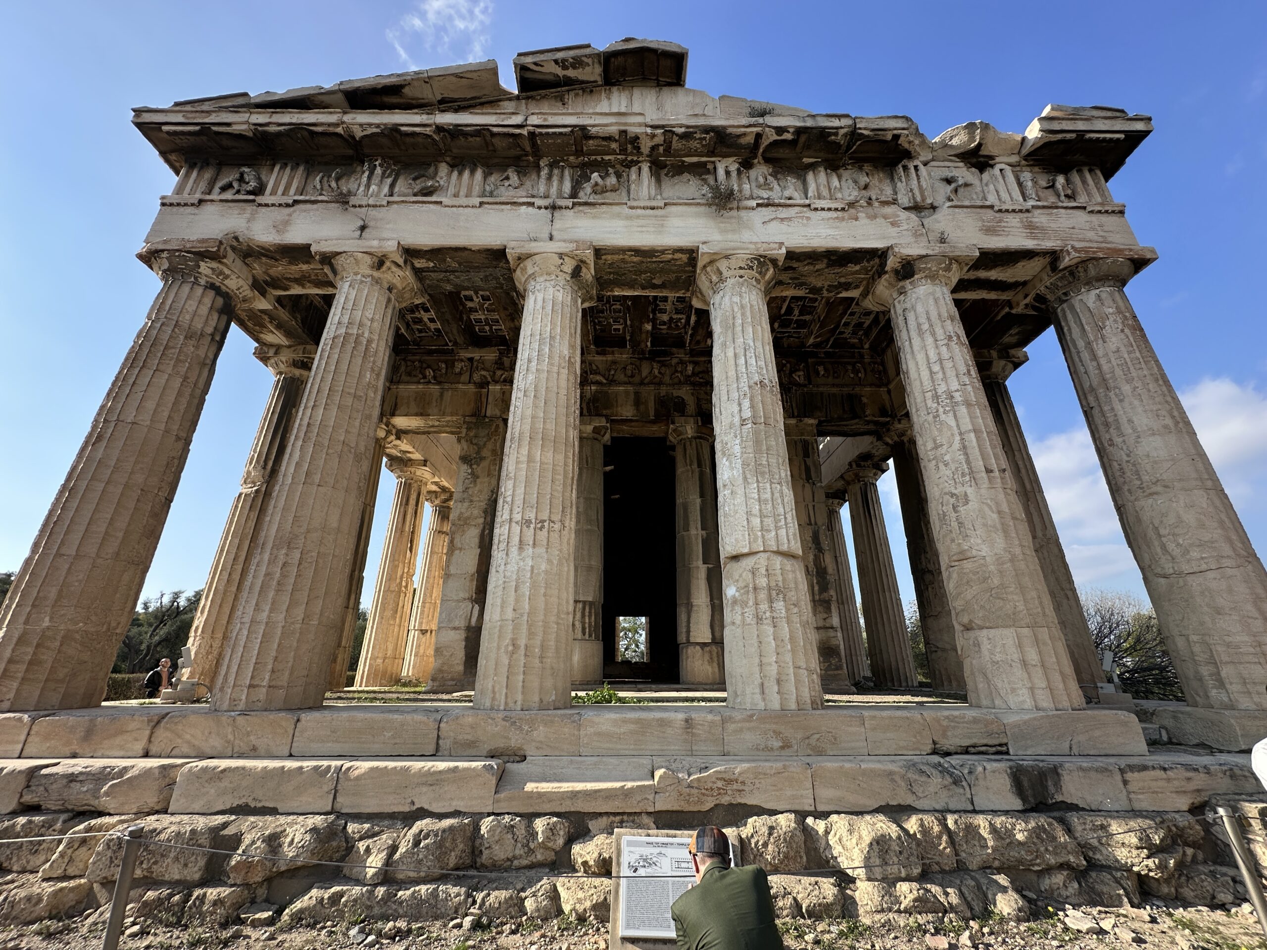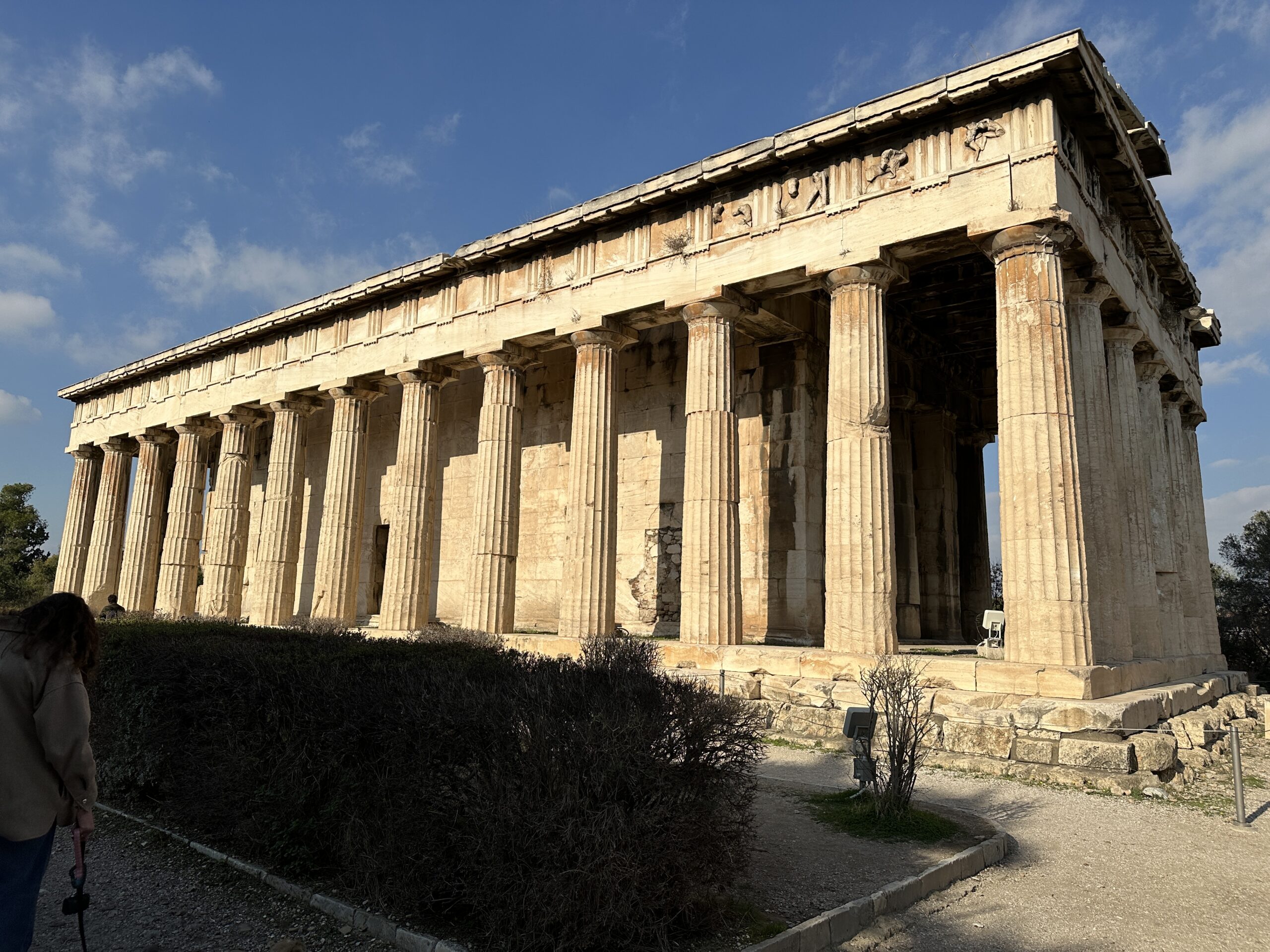 Poco distante c’è una solitaria chiesetta bizantina e, dall’altro lato del palco, su una piccola altura, il templio di Efesto. Questo sì che fa emozionare! Si tratta del tempio dorico meglio conservato al mondo. Relativamente piccolo, al suo cospetto appare come un gigante. Lo guardiamo girandogli attorno come naviganti che circumnavigano un’isola sconosciuta, come geometri che ispezionano una casa appena acquistata. Lo spiovente del tetto è crollato in alcune parti, il frontone non è più completo, alcuni gradoni sono stati spezzati, delle colonne sono state intaccate, il fregio è parzialmente annerito, lungo l’architrave dei timidi cespuglietti sono riusciti a trovar dimora ma, tutto sommato, uno degli edifici più affascinanti del V secolo a.C.