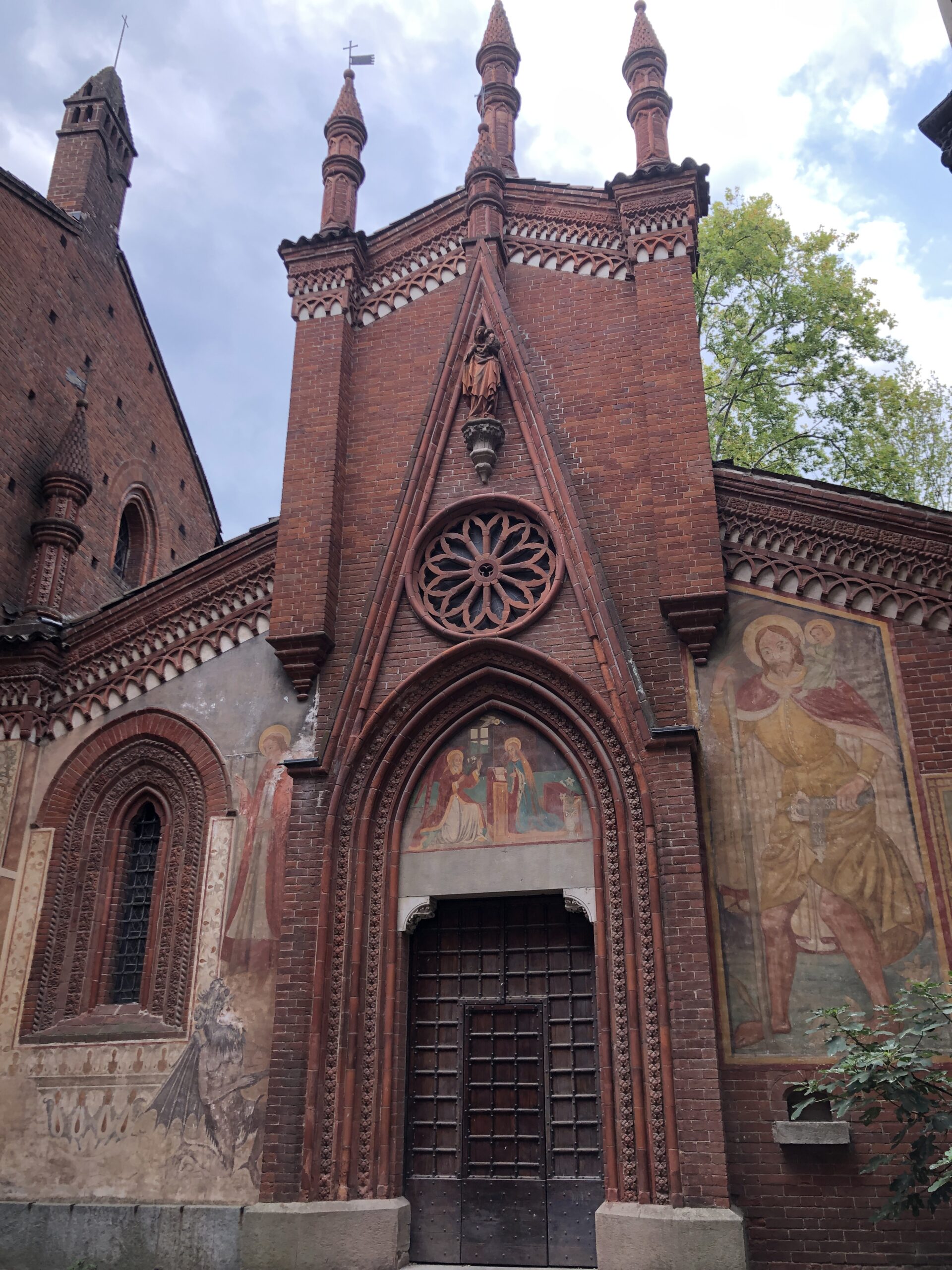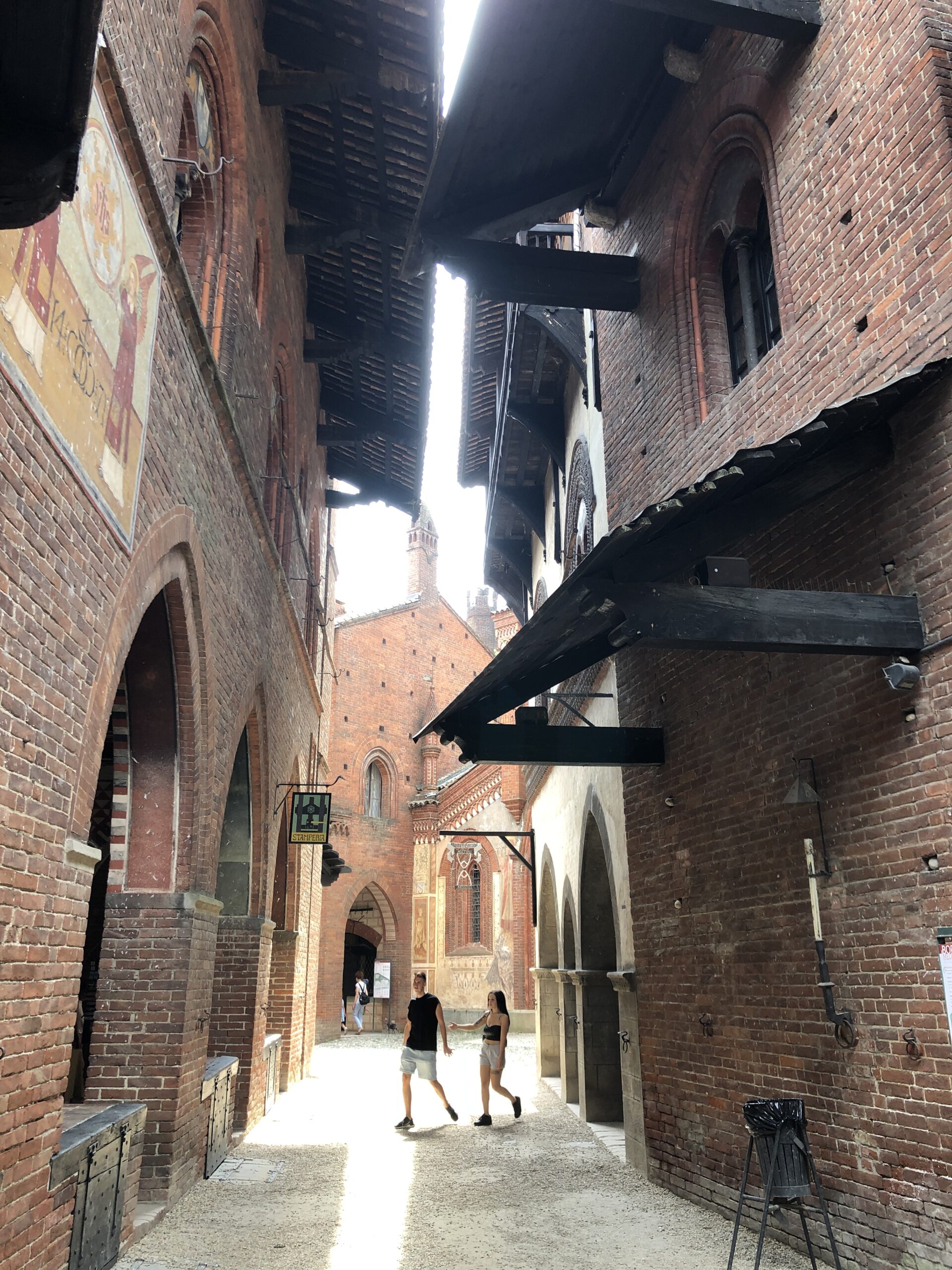 Anche le facciate di mattoni delle case hanno ghirigori e fregi, le finestre sono quasi tutte bifore e dopo qualche passo, si arriva ad una piccola piazzetta con un’altra fontana un piccolo giardino e l’uscita dal borgo.