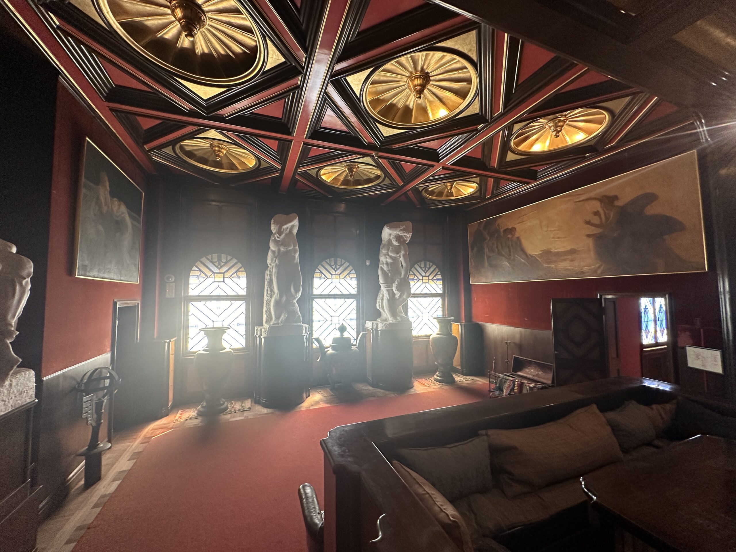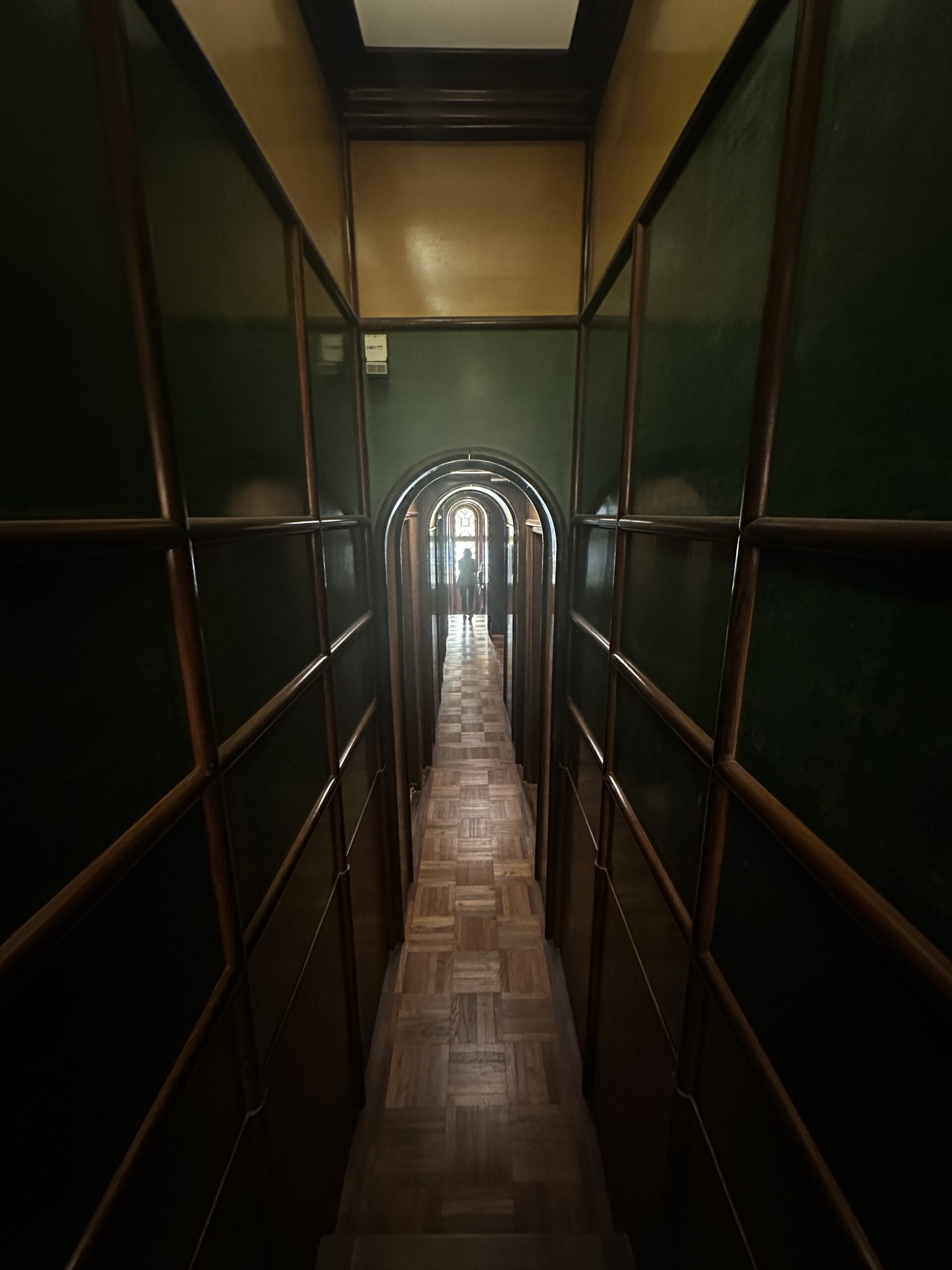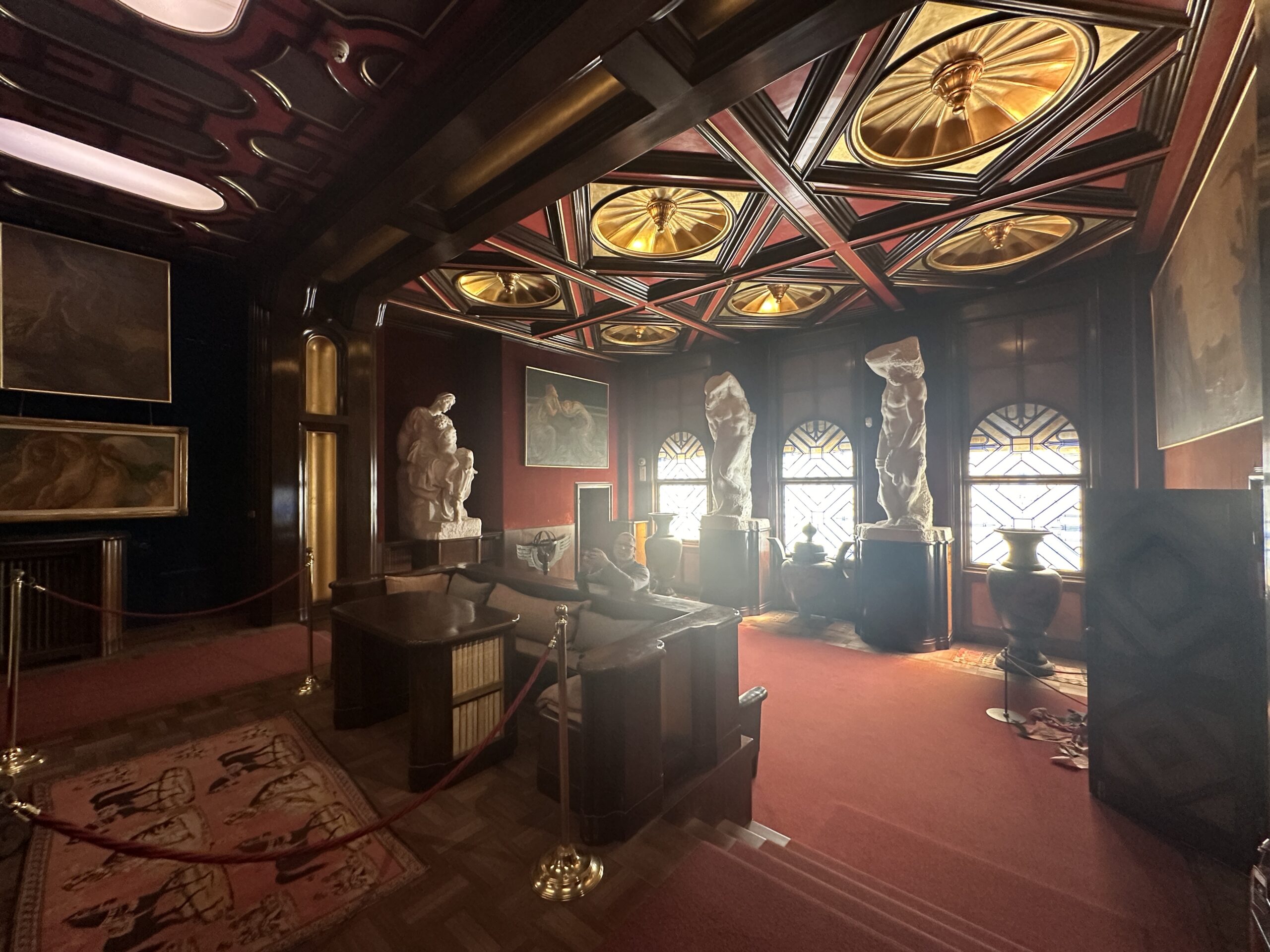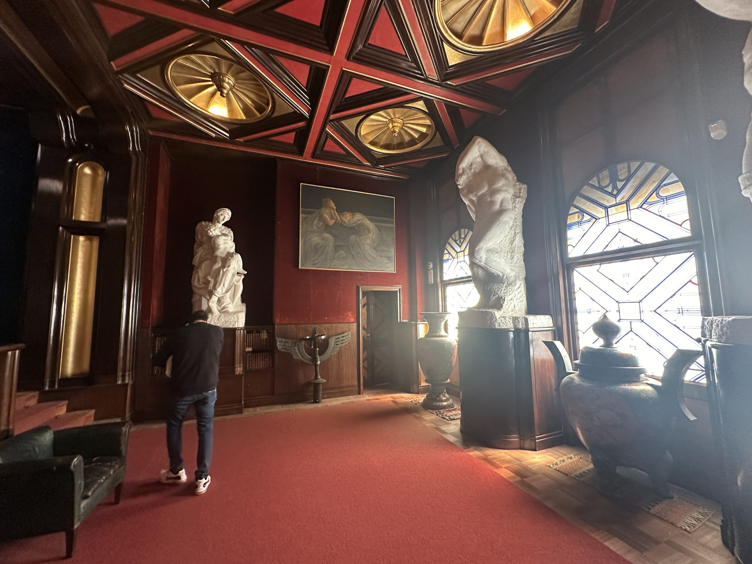 La visita continua senza sosta tra sentore di incensi, odore di legno e, il mio preferito, profumo di libri e carta stampata. Esaurita la parte privata si giunge in una stanza di grandi dimensioni che appare come il set di un film hollywoodiano, con colori accesi e colonne enormi. Da qui inizia la parte nuova della dimora, quella che si può fotografare, quella adibita a museo.