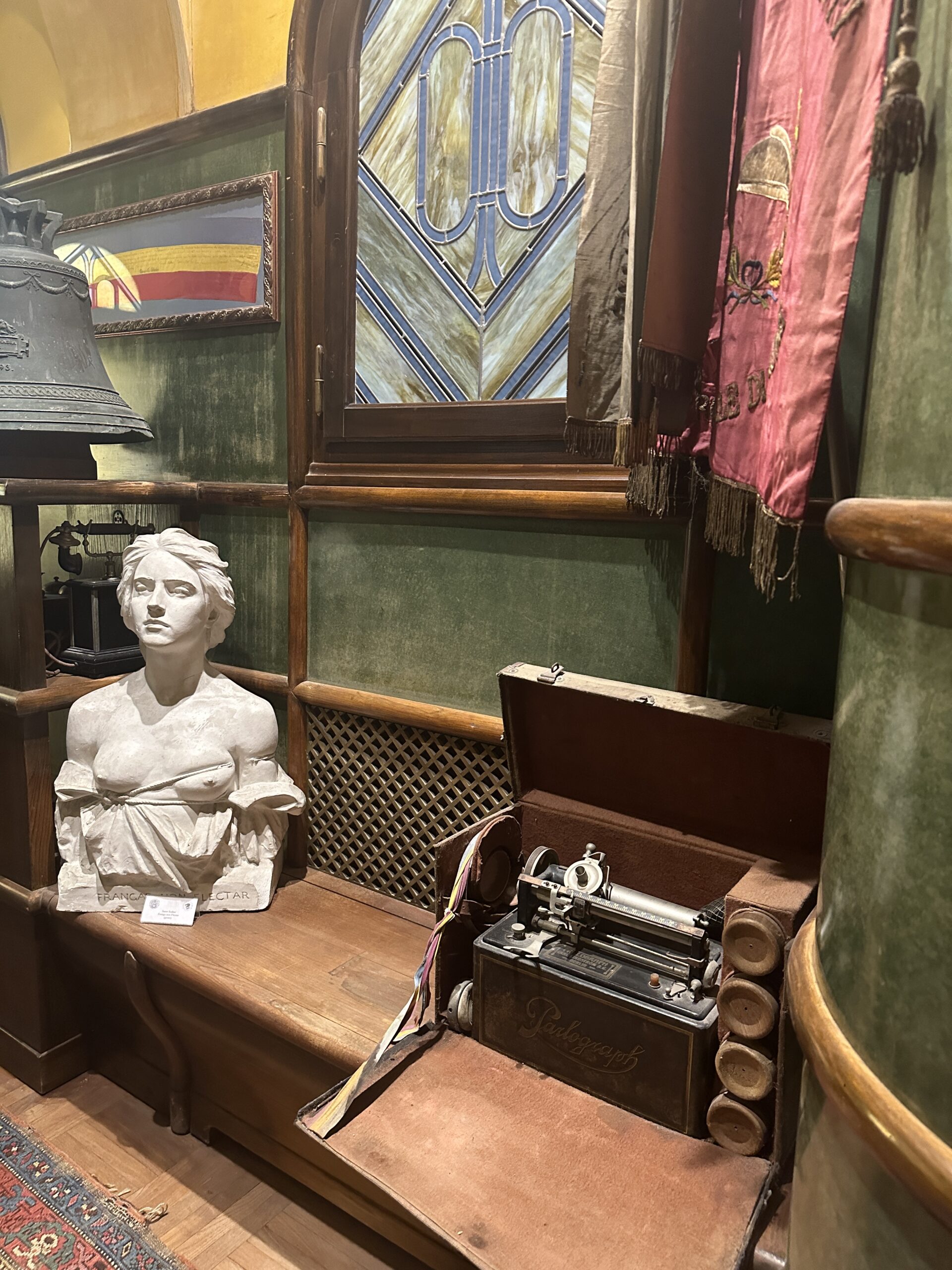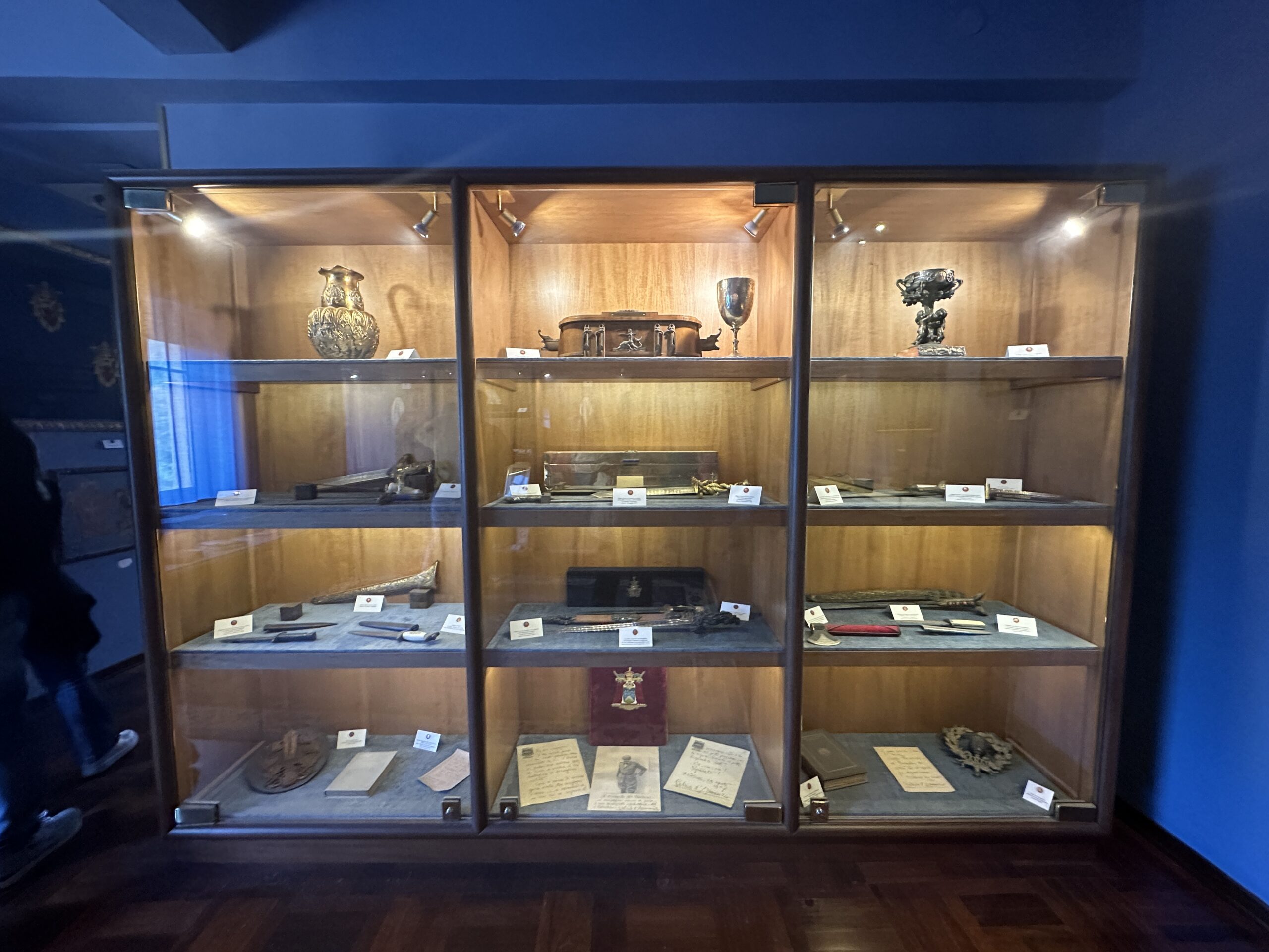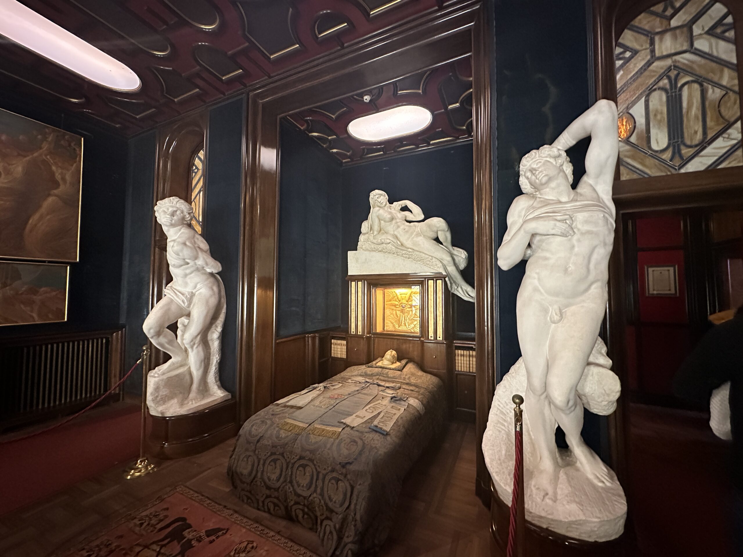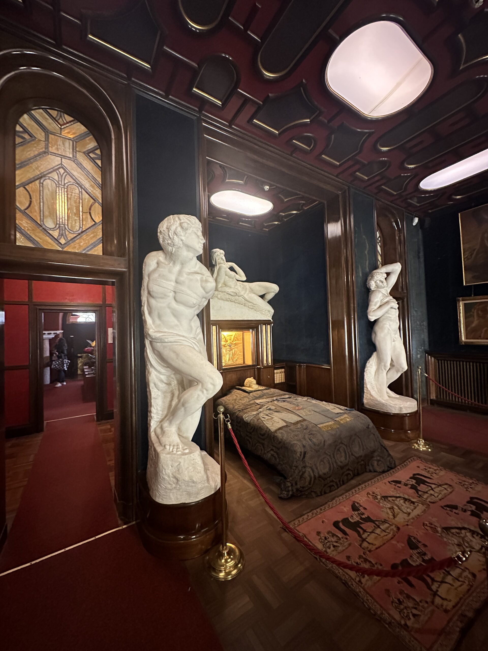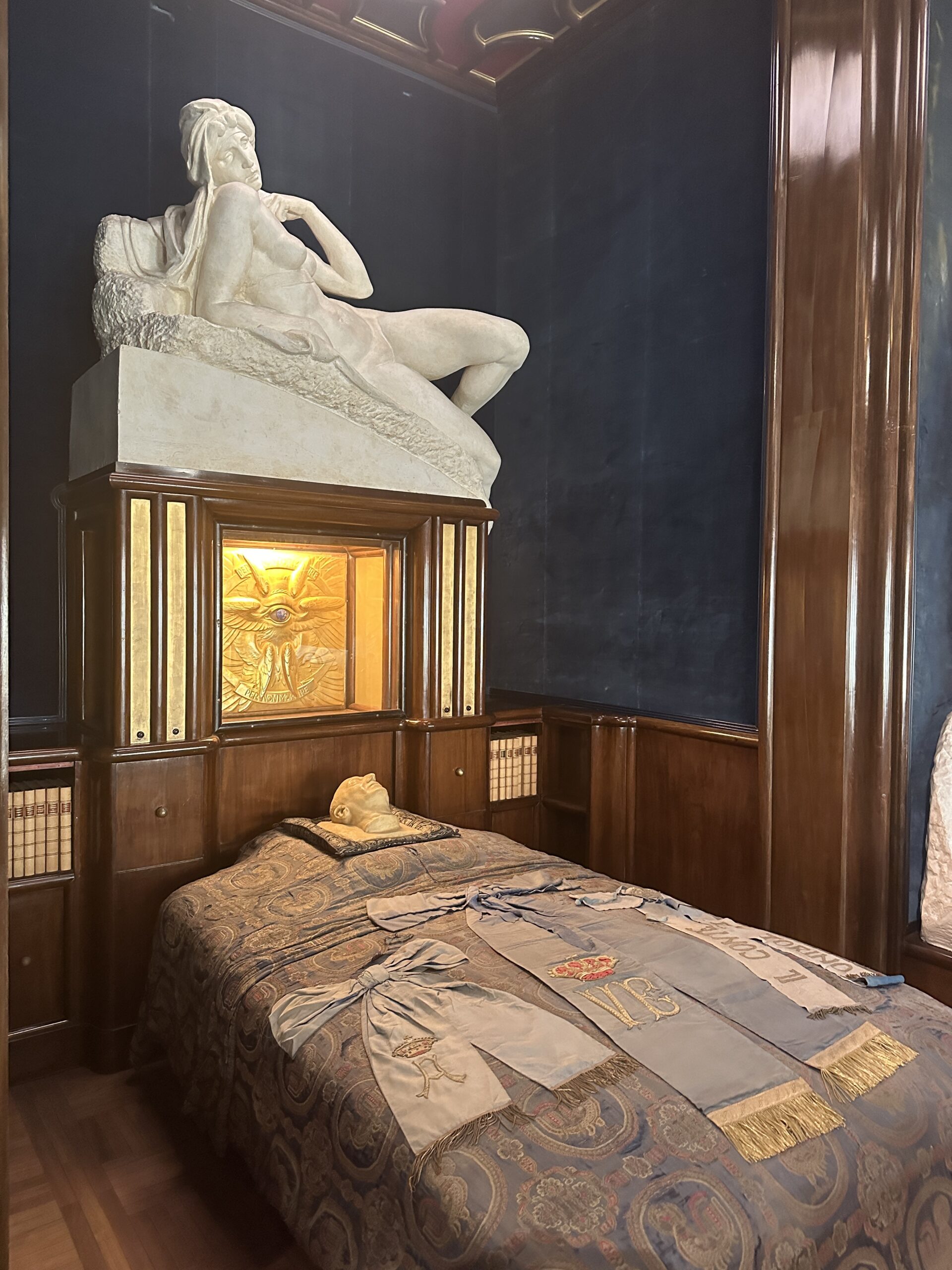 La stanza adiacente alla sala d’attesa è un tripudio di luci gialle e drappi neri. Strumenti musicali, statue di Budda, violini, tende di seta, draghi cinesi e oggettistica proveniente da tutto il mondo. Inizio a pensare che pulire questa casa doveva essere un lavoro a tempo pieno e che la penombra poteva aiutare anche a nascondere qualche strato di polvere nascosto tra le pieghe di così tanti aggeggi. Il piccolo studiolo è occupato quasi interamente da una scrivania utilizzata come scrittorio e come tavolo per mangiare in solitudine lontano da occhi indiscreti. La osserviamo con un po’ più di attenzione perché è qui che il 1 marzo del 1938, all’età di 74 anni, Gabriele morì.