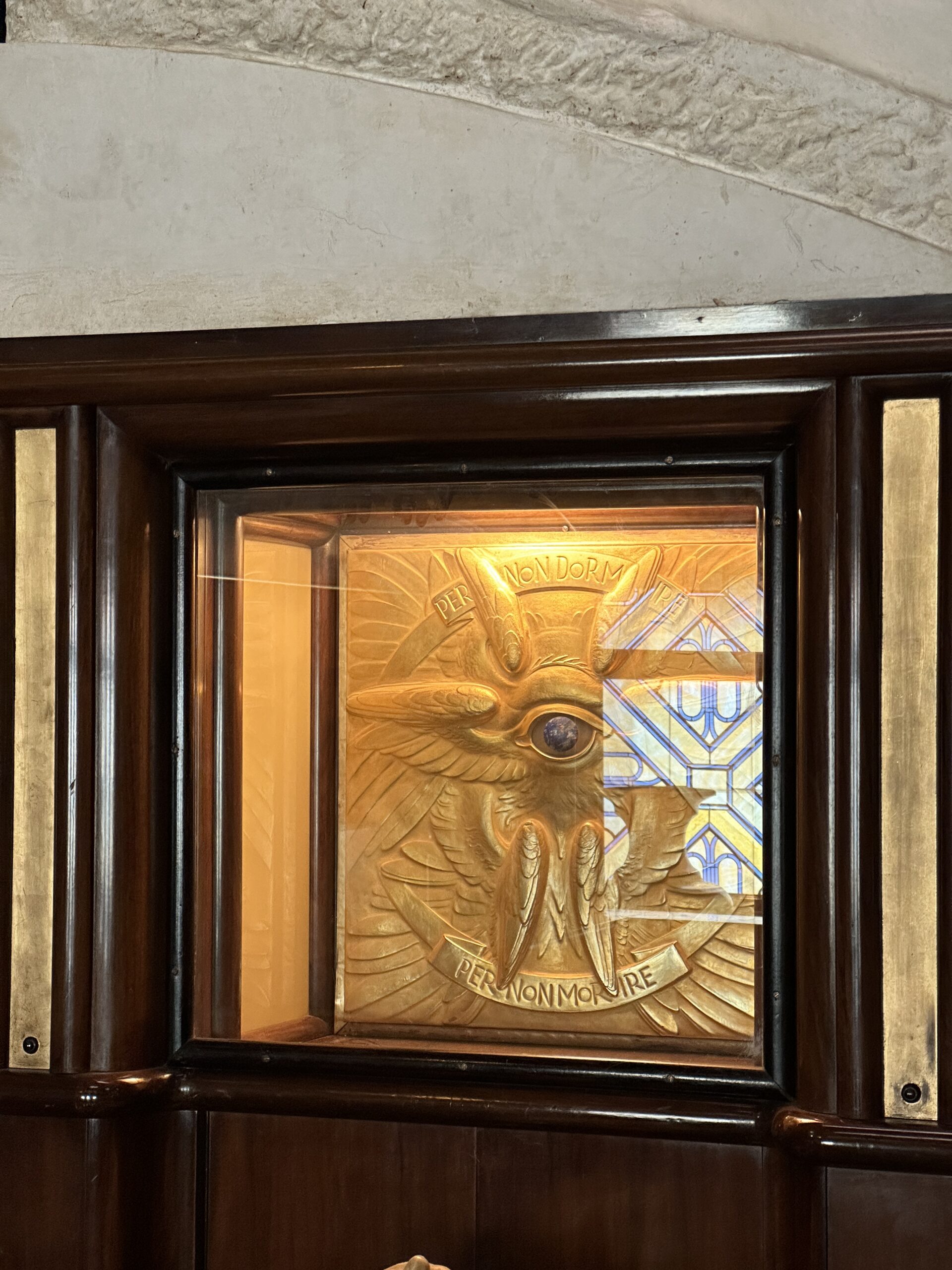 ‘aggiusta le tue maschere al tuo visto ma pensa che sei vetro contro acciaio’ recita la scritta sopra il camino della sala del mascheraio, che altro non era che il luogo in cui attendevano gli ospiti in visita. Pare che proprio qui, nel 1925, Mussolini sia rimasto a sedere un paio d’ore prima di essere ricevuto dal padrone di casa.