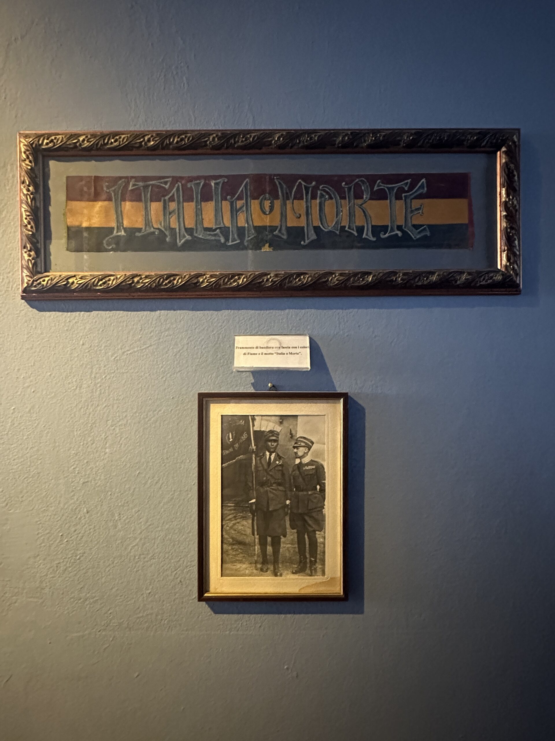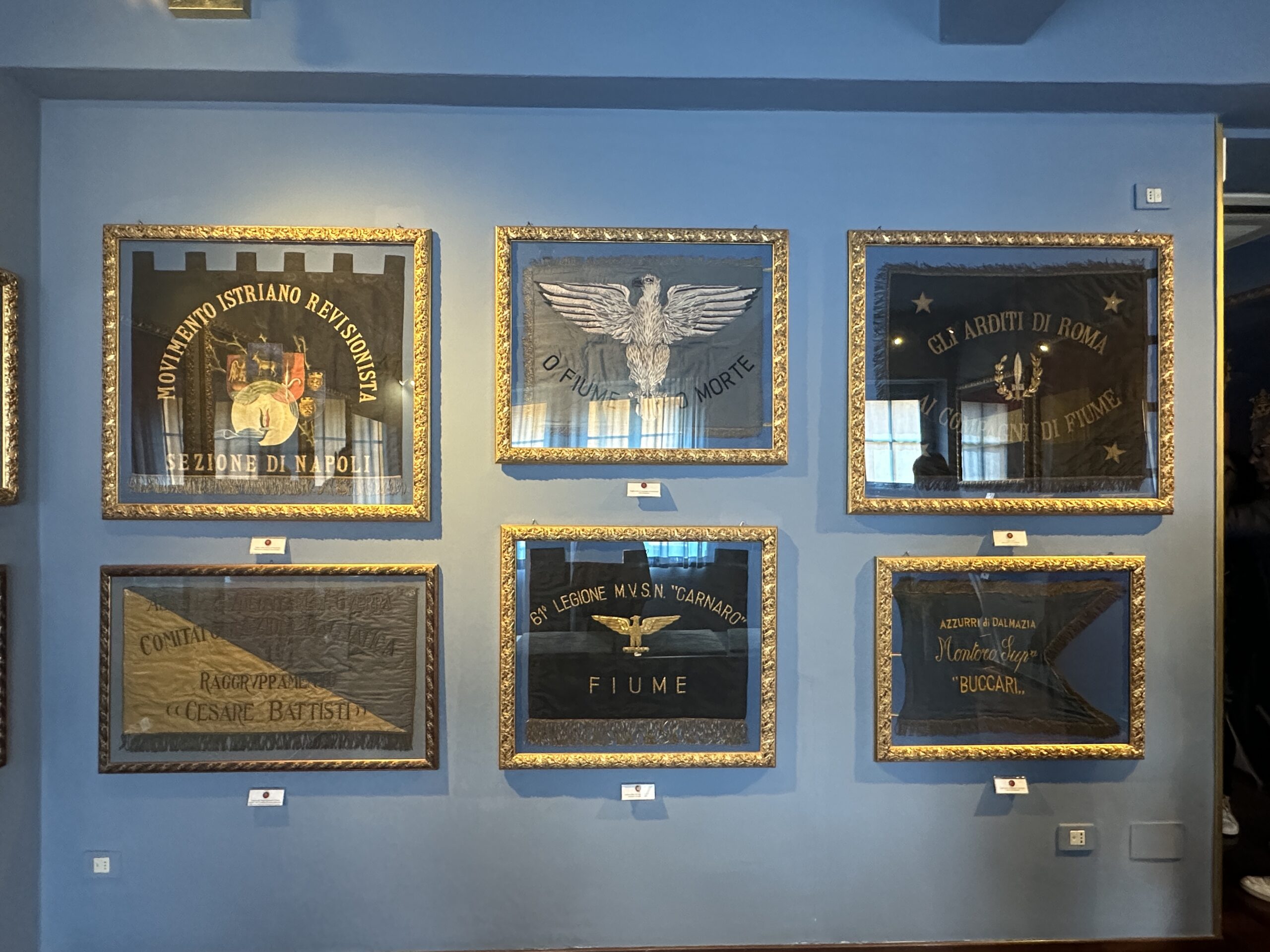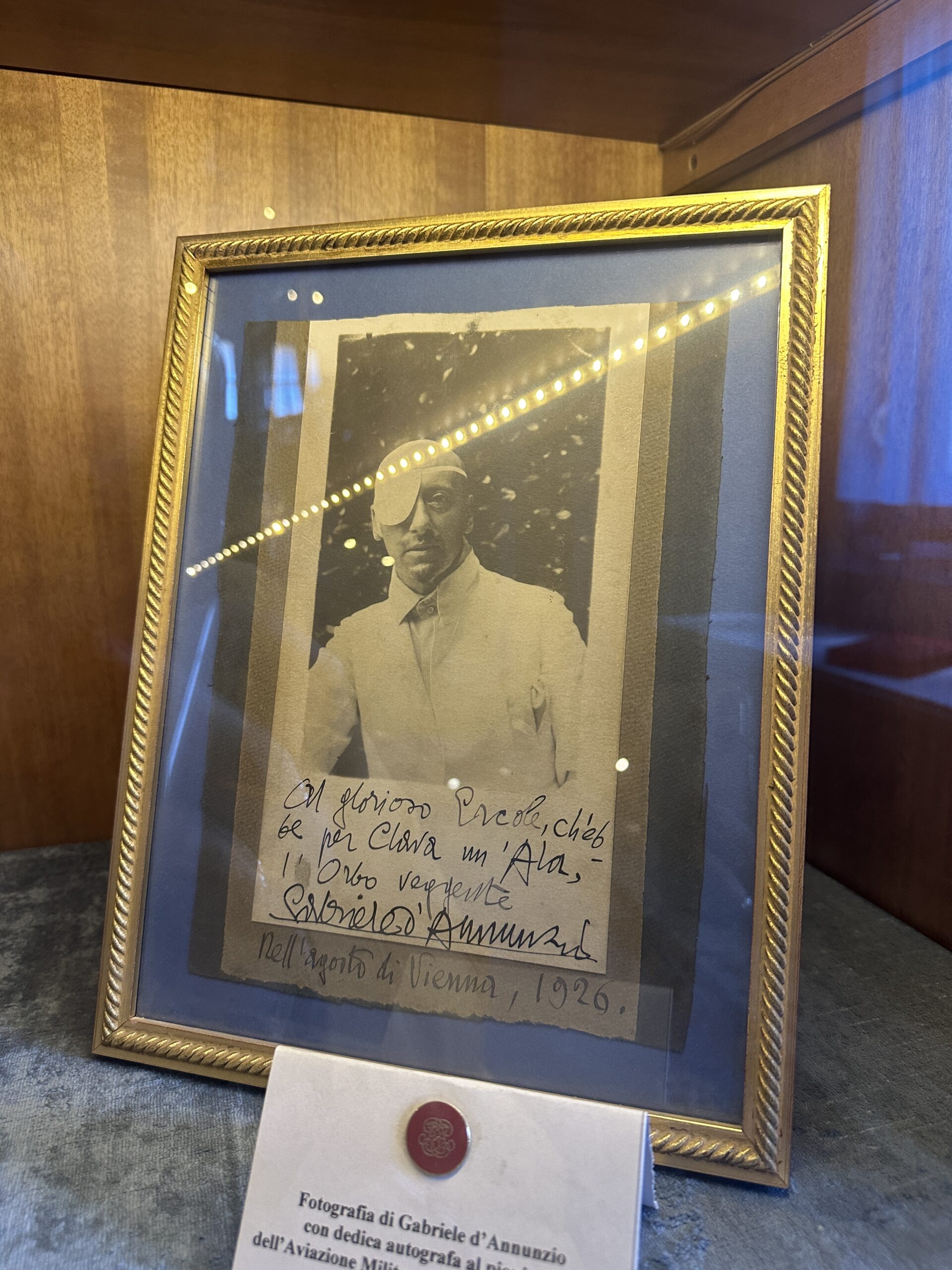 Su un soffitto campeggia la grande bandiera di fiume con il serpente che si morde la coda e 7 stelle dell’Orsa Maggiore. Una moltitudine di statue di santi, i volantini lanciati su Vienna nella prima guerra mondiale, un’enorme cucina munita di frigorifero e ghiacciaia, le stanze della servitù ed il calco del volto di Michelangelo (di cui lui si riteneva parente).