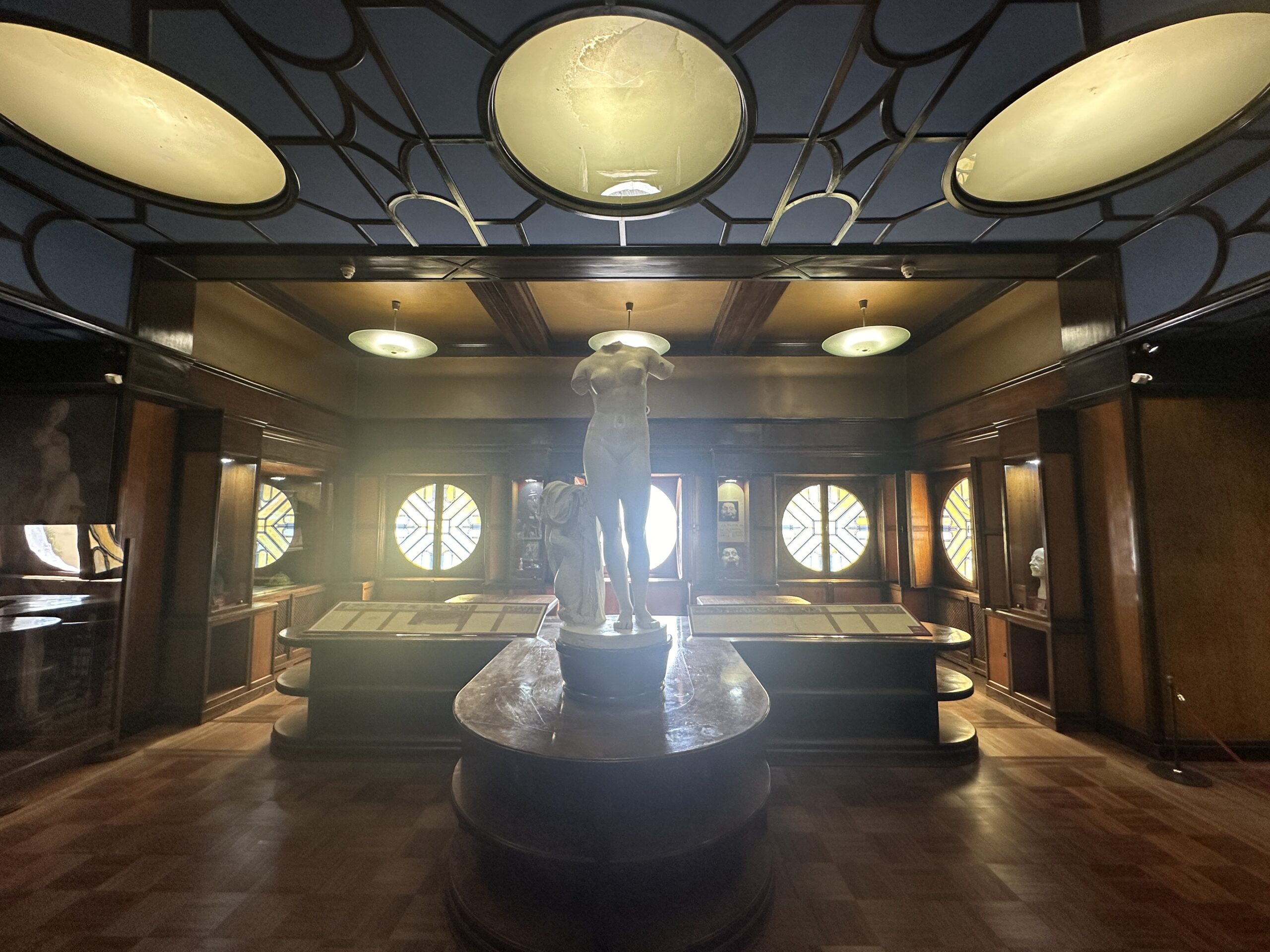 Nella libreria, che ospita più di 33 mila volumi originali, c’è un enorme mappamondo che vorrei far roteare. I libri sono consultabili, non qui, non ora, ma fanno parte del circuito bibliotecario e per motivi di studio possono essere presi in prestito. La libreria e le pareti in legno donano alla stanza un’atmosfera intellettualmente romantica.