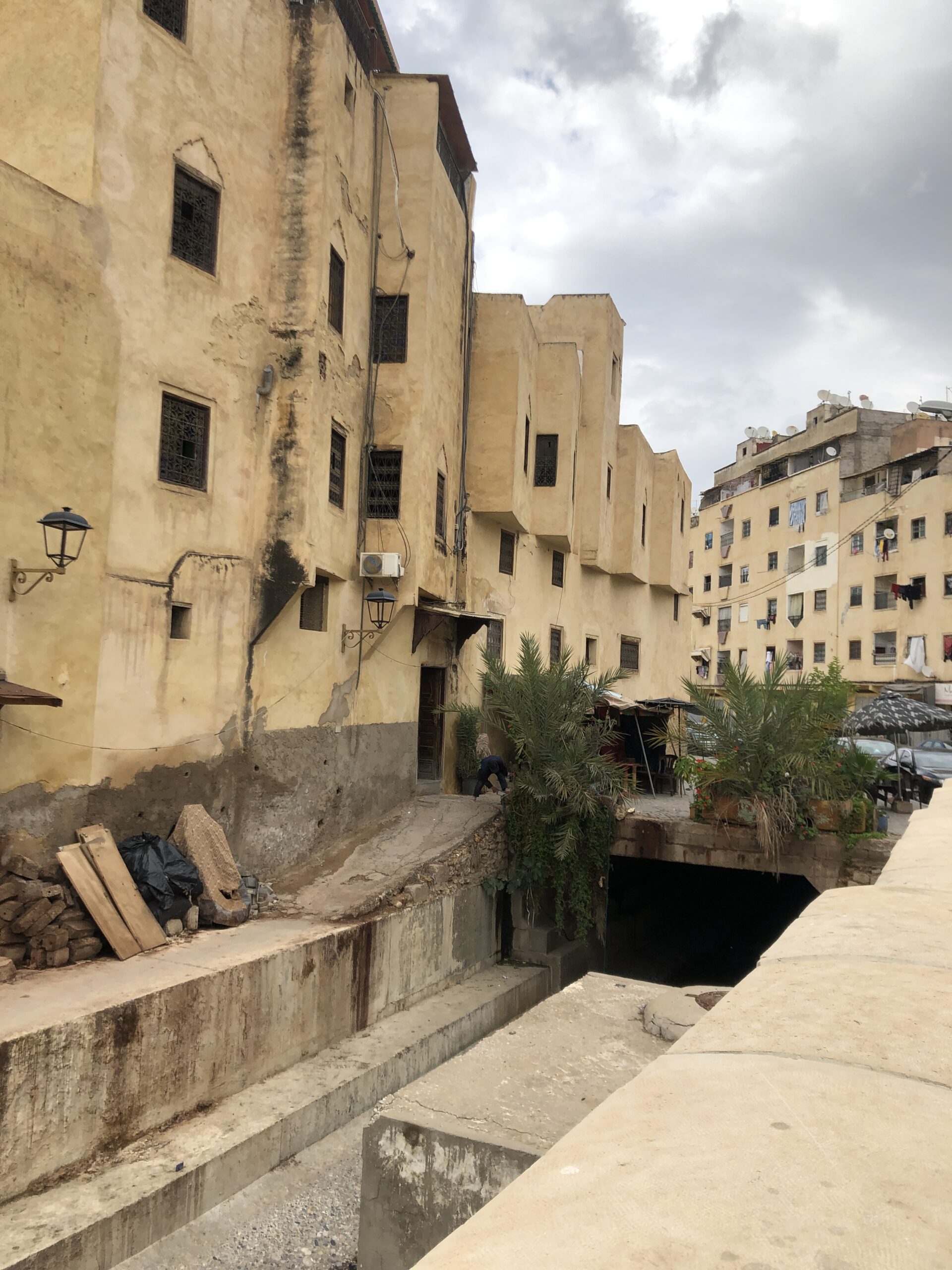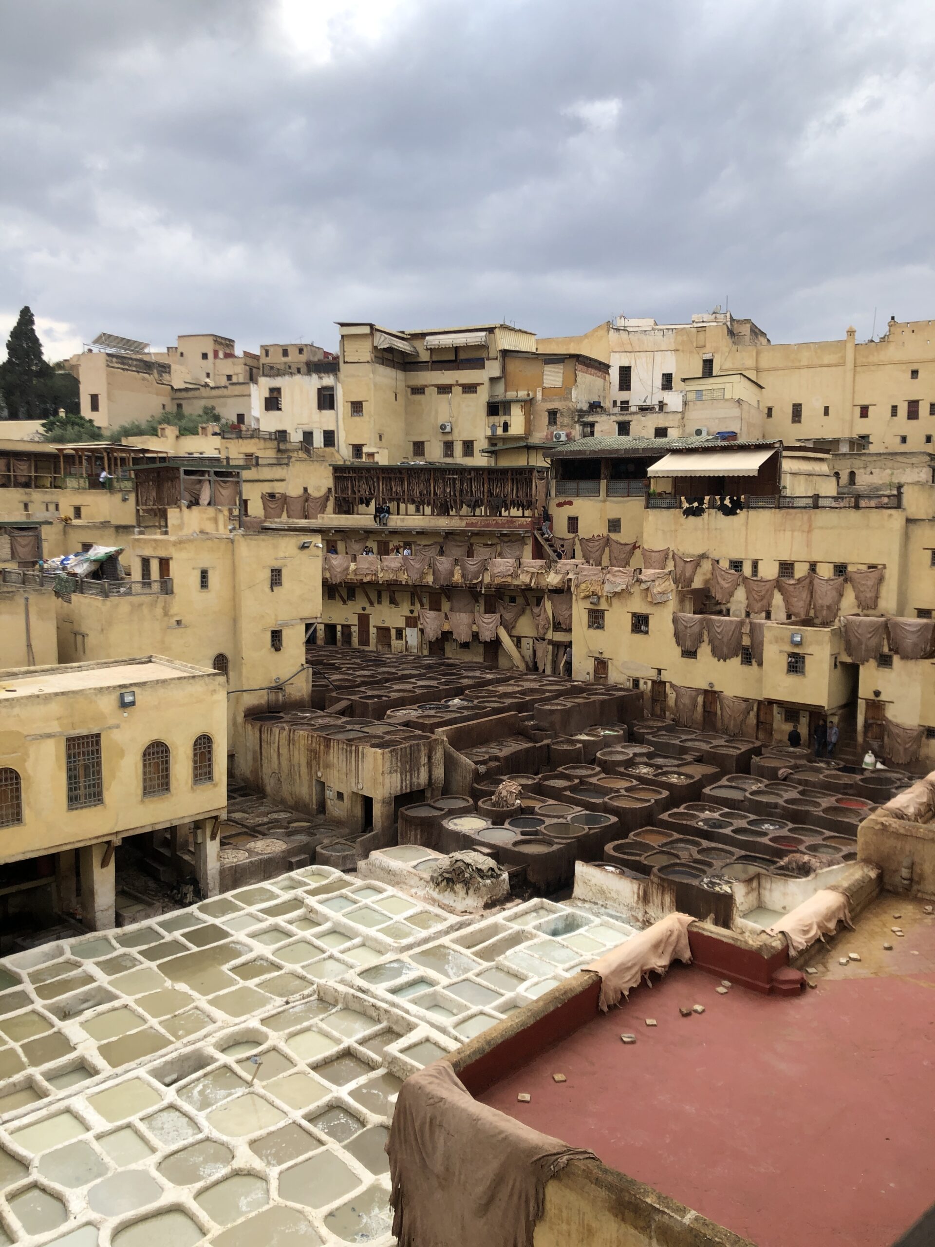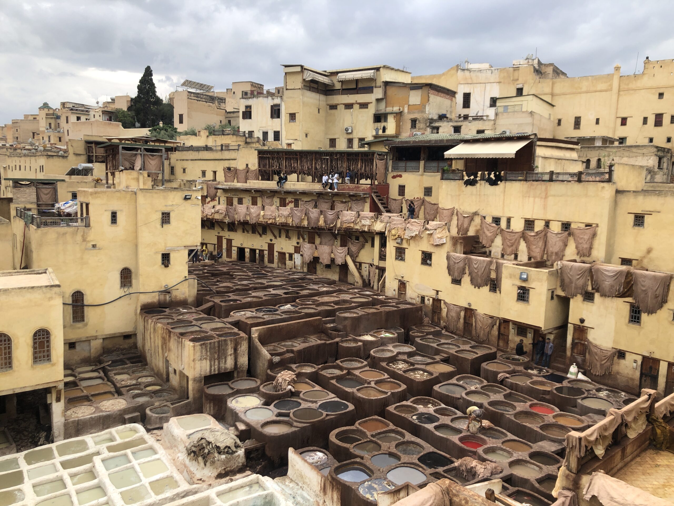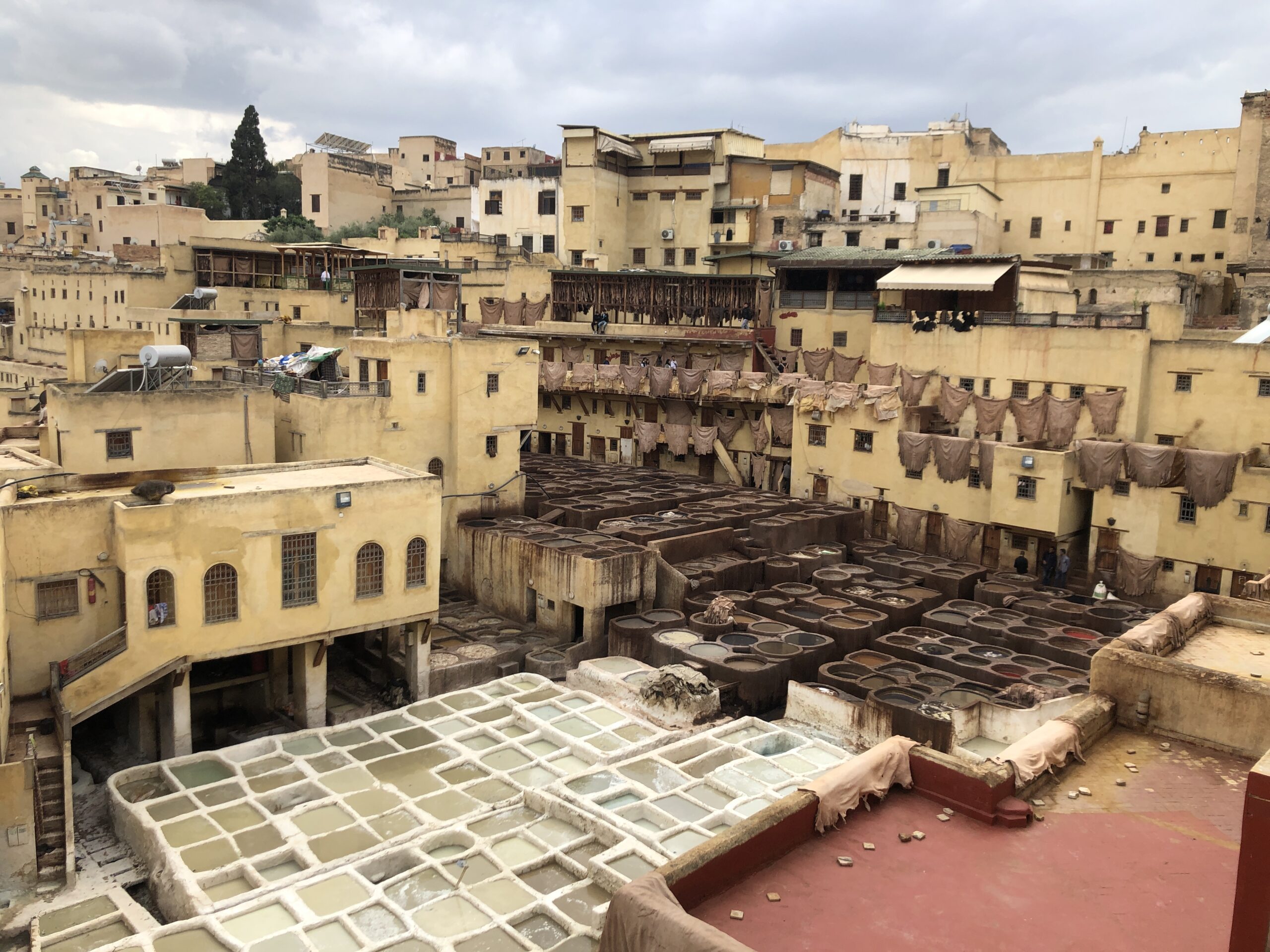 Il quartiere delle concerie è formato da palazzi squadrati color sabbia con piccole fessure che appaiono scure da distante. Le finestre sono di modeste dimensioni per ostacolare il calore del sole che s’insinua in casa quasi tutto l’anno. É un luogo la cui ricchezza culturale indiscussa l’ha fatta entrare a far parte del patrimonio UNESCO, qui vengono lavorati le pelli seguendo antiche tradizioni e proprio laggiù, nelle vasche alla mia destra, noto un uomo completamente immerso sino alla cintola in questo nauseabondo liquido colorato, con fatica e dimestichezza immerge e sbatte lunghi lembi di pellame. A mani nude, senza alcuna protezione al viso o indumenti di lavoro.